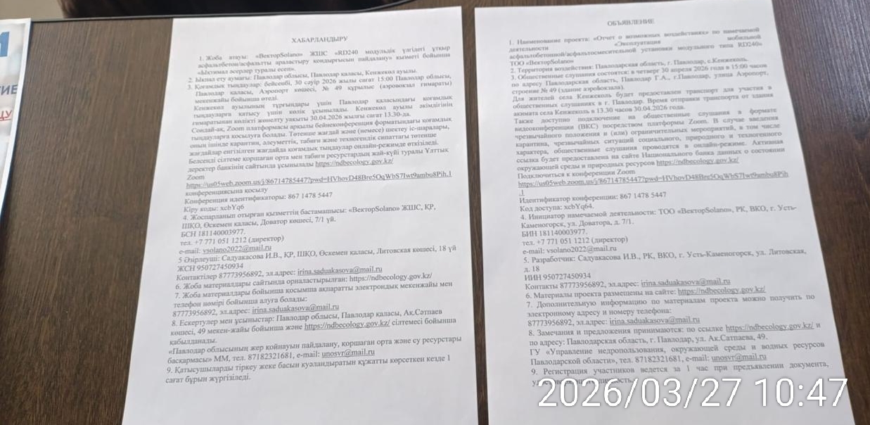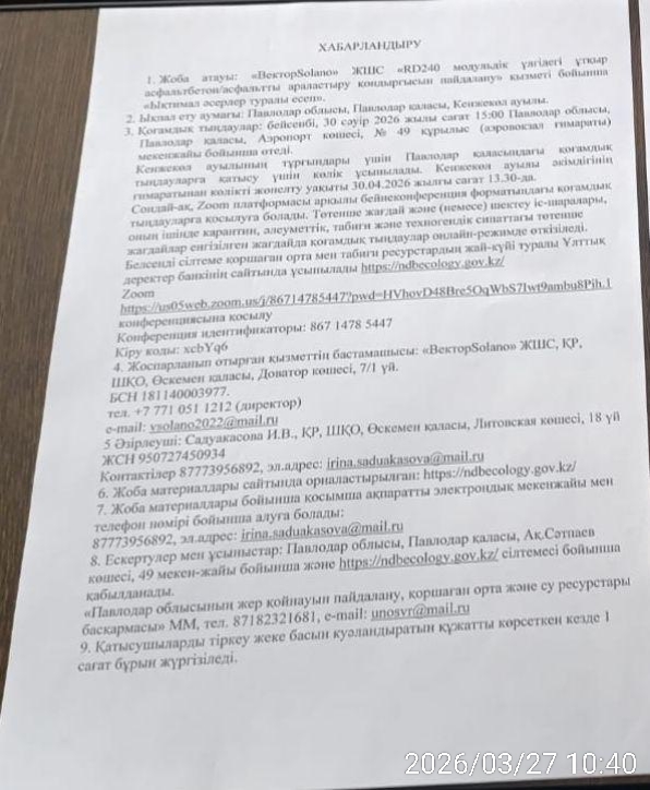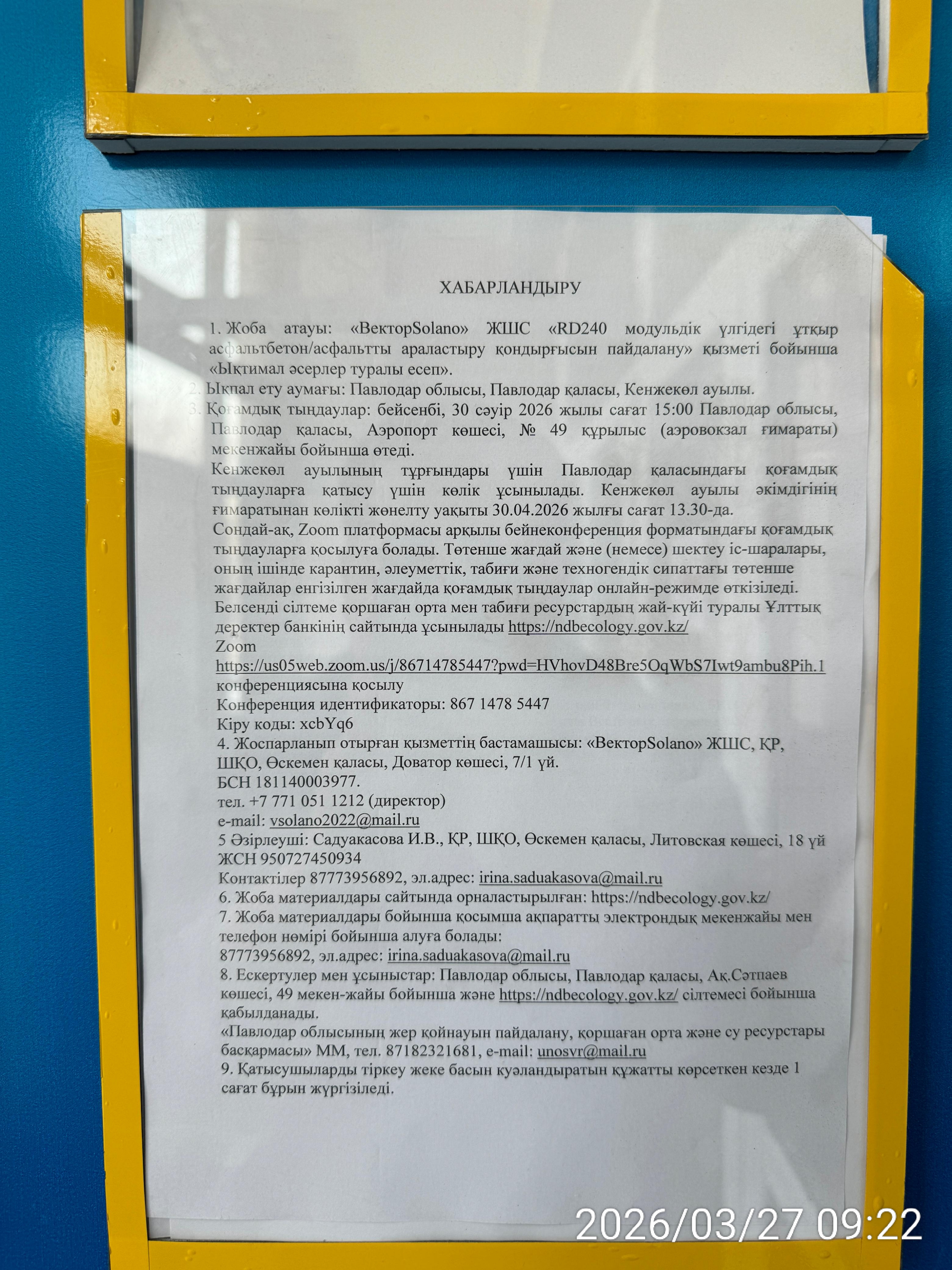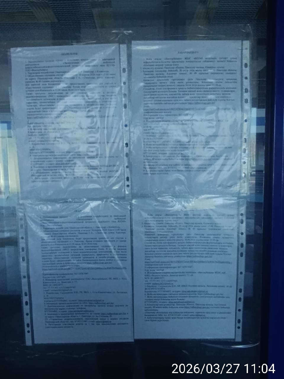 1.2. Место проведения: Павлодарская область, Павлодар Г.А., г.Павлодар, улица Аэропорт, строение № 49 (здание аэровокзала). Для жителей села Кенжеколь будет предоставлен транспорт для участия в общественных слушаниях в г. Павлодар. Время отправки транспорта от здания акимата села Кенжеколь в 13.30 часов 30.04.2026 года.