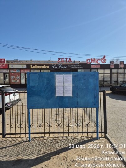 6.3. расположение мест, специально предназначенных для Размещения печатных объявлений (доски объявлений): Доски объявлений: в c. Майкомген по адресу: ул. Айнымас, 74, здание акимата Макомгенского с.о.; в городе Кульсары: пр.Махамбета Утемисова возле супермаркета "Лидер" и ул. Исатая Тайманова рынок "Беркат"