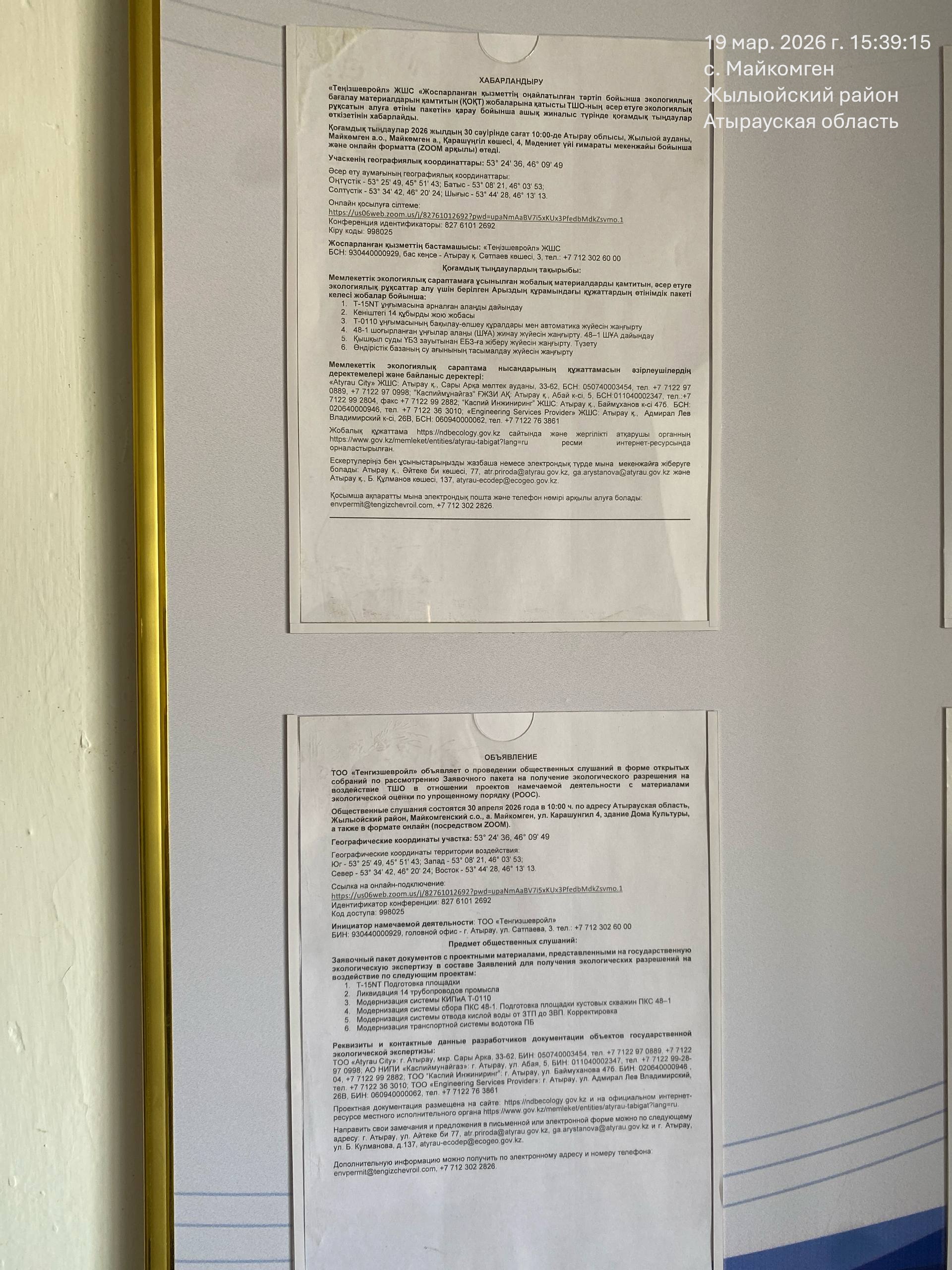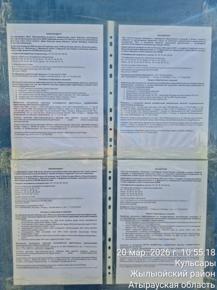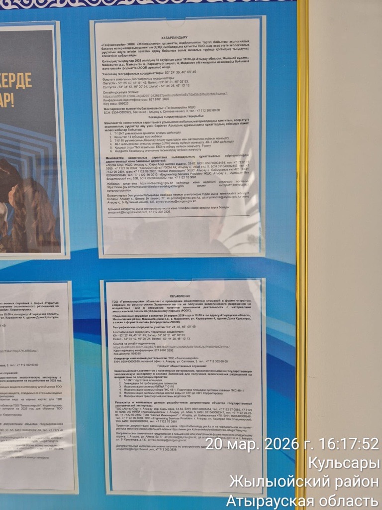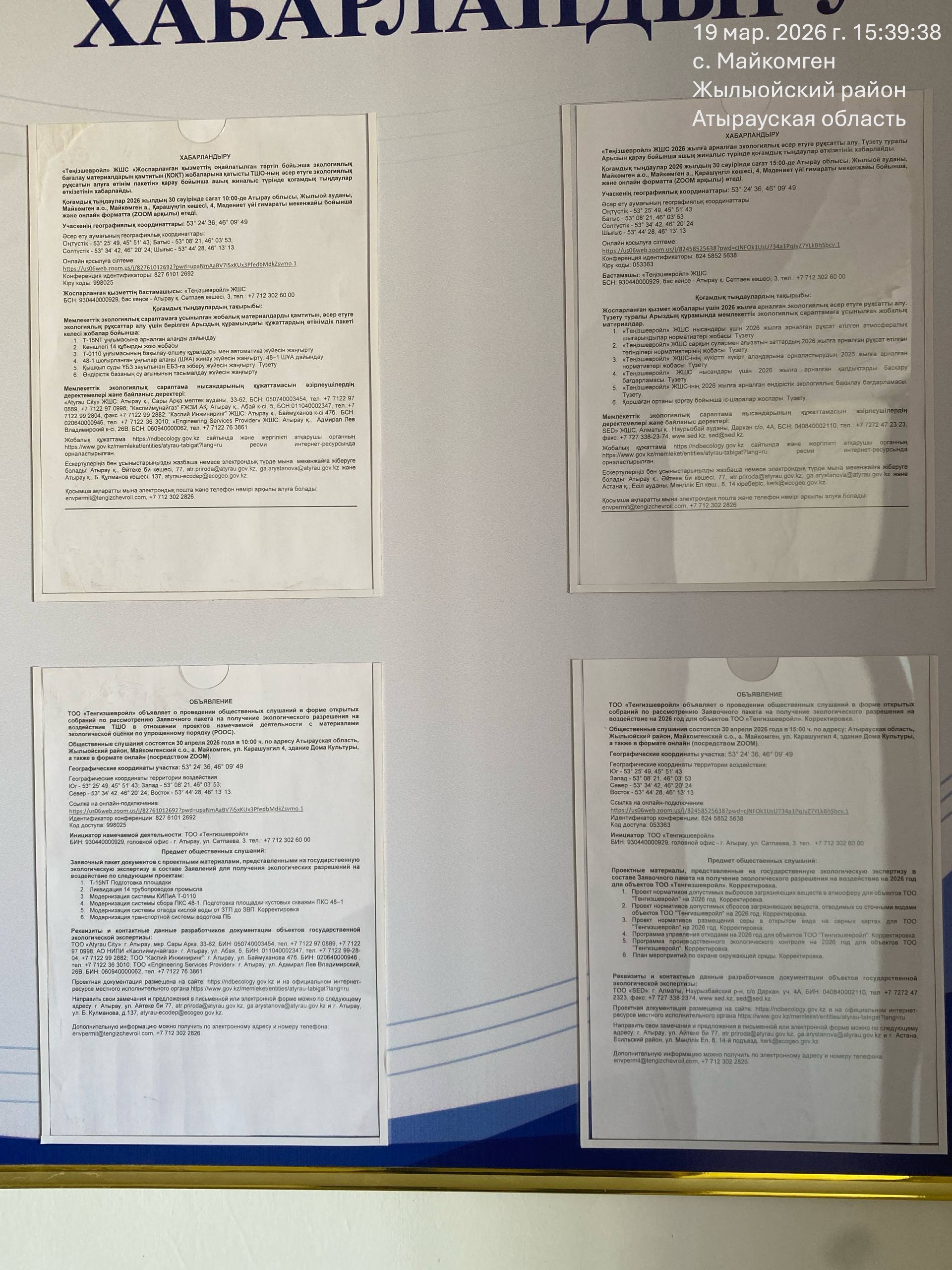 3. Общественные слушания организованны: Управление природных ресурсов и регулирования природопользования Атырауской области, atr.priroda@atyrau.gov.kz,