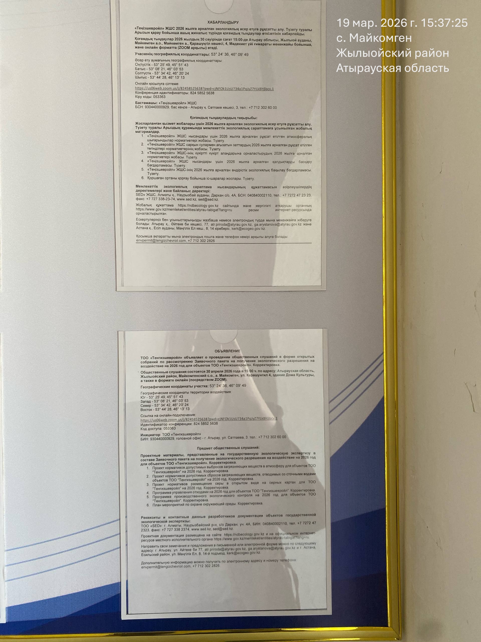 3. Общественные слушания организованны: Управление природных ресурсов и регулирования природопользования Атырауской области, atr.priroda@atyrau.gov.kz,