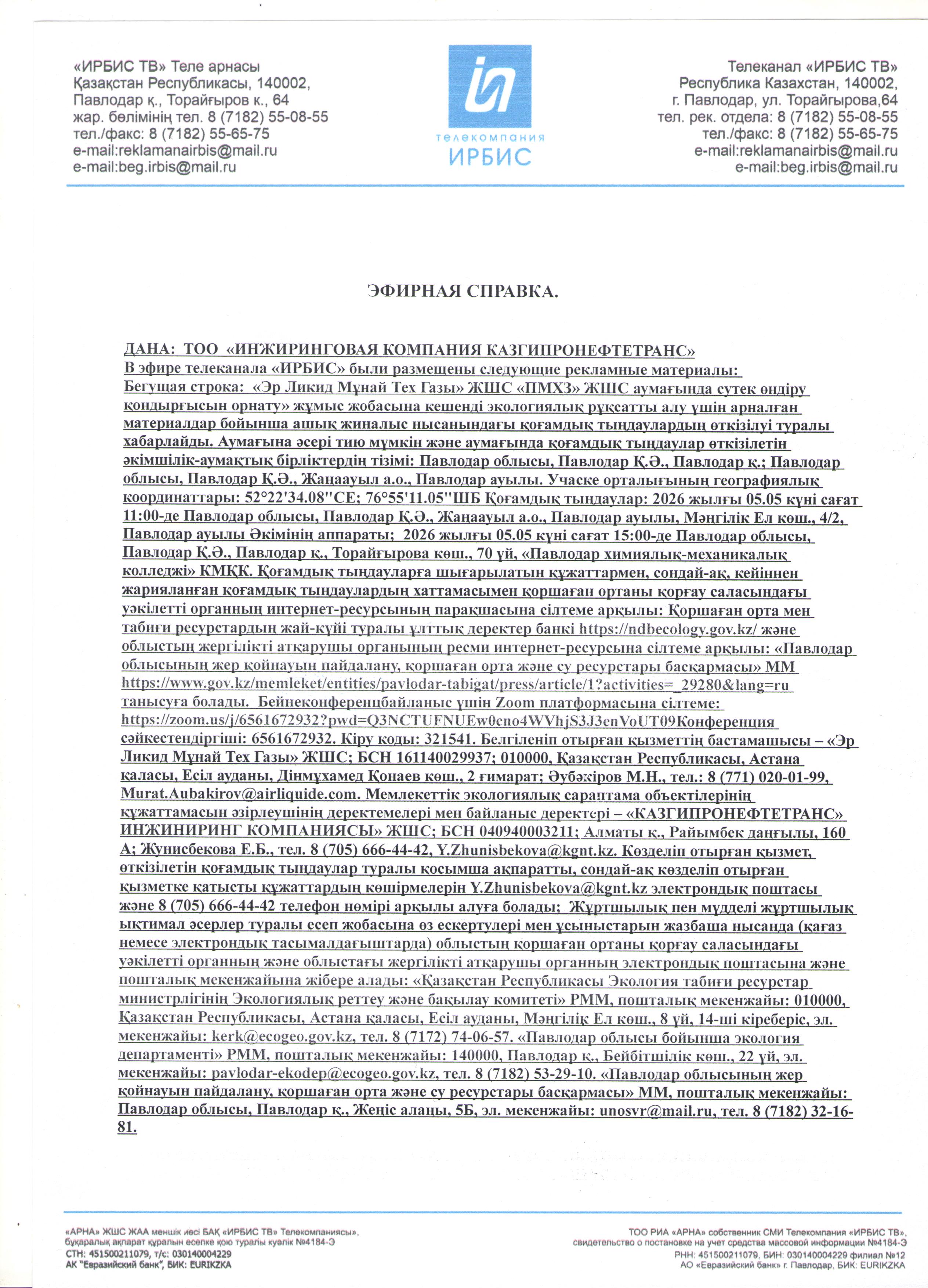 3. Общественные слушания организованны: УПРАВЛЕНИЕ НЕДРОПОЛЬЗОВАНИЯ, ОКРУЖАЮЩЕЙ СРЕДЫ И ВОДНЫХ РЕСУРСОВ ПАВЛОДАРСКОЙ ОБЛАСТИ, unosvr@mail.ru, 87182321681,