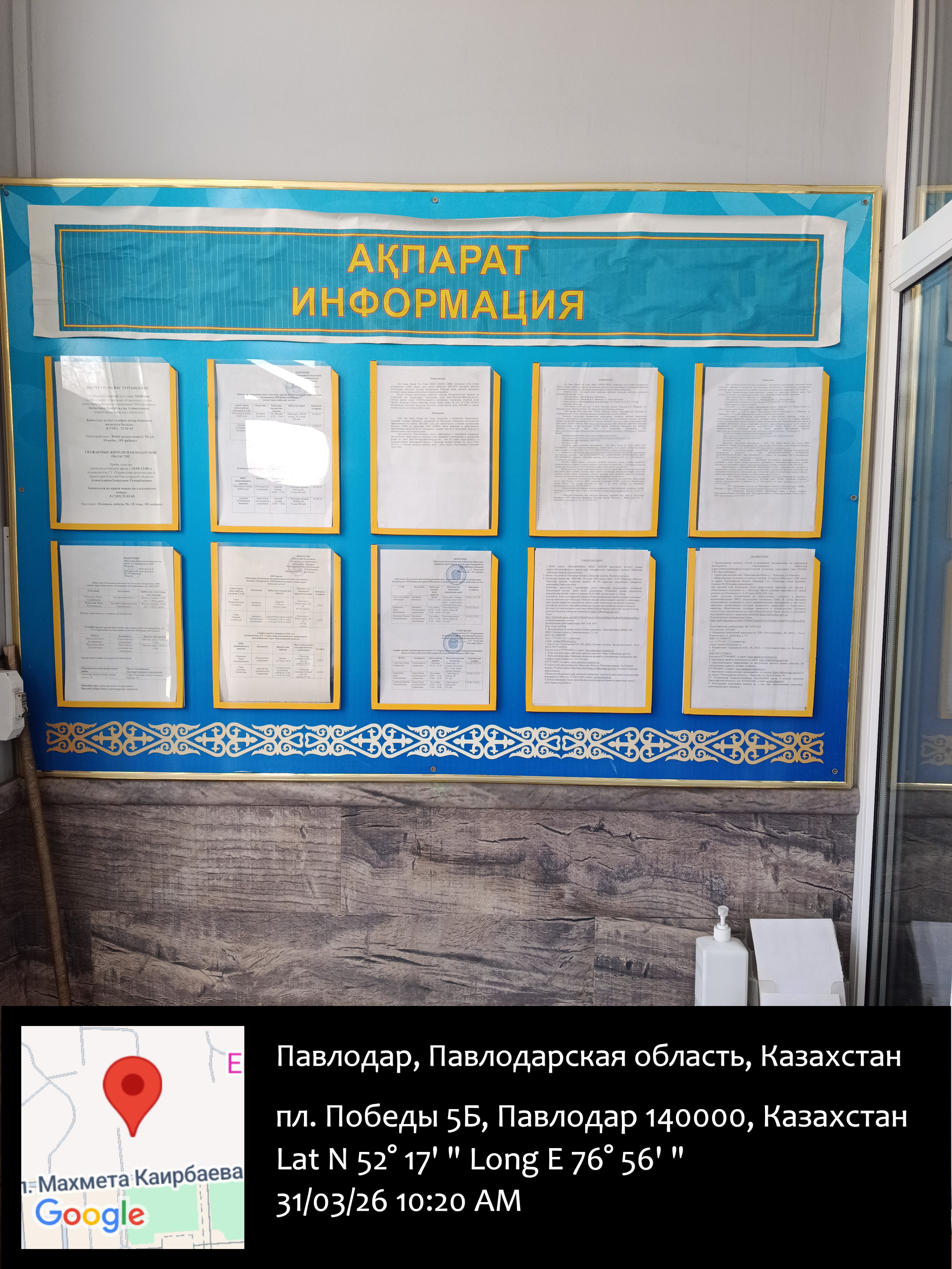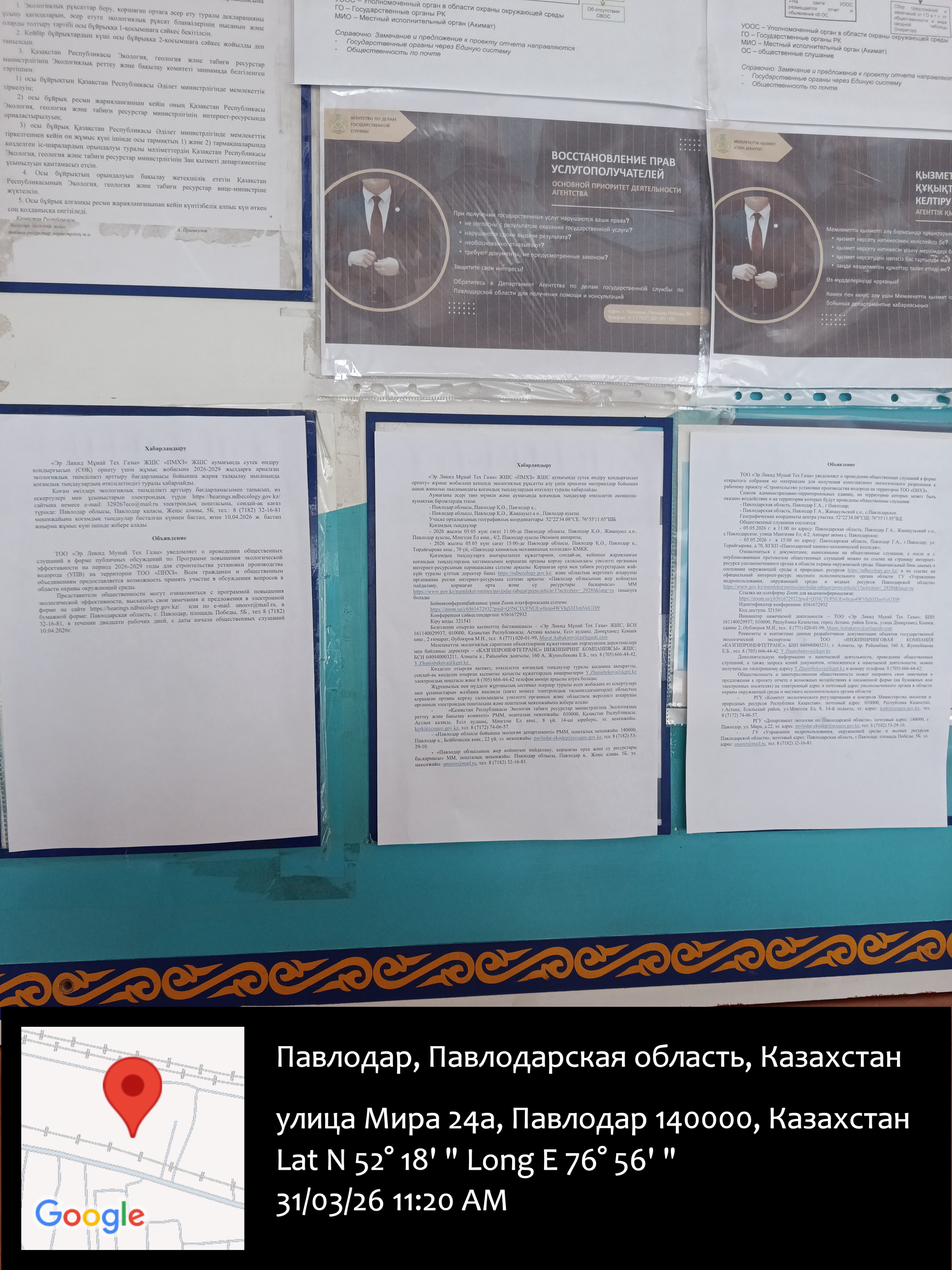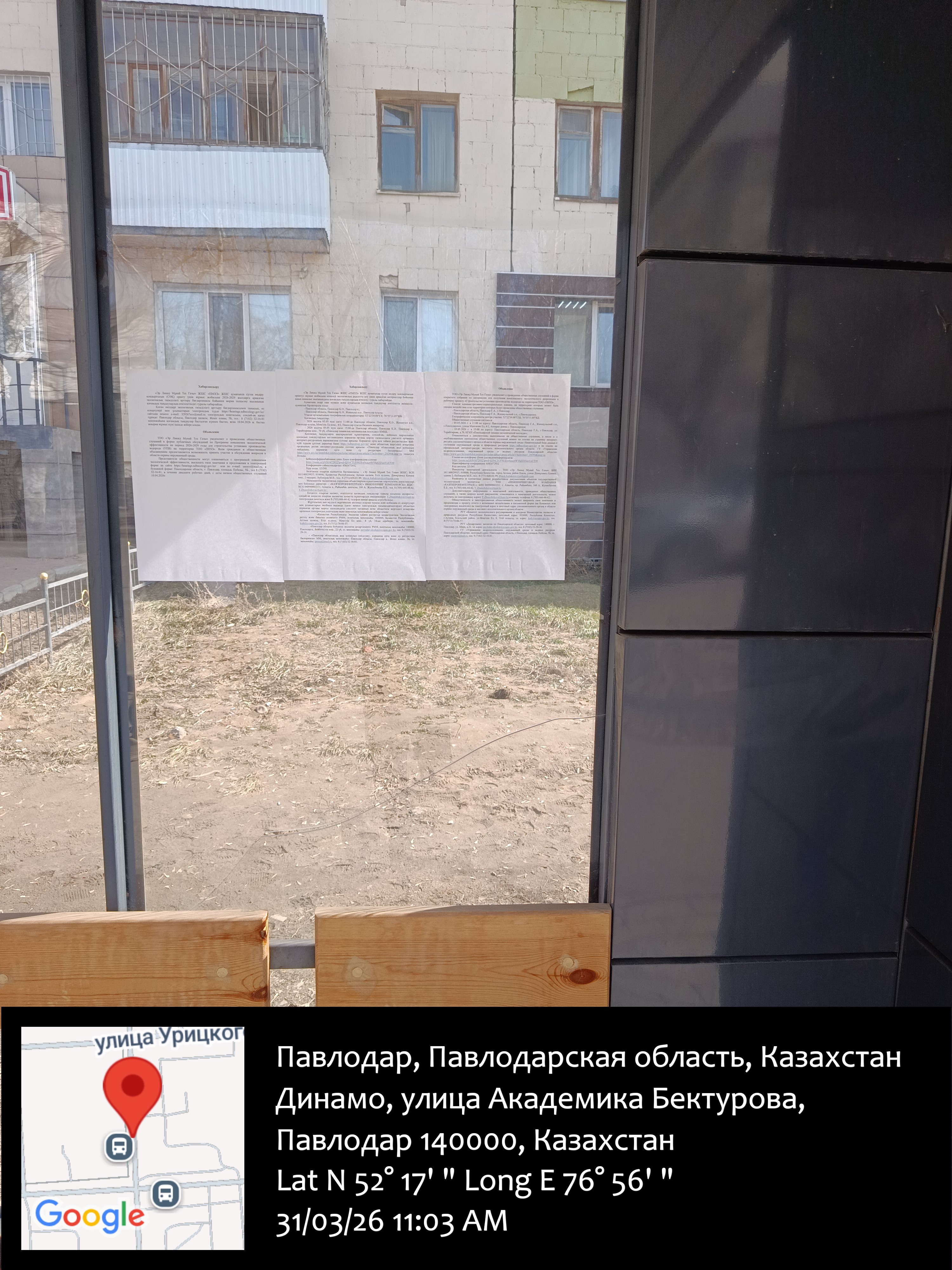 6.3. расположение мест, специально предназначенных для Размещения печатных объявлений (доски объявлений): Управление недропользования, Департамент экологии, остановка