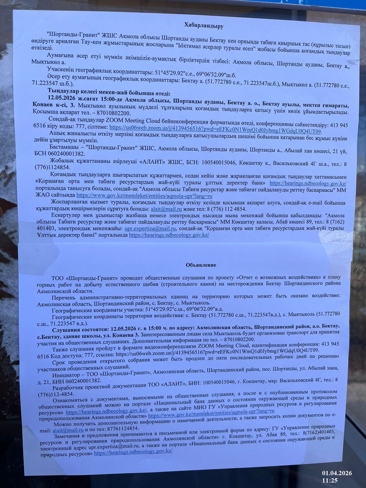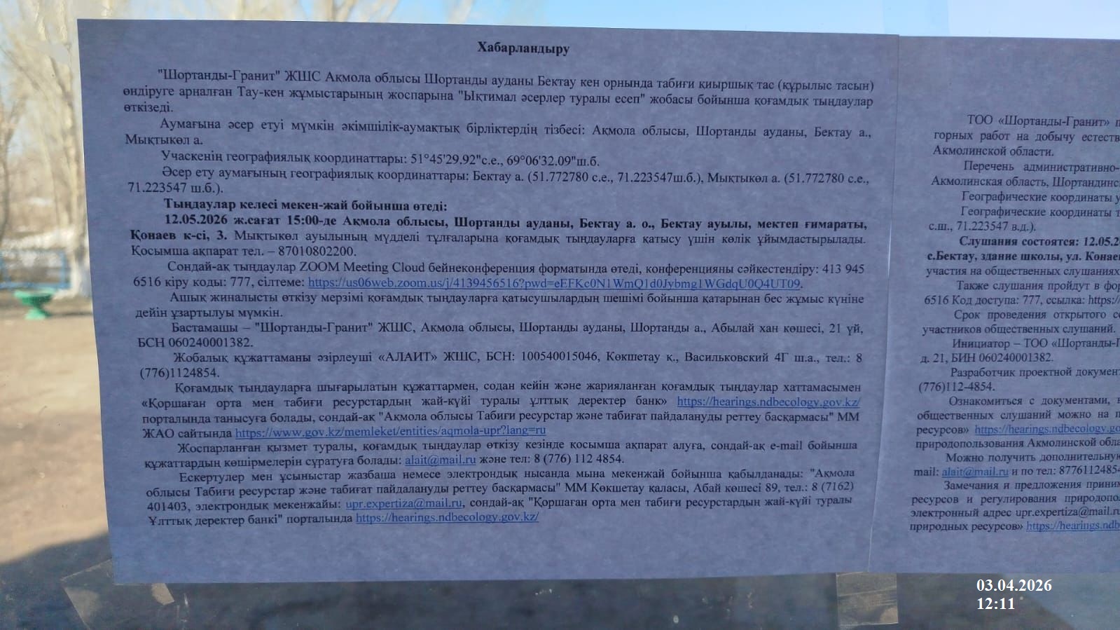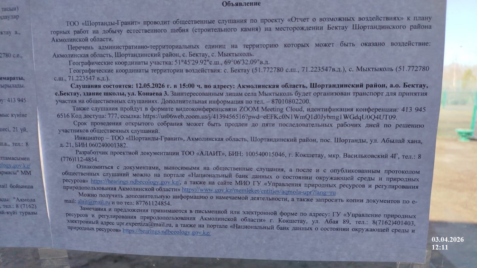 4. Повестка дня общественных слушаний: План горных работ составлен на основании решения ГУ «Управление предпринимательства и промышленности Акмолинской области»: - о выдаче ТОО «Шортанды-Гранит» разрешения на внесение изменений в рабочую программу в части продления срока действия контракта на 10 лет и корректировки объемов добычи естественного щебня по годам в следующем виде: 2026-2031гг: со 150,0тыс.м3 до 50,0тыс.м3; 2032-2040гг: 50,0тыс.м3; 2041г: 969,0тыс.м3. Контракт между ГУ «Управлением предпринимательства и промышленности Акмолинской области» и ТОО «Шортанды-Гранит» на право недропользования для проведения работ по совмещенной разведке и добыче естественного щебня на месторождении Бектау Шортандинского района заключен 29.09.2006г. (peг.№203). Отработка месторождения будет производиться в контурах горного отвода выданного ГУ «Северо-Казахстанский межрегиональный департамент геологии и недропользования «Севказнедра», акт удостоверяющий горный отвод №608 от 18.08.2017г. Балансовые запасы естественного щебня утверждены Центрально-Казахстанским территориальным отделением Государственной комиссии по запасам полезных ископаемых Республики Казахстан по категории С1+С2 – 3066,3тыс.м3, в том числе по категории С1 – 742,9тыс.м3, протокол №1066-з от 11.07.2007г. Согласно отчетности по балансовым запасам за 2025 год (форма 2-ОПИ) запасы месторождения по состоянию на 01.01.2026г составляют – 1736,4тыс.м3. Месторождение Бектау расположено в Шортандинской районе Акмолинской области, в 10км к северо-востоку от пос.Шортанды и в 70км к северу от города Астана. Ближайший населенный пункт: - с.Мыктыколь, расположенное в 3,5км северо-западнее участка; - с.Бектау, расположенное в 6,9км восточнее участка.