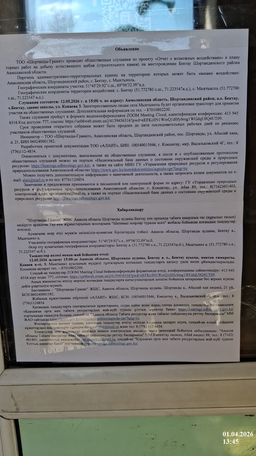 1.2. Место проведения: Акмолинская область, Шортандинский район, а.о. Бектау, с.Бектау, здание школы, ул. Конаева 3. Заинтересованным лицам села Мыктыколь будет организован транспорт для принятия участия на общественных слушаниях. Дополнительная информация по тел. – 87010802200.