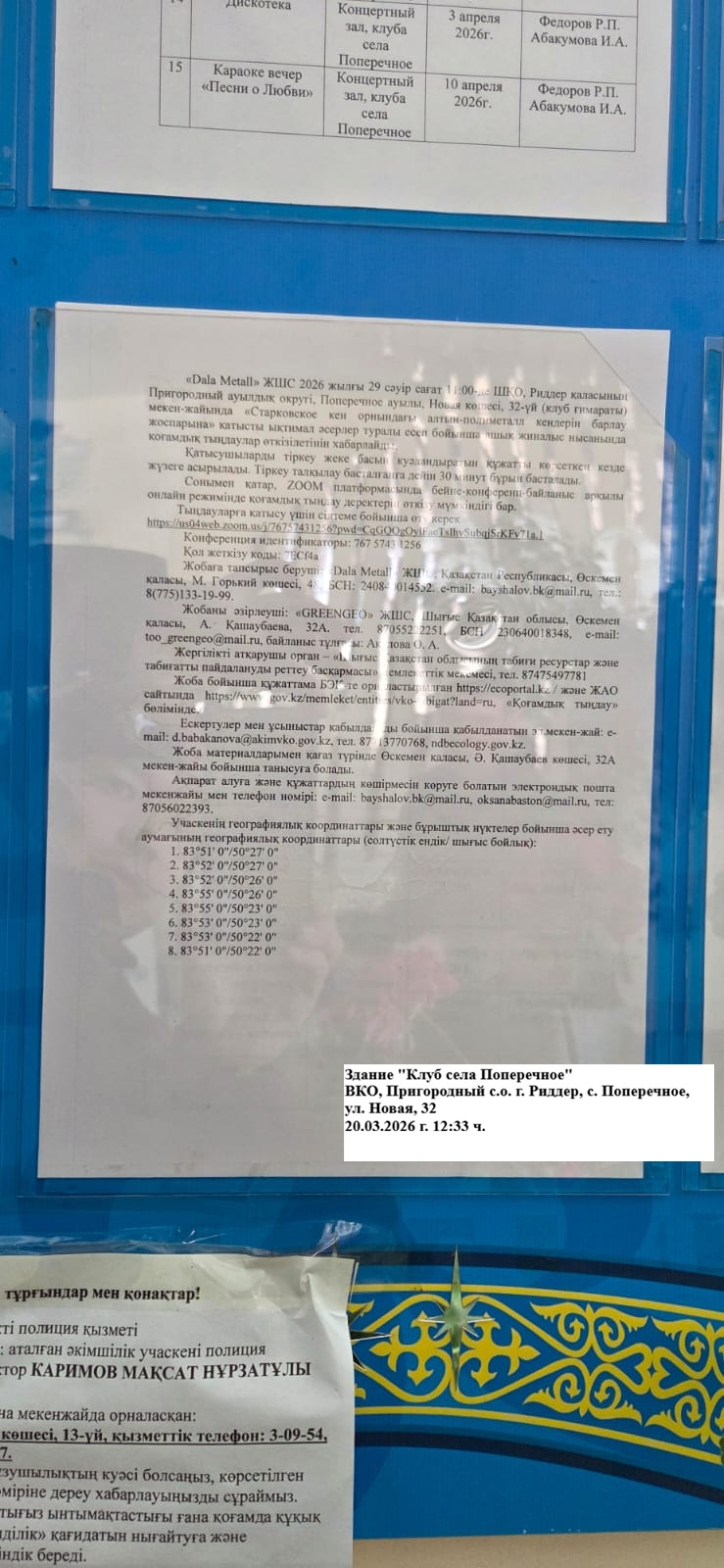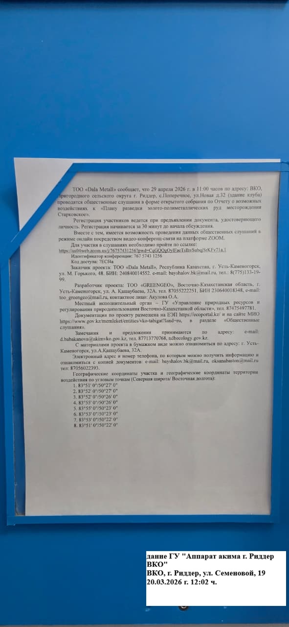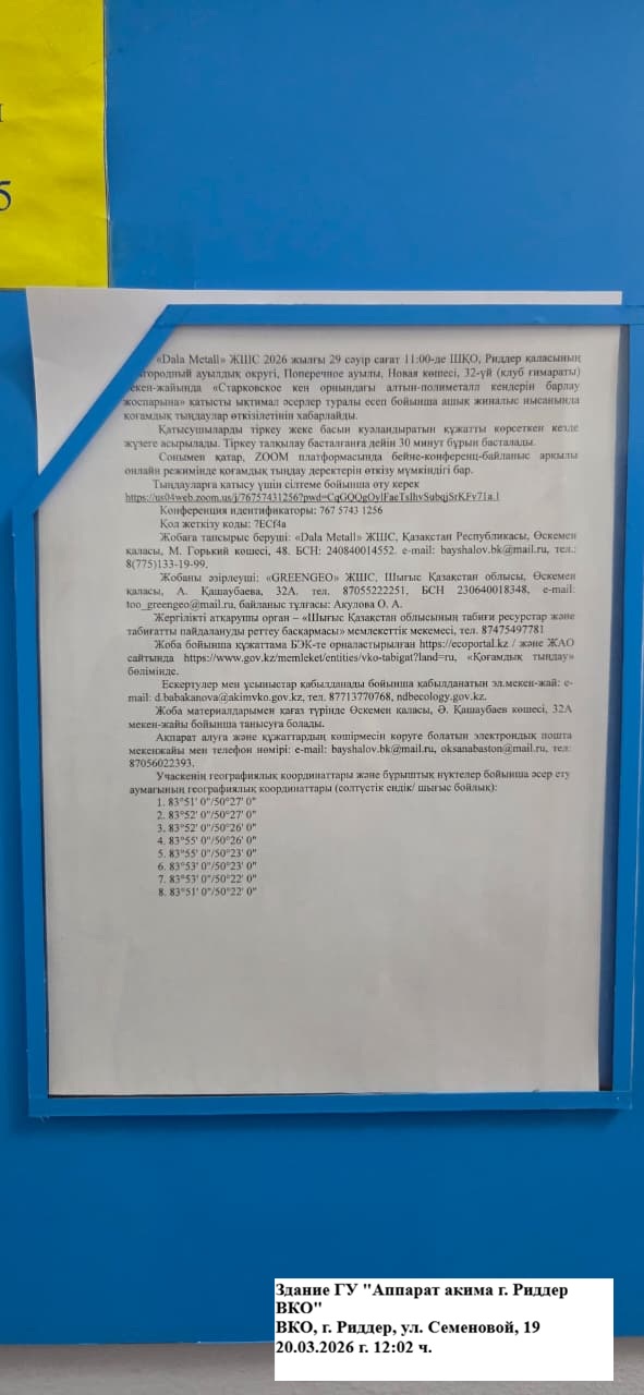 3. Общественные слушания организованны: Управление природных ресурсов и регулирования природопользования Восточно-Казахстанской области, d.babakanova@akimvko.gov.kz,