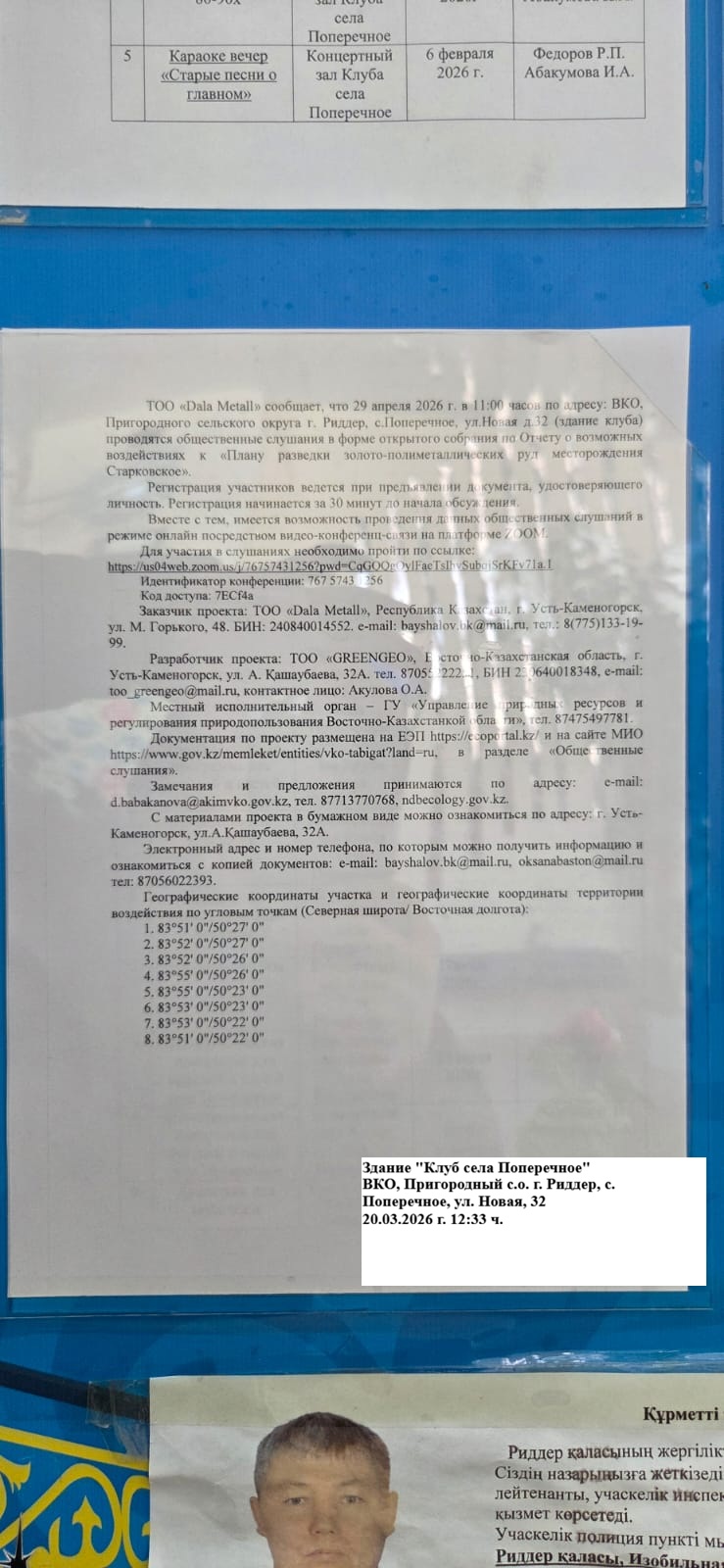 1.4. Описание для подключения к онлайн трансляции при прохождении общественного слушания: Ближайший населенный пункт от участка намечаемой деятельности с. Поперечное Пригородного с.о. г. Риддера, слушания будут проведены в режиме оффлайн в связи с отсутствием стабильного интернет-соединения в указанном населенном пункте.