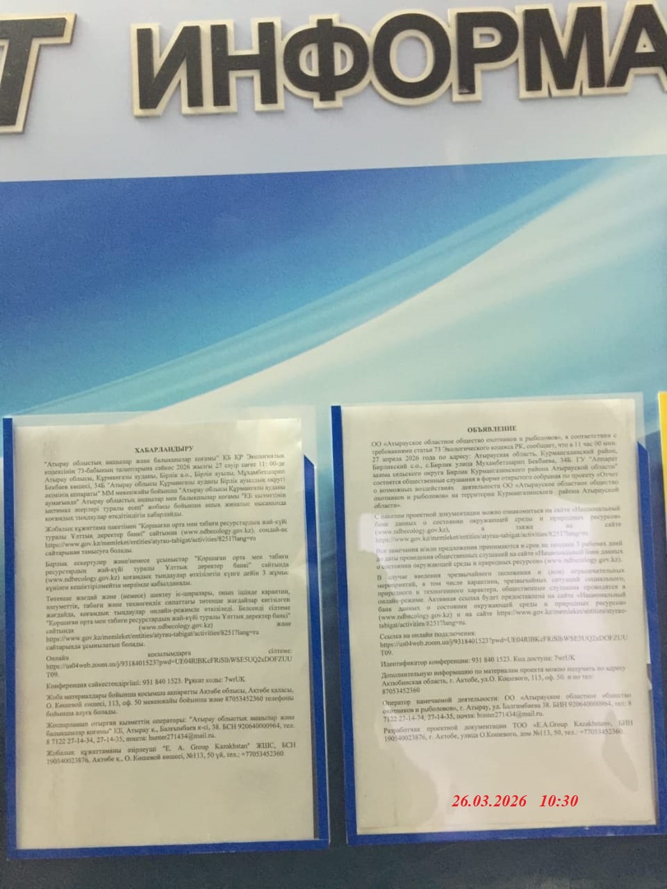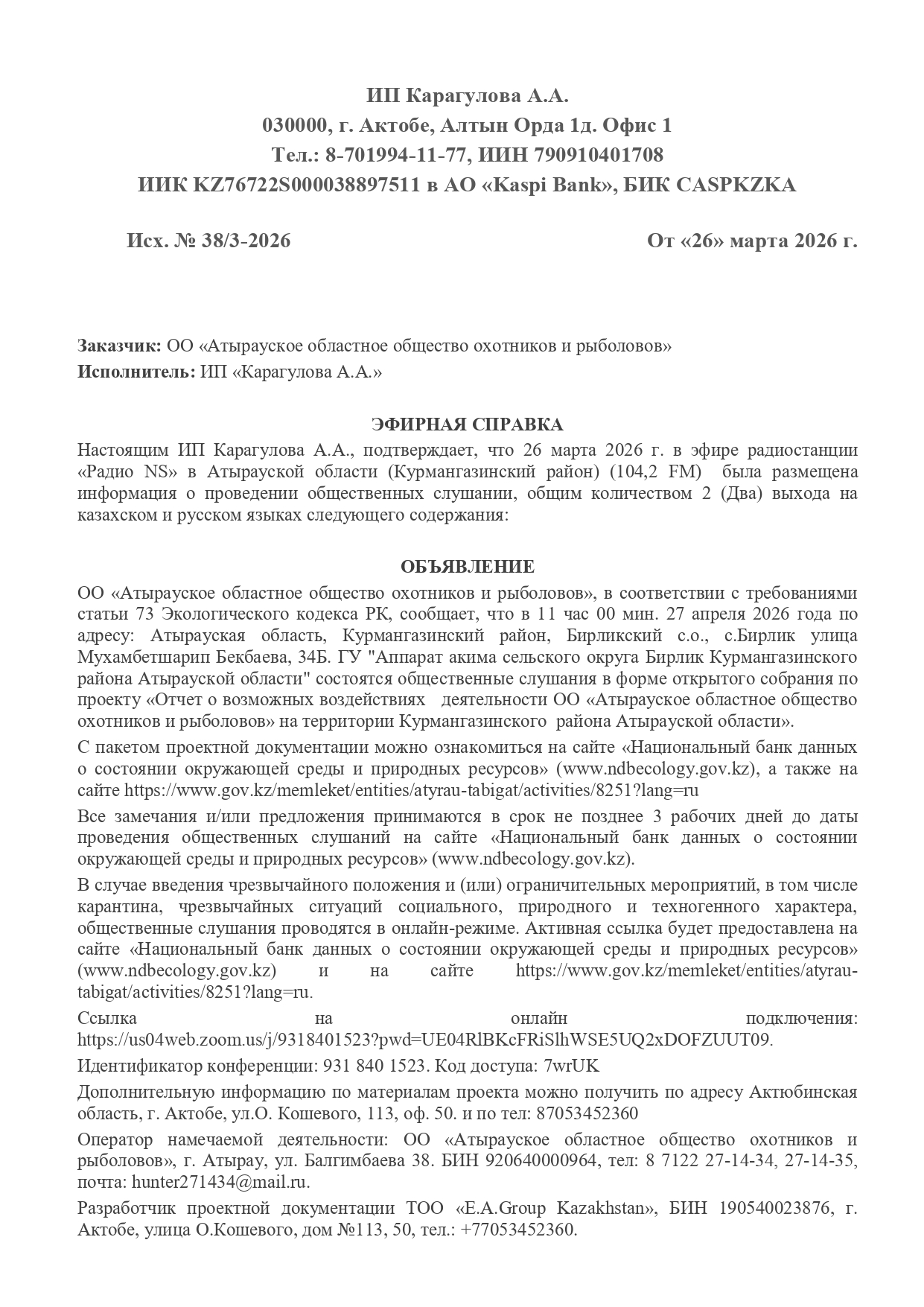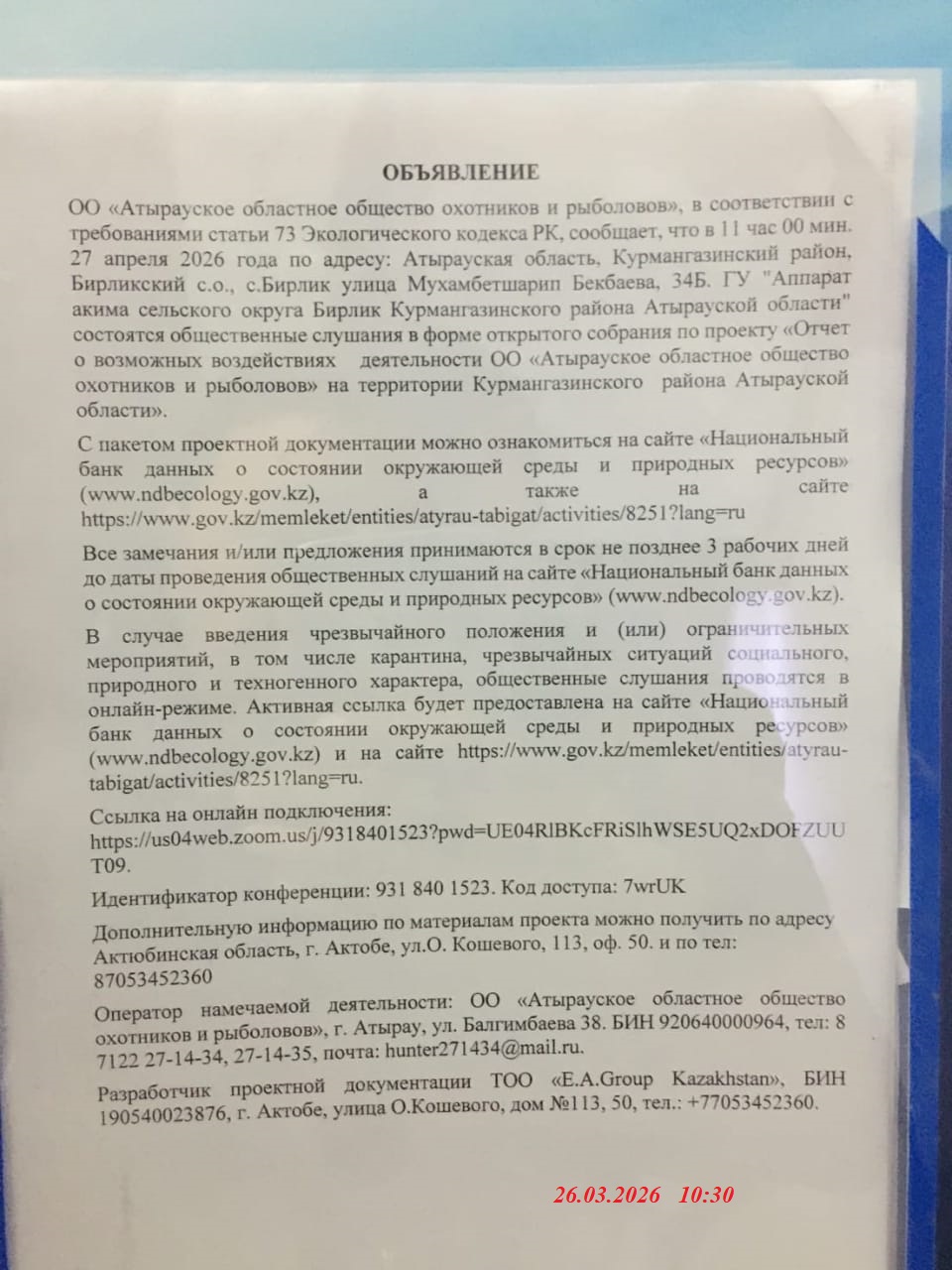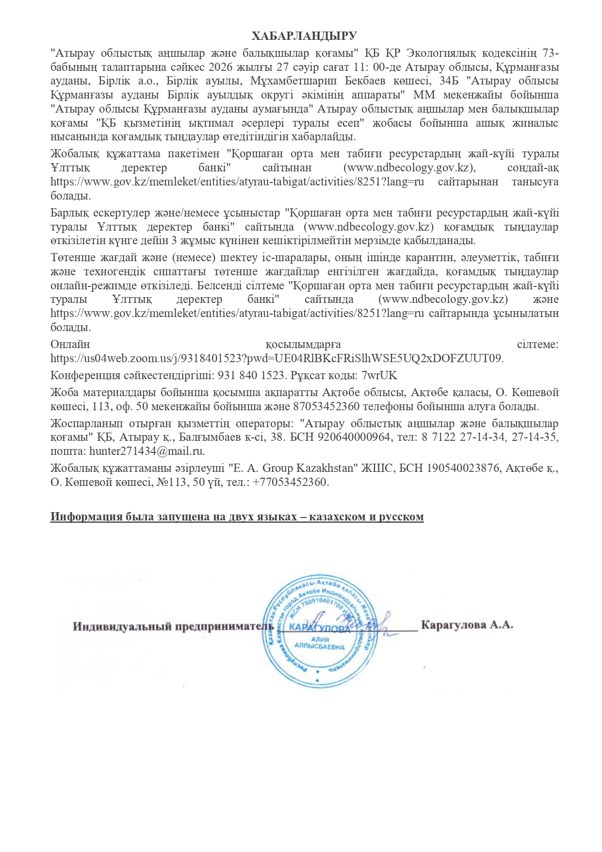 3. Общественные слушания организованны: Управление природных ресурсов и регулирования природопользования Атырауской области, atr.priroda@atyrau.gov.kz,