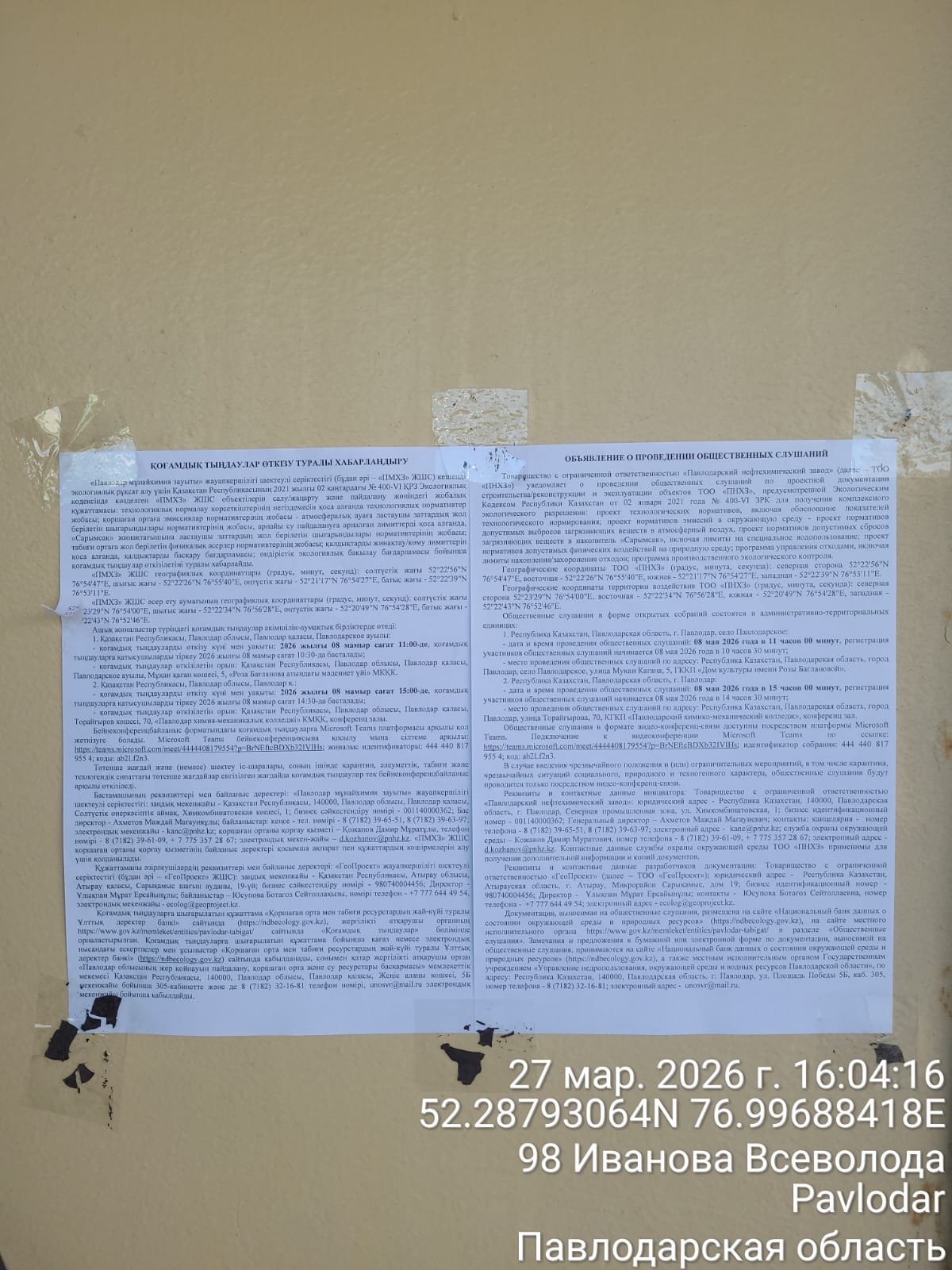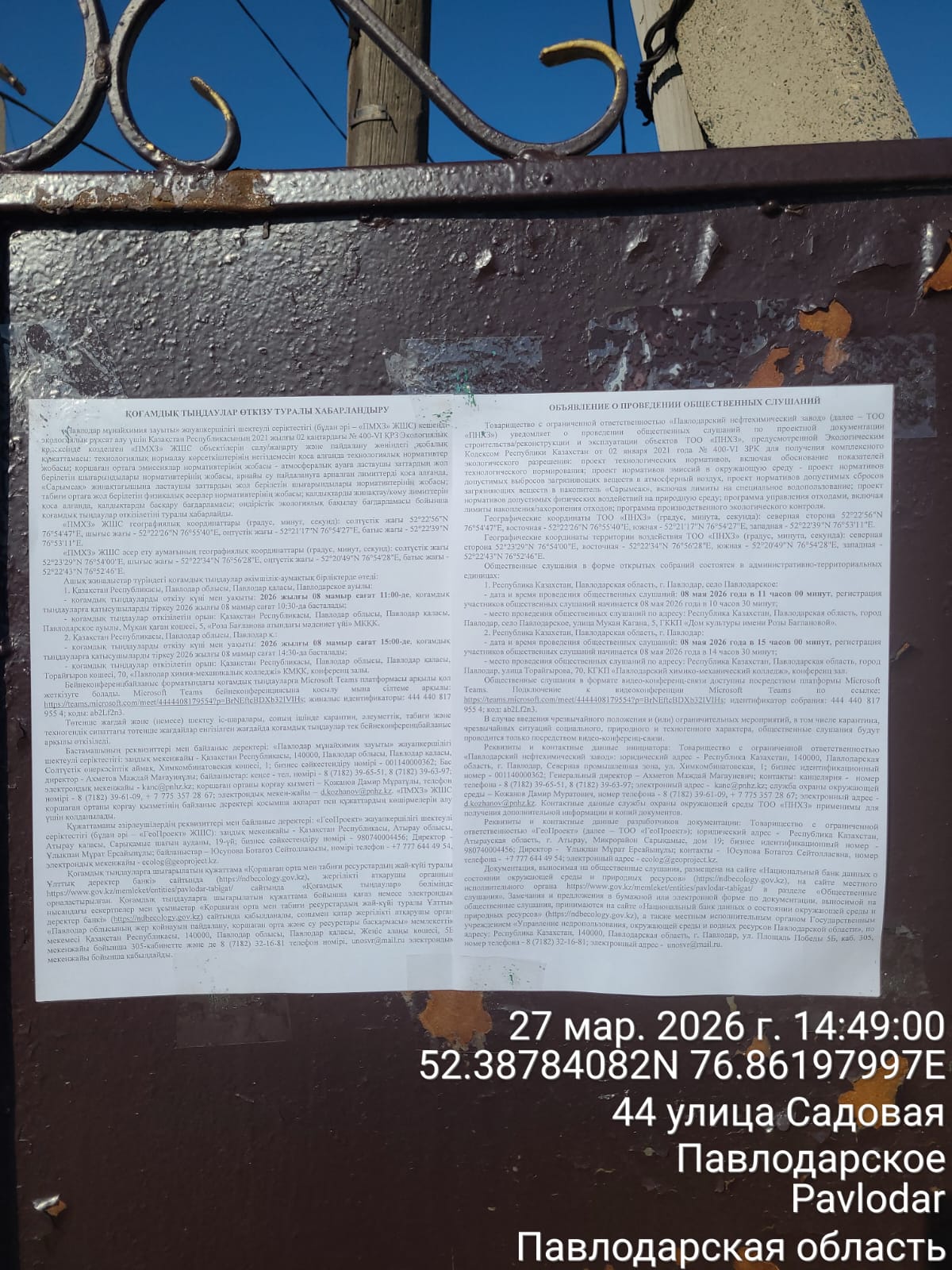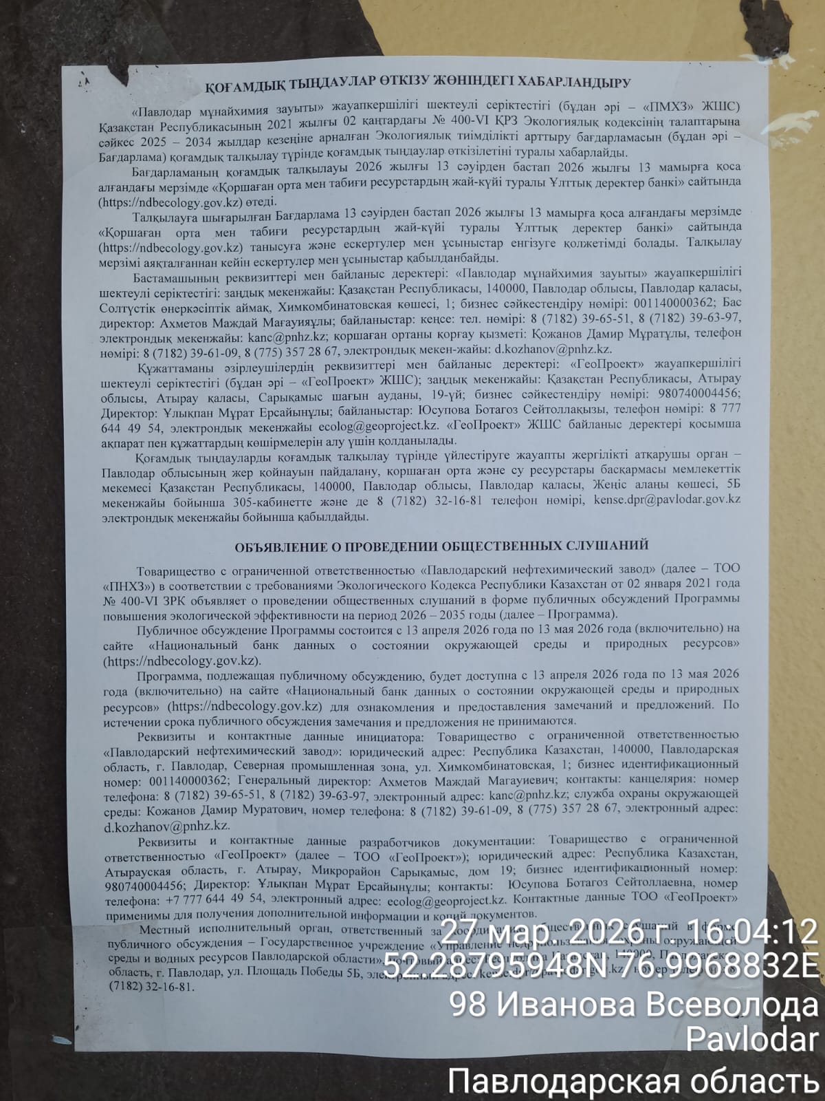 4. Повестка дня общественных слушаний: Проектная документация разработана для Товарищества с ограниченной ответственностью "Павлодарский нефтехимический завод". Работа выполнена для получения комплексного экологического разрешения в соответствии со ст.111 Экологическим Кодексом Республики Казахстан от 2 января 2021 года № 400-VI ЗРК (далее - ЭК РК): проектная документация (проект технологических нормативов, проект нормативов эмиссий в окружающую среду: проект нормативов допустимых выбросов загрязняющих веществ в атмосферный воздух, проект нормативов допустимых сбросов загрязняющих веществ в накопитель «Сарымсак», проект нормативов допустимых физических воздействий на природную среду, программа управления отходами, программа производственного экологического контроля выполнена в соответствии с законодательными и нормативными требованиями, действующими в Республике Казахстан. Проектная документация разработана на 2026-2035 годы.