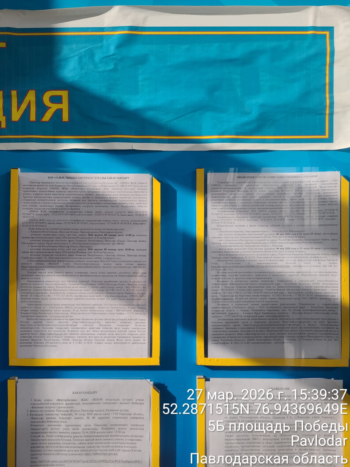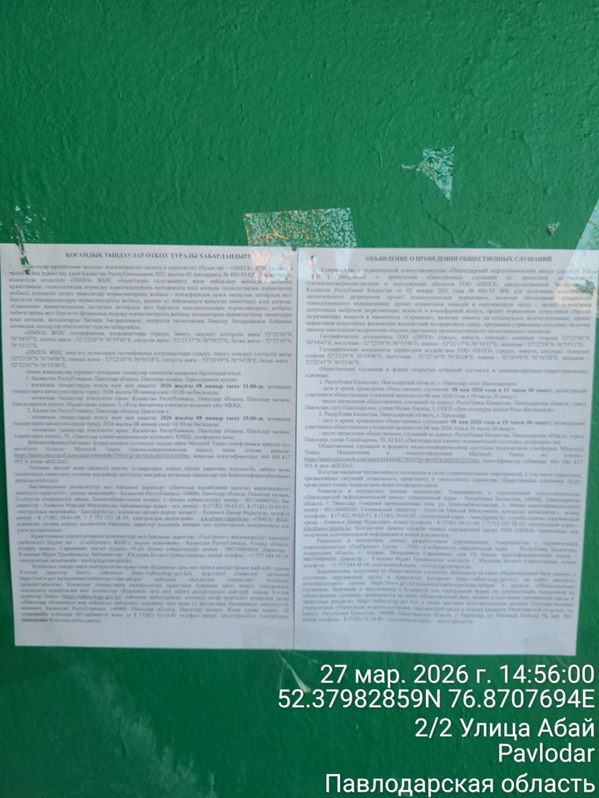 6.3. расположение мест, специально предназначенных для Размещения печатных объявлений (доски объявлений): Информационные доски: Государственное учреждение "Аппарат акима села Павлодарское" города Павлодара Павлодарской области; Государственное учреждение «Управление недропользования, окружающей среды и водных ресурсов Павлодарской области»; автобусные остановки с. Павлодарское, г. Павлодара.