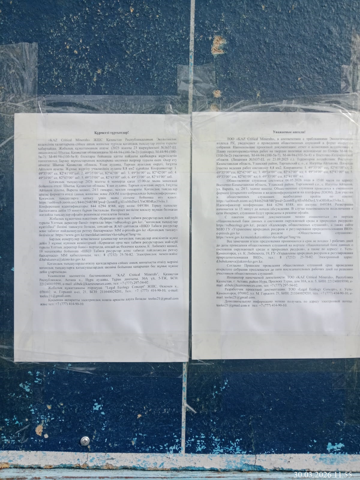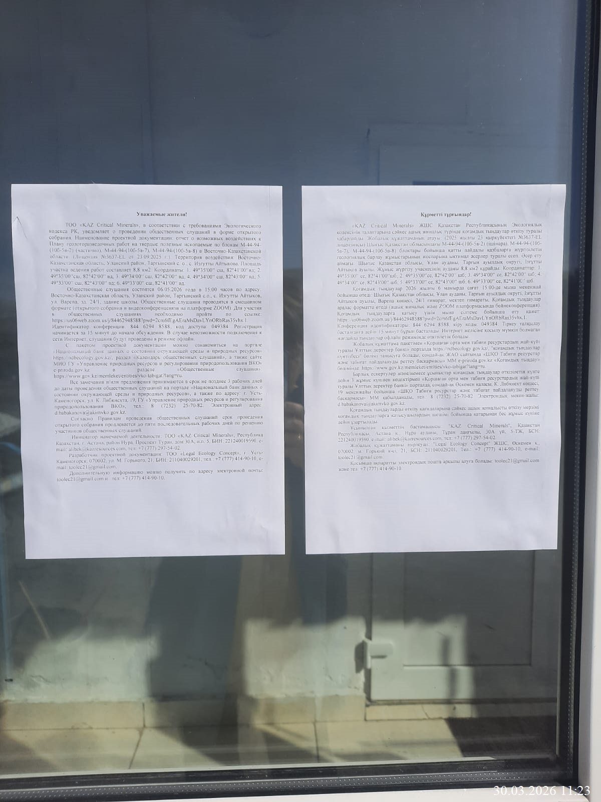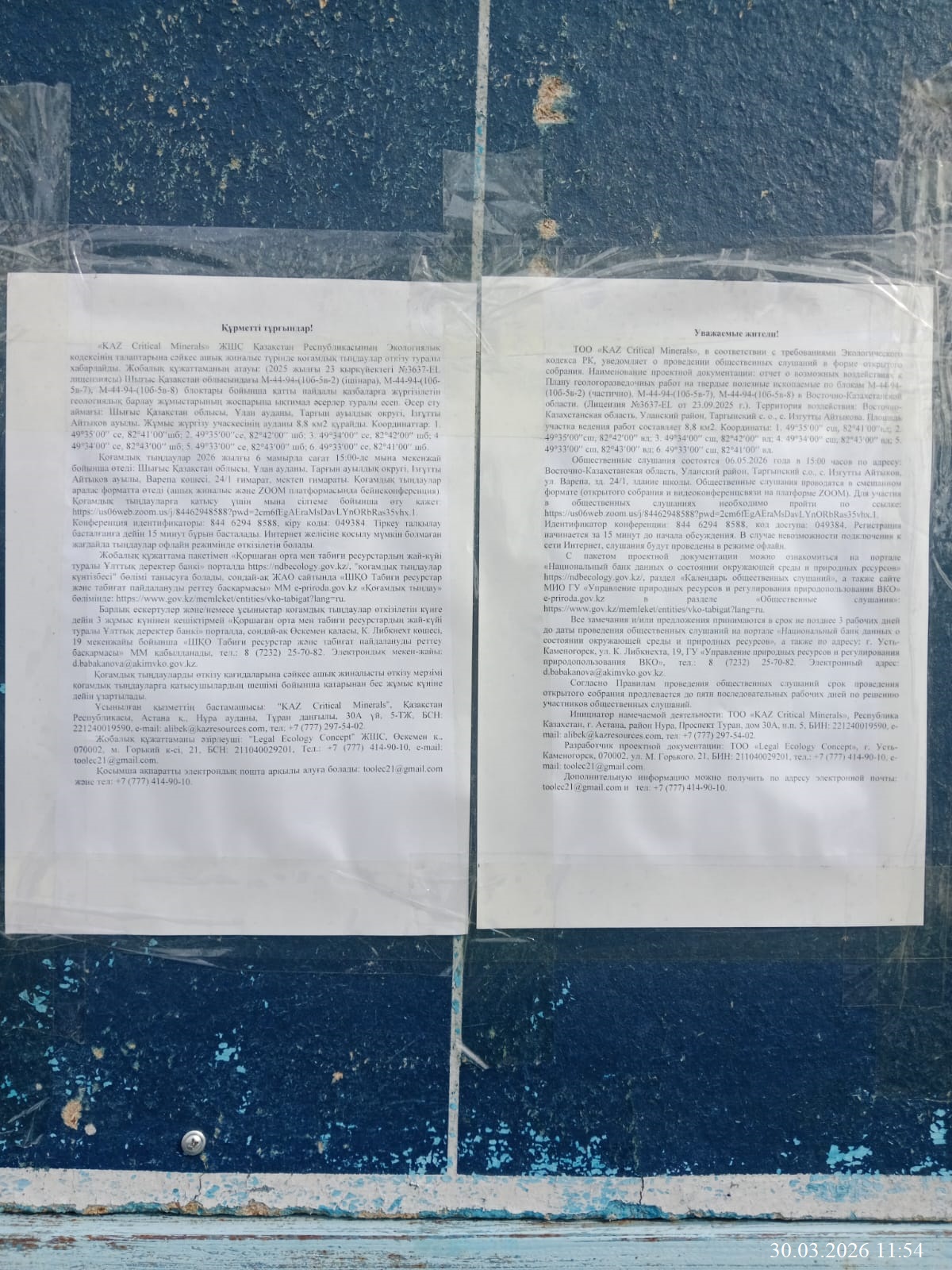 3. Общественные слушания организованны: Управление природных ресурсов и регулирования природопользования Восточно-Казахстанской области, d.babakanova@akimvko.gov.kz,