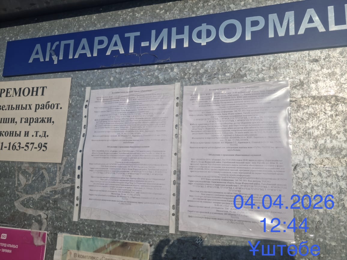3. Общественные слушания организованны: Управление природных ресурсов и регулирования природопользования Карагандинской области, expertiza.upr_krg@mail.ru,
