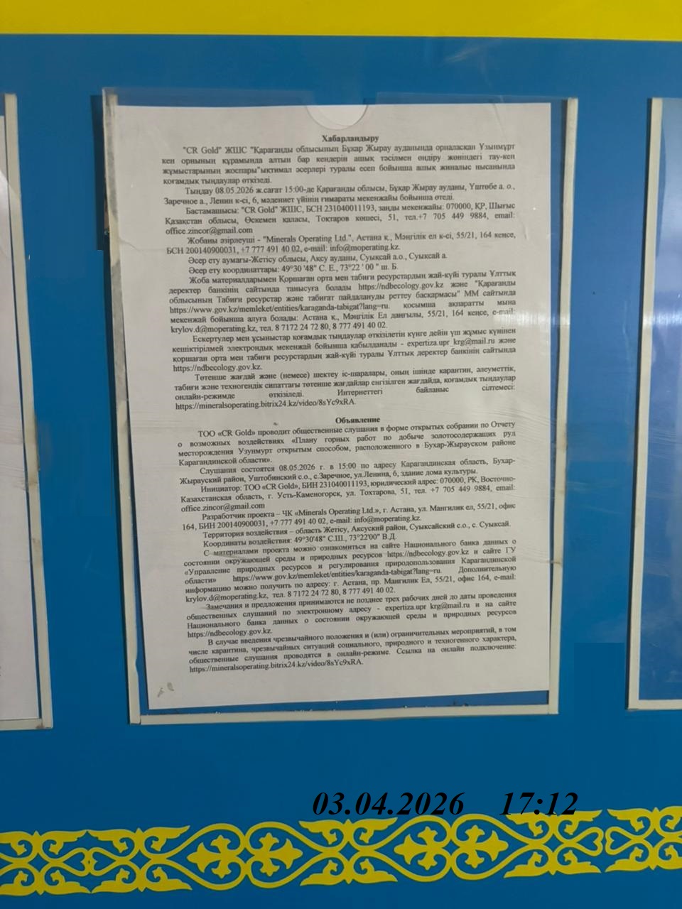 3. Общественные слушания организованны: Управление природных ресурсов и регулирования природопользования Карагандинской области, expertiza.upr_krg@mail.ru,