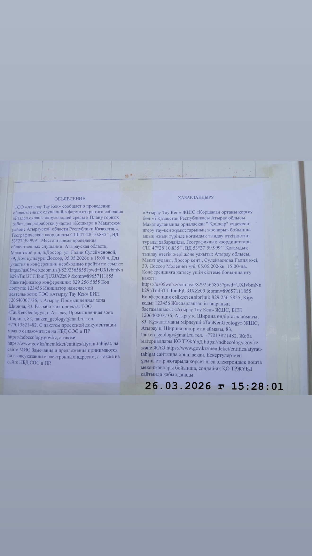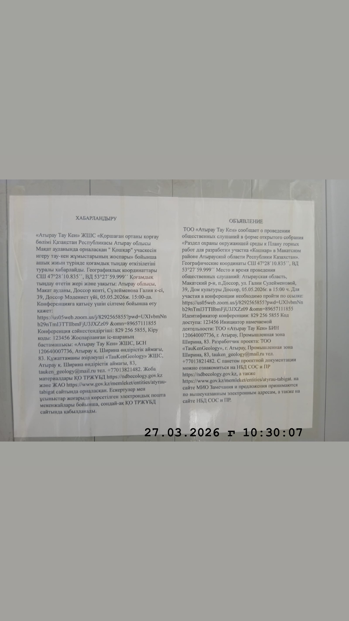 3. Общественные слушания организованны: Управление природных ресурсов и регулирования природопользования Атырауской области, atr.priroda@atyrau.gov.kz,
