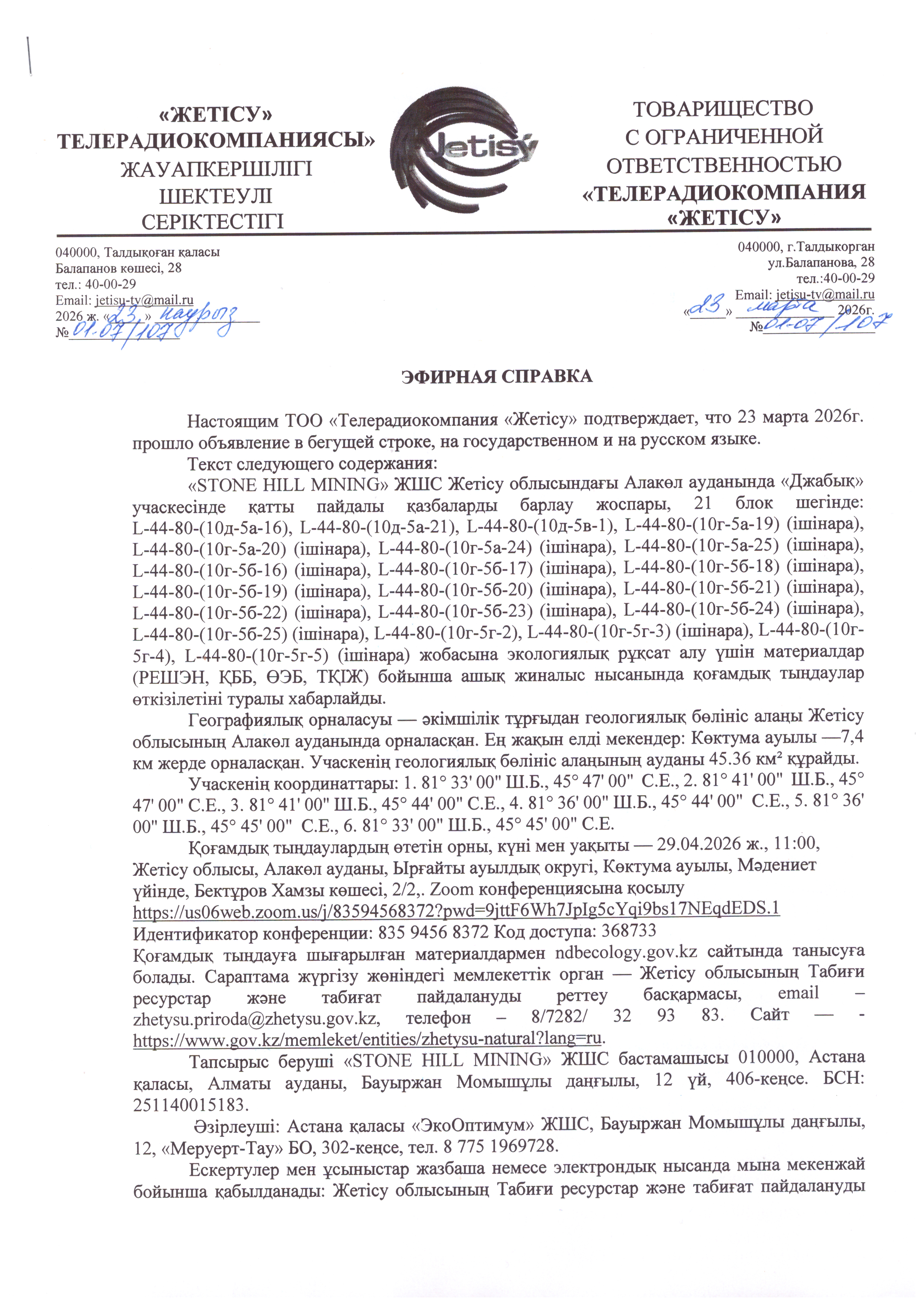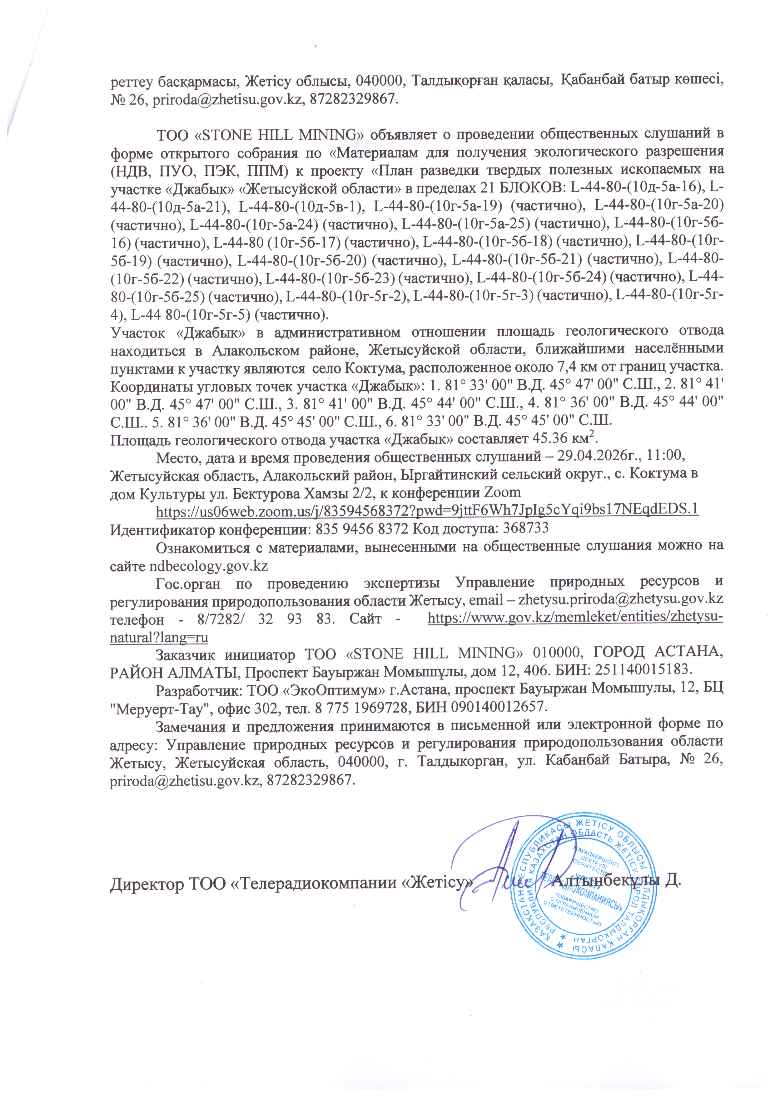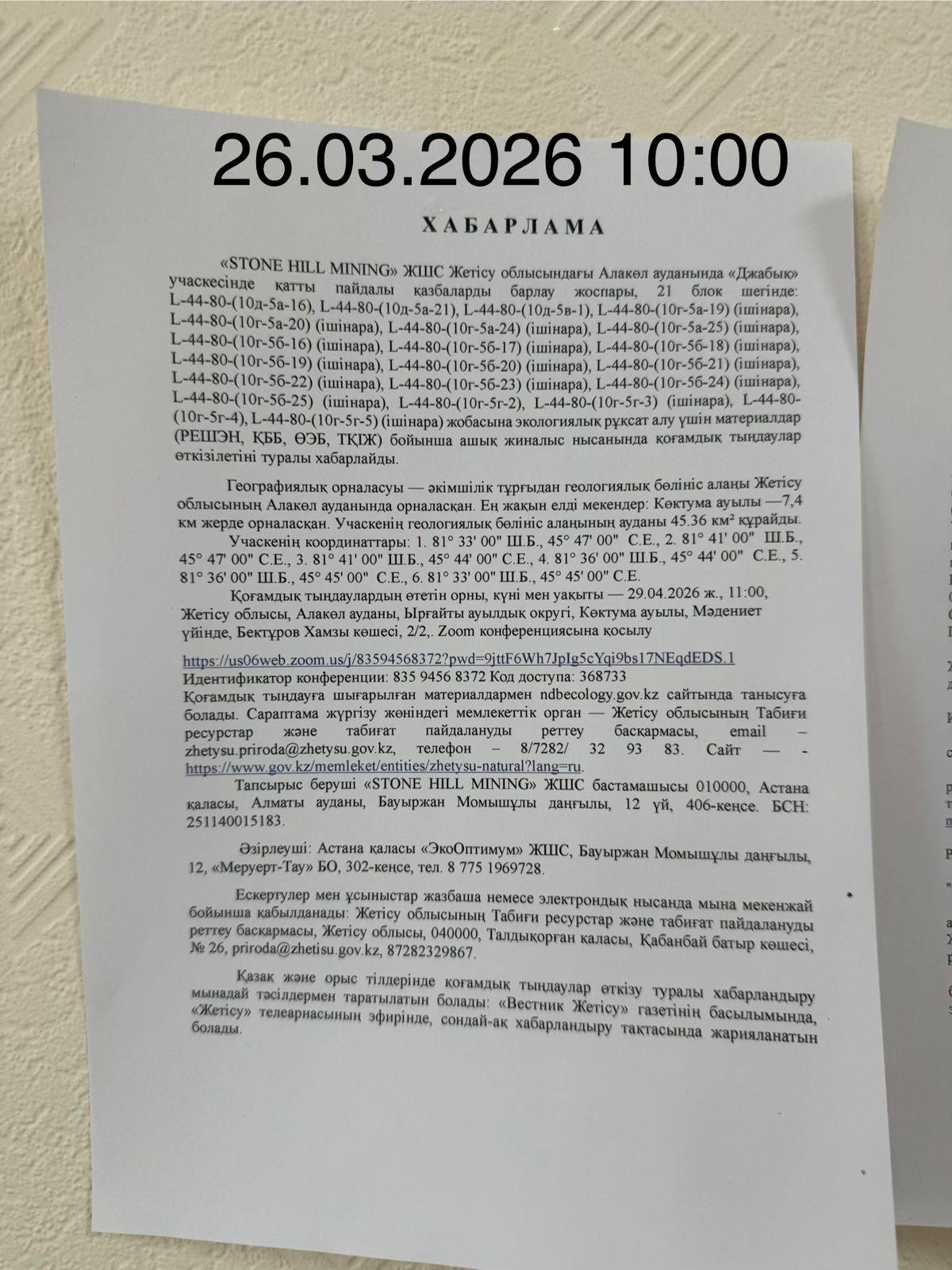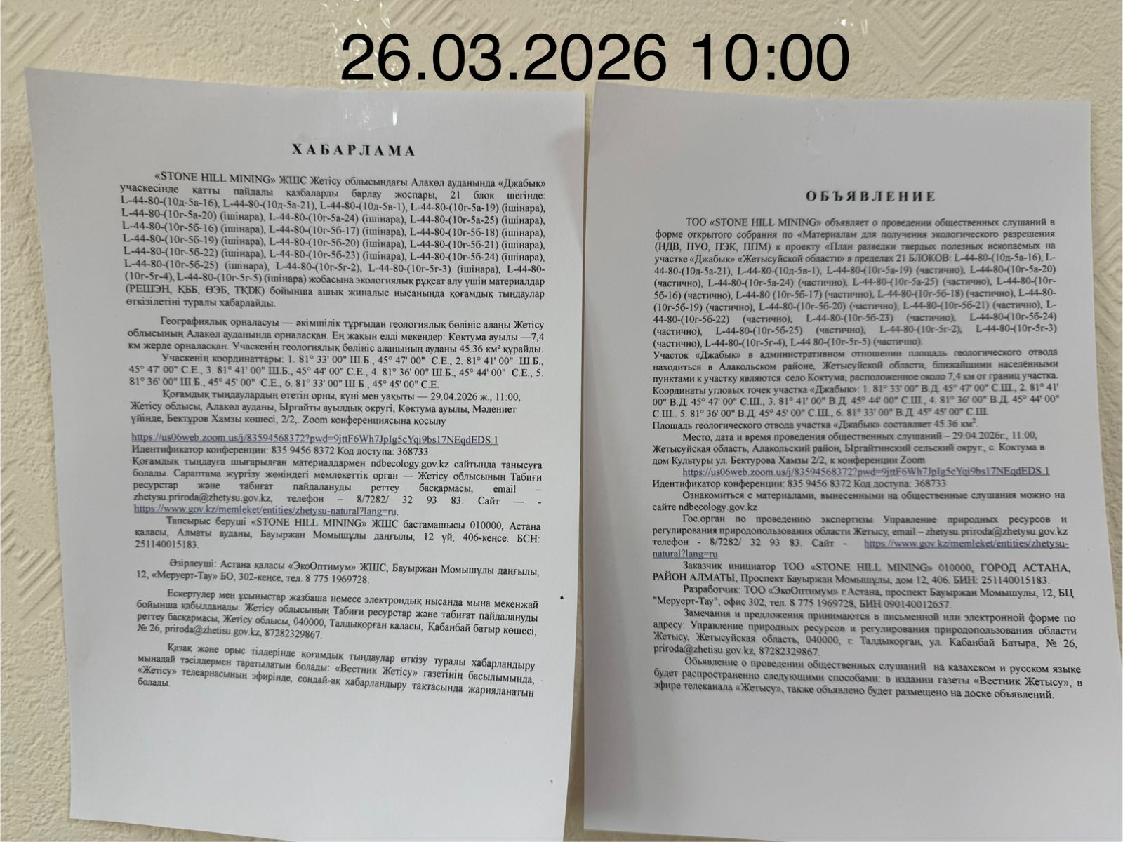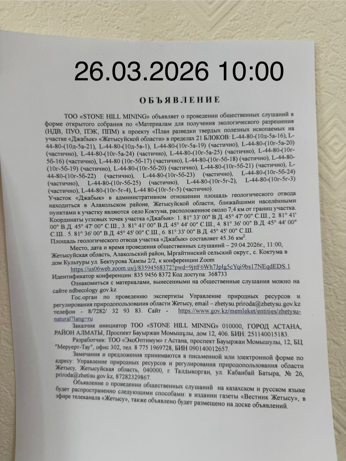 3. Общественные слушания организованны: Главный специалист УПР и ПР Жетысуйской области, priroda@zhetisu.gov.kz,