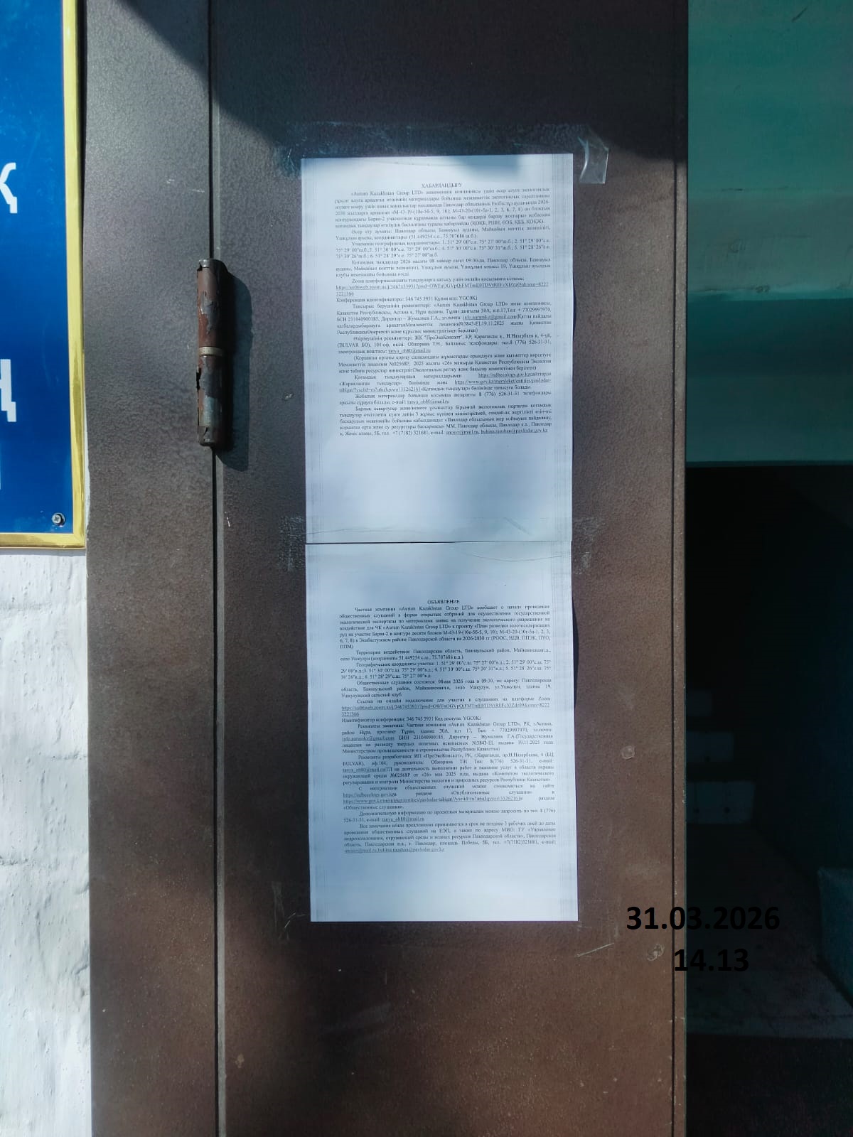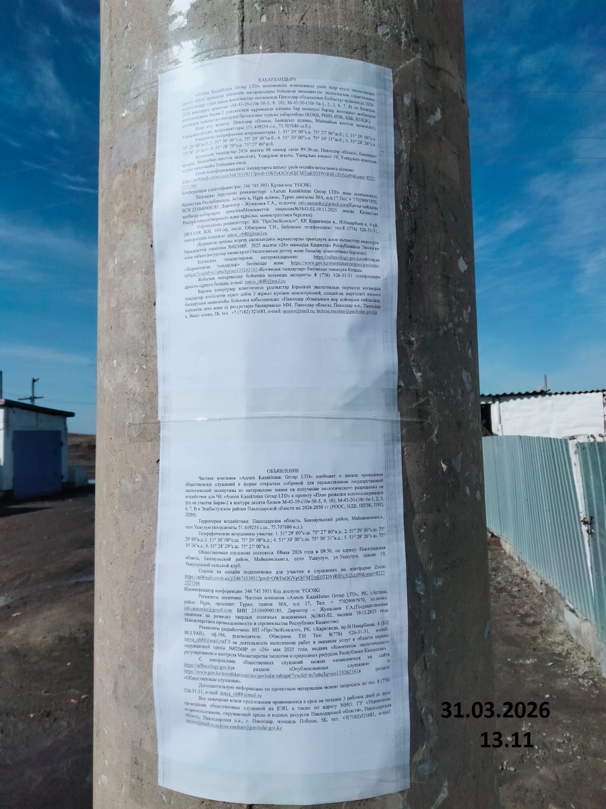 6. Объявление о проведении общественных слушаний на казахском и русском языках будет распространено следующими способами: