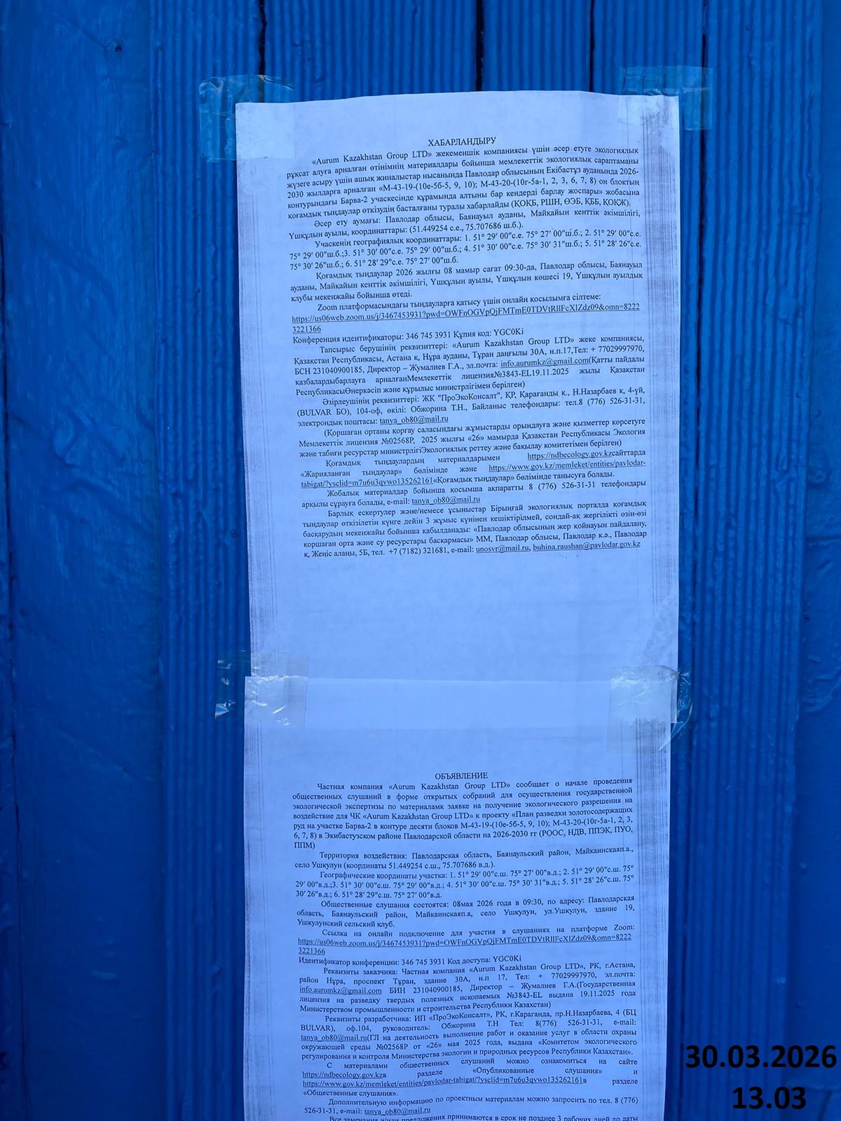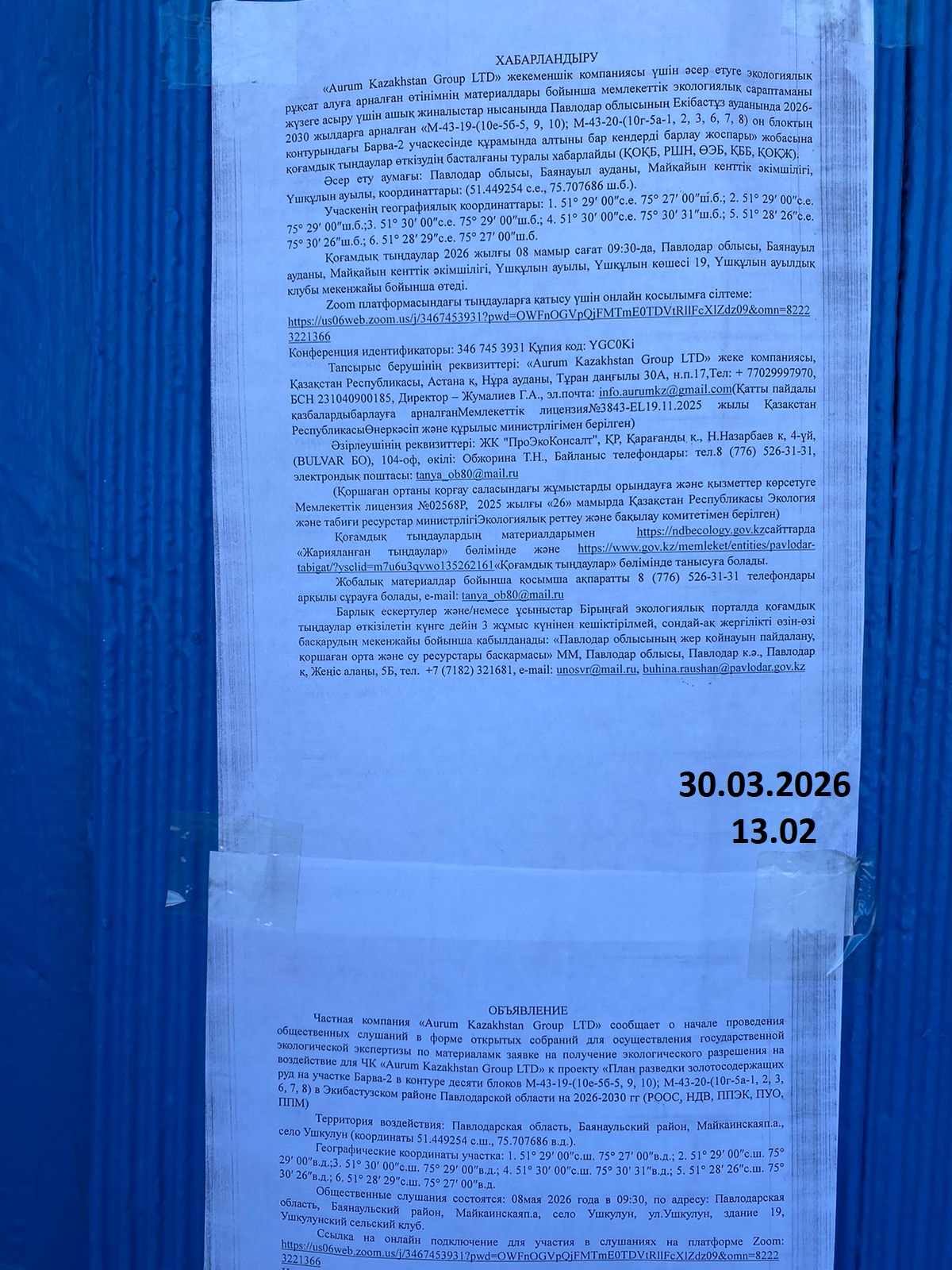 По проекту: Материалы к заявке на получение экологического разрешения на воздействие для ЧК «Aurum Kazakhstan Group LTD» к проекту «План разведки золотосодержащих руд на участке Барва-2 в контуре десяти блоков М-43-19-(10е-5б-5, 9, 10); М-43-20-(10г-5а-1, 2, 3, 6, 7, 8) в Экибастузском районе Павлодарской области на 2026-2030 гг (РООС, НДВ, ППЭК, ПУО, ППМ)