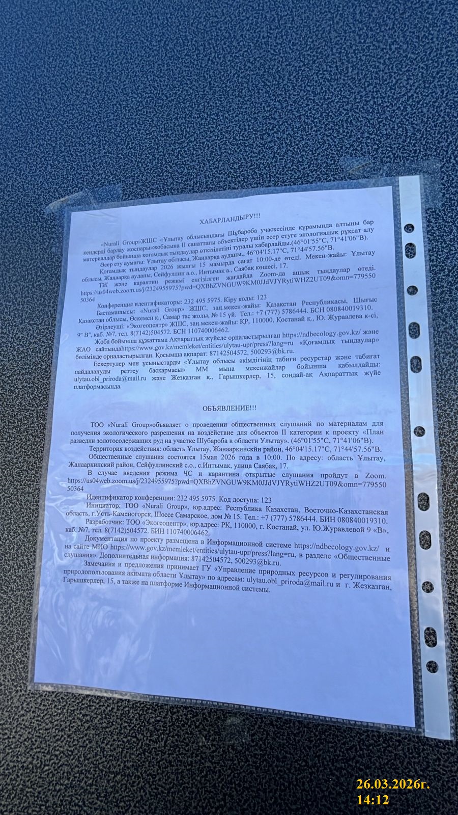 3. Общественные слушания организованны: Главный специалист УПР и ПР область Ұлытау, ulytau.obl_priroda@mail.ru,