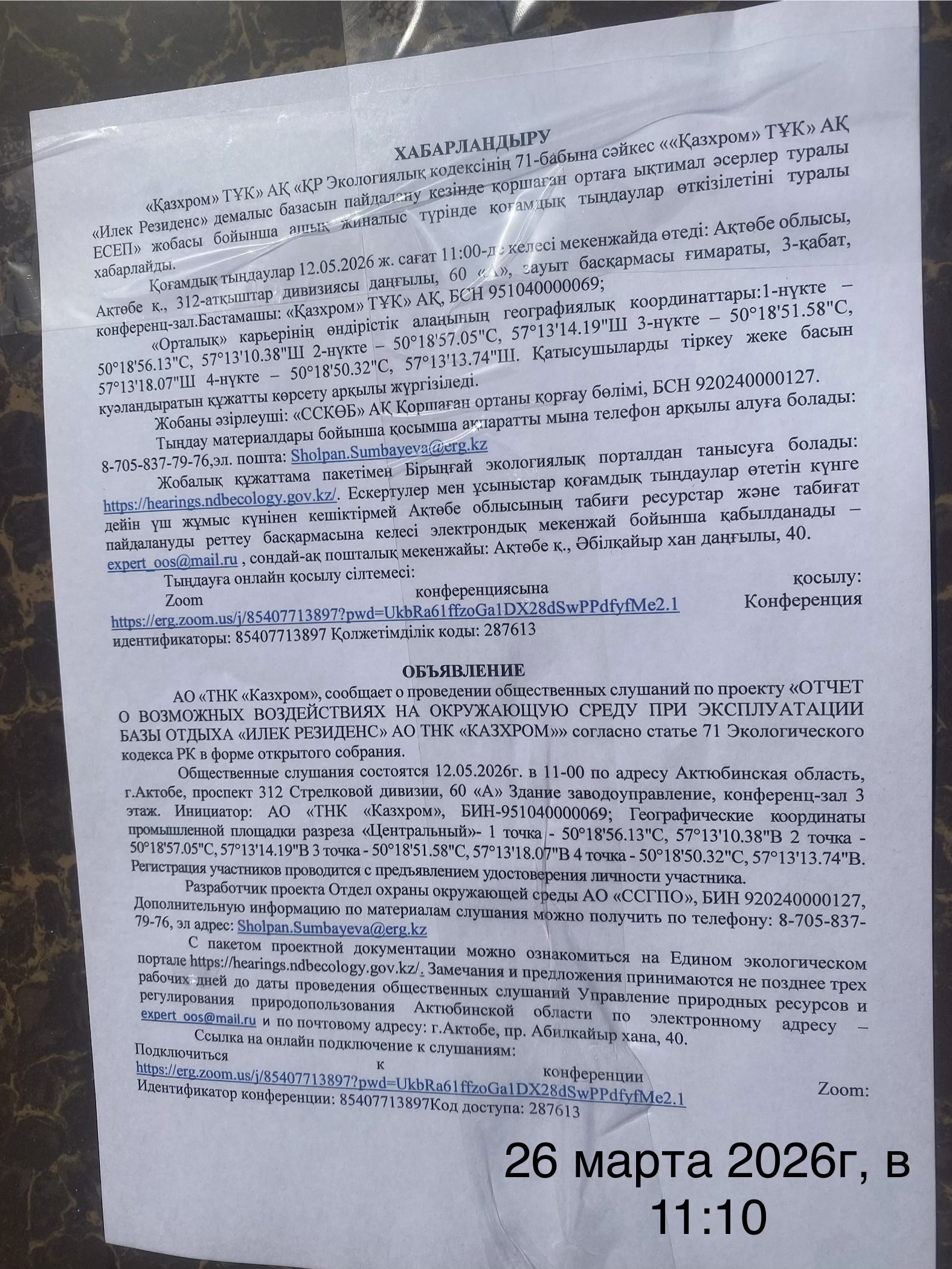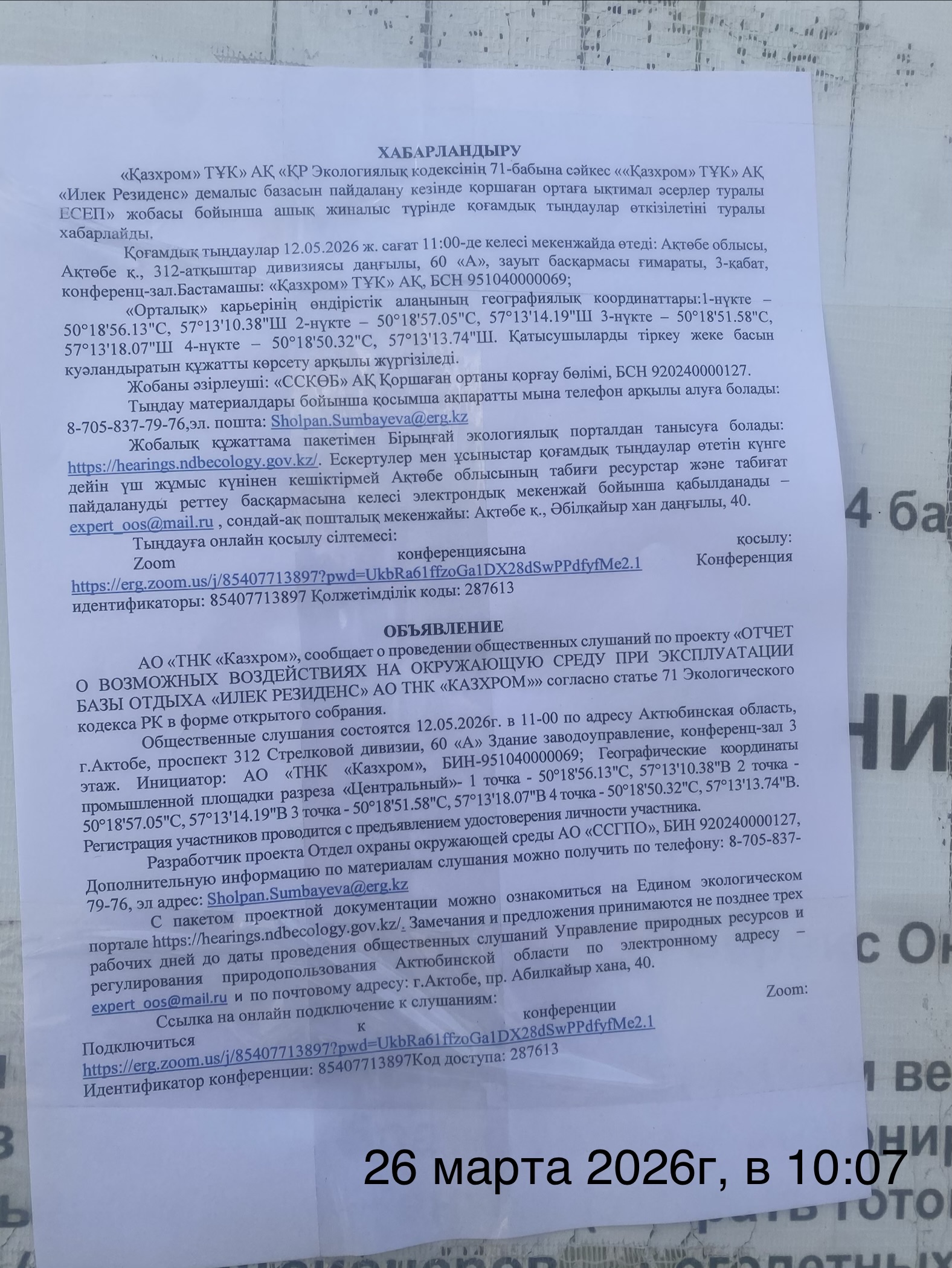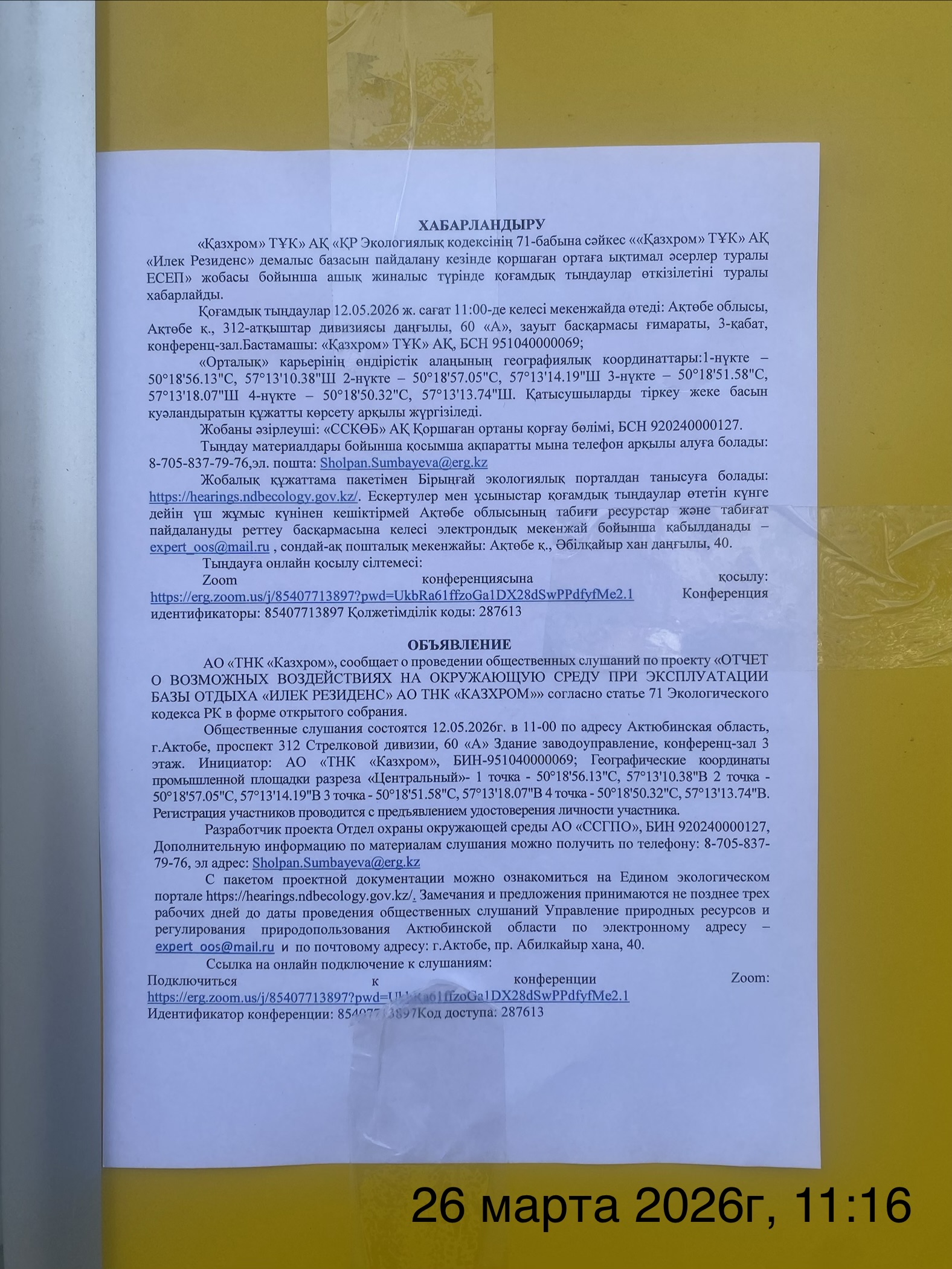 4. Повестка дня общественных слушаний: «База отдыха «Илек Резиденс»» является действующим объектом, предназначенным для отдыха. Функционирование База отдыха продолжится после прохождения необходимых экспертиз. База отдыха расположен в Актюбинской области, г. Актобе, район Алматы, в пределах ж.м Кирпичный. Ближайшая жилая зона расположена менее чем в 20 метрах от базы отдыха. Площадь территории д/о «Илек Резиденс» - 4,9643 га. Координаты участка: 1 точка - 50°18'56.13"С, 57°13'10.38"В 2 точка - 50°18'57.05"С, 57°13'14.19"В 3 точка - 50°18'51.58"С, 57°13'18.07"В 4 точка - 50°18'50.32"С, 57°13'13.74"В. На территории располагаются Домики для отдыха, кафе-столовая, беседки, терраса на 100 человек. База отдыха является действующим объектом. Строительство или реконструкция объектов не предусматривается. Проектом предусмотрена эксплуатация базы отдыха, расположенной на территории района Алматы, Актюбинской области, в пределах ж.м Кирпичный. На территории располагаются кафе-столовая, беседки для отдыха, терраса на 100 человек, 12 Домиков для отдыха. Вода питьевого качества будет использоваться из существующих сетей. Забор и (или) использования водных ресурсов из поверхностных и подземных источников с применением сооружений или технических устройств настоящим проектом не предусмотрено. В связи с чем, оформление Разрешения на специальное водопользование в соответствии статьи 66 Водного Кодекса РК не требуется. База отдыха находится на берегу реки Илек, согласно Постановления Акимата Актюбинской области №127 от 20 апреля 2009г. «Об установлении водоохранных зон и полос реки Илек и ее притоков», на данной реке установлены водоохранные зоны и полосы, в связи с чем, установление водоохранной зоны и полосы не требуется. Расстояние от реки Илек до базы отдыха порядка 60 метров. Вода питьевого качества будет использоваться из существующих сетей. Расход воды на хоз.-бытовые нужды ориентировочно составит 100 м3/месяц. Тыңдауға онлайн қосылу сілтемесі: Zoom конференциясына қосылу: https://erg.zoom.us/j/85407713897?pwd=UkbRa61ffzoGa1DX28dSwPPdfyfMe2.1 Конференция идентификаторы: 85407713897 Қолжетімділік коды: 287613 Ссылка на онлайн подключение к слушаниям: Подключиться к конференции Zoom: https://erg.zoom.us/j/85407713897?pwd=UkbRa61ffzoGa1DX28dSwPPdfyfMe2.1 Идентификатор конференции: 85407713897Код доступа: 287613