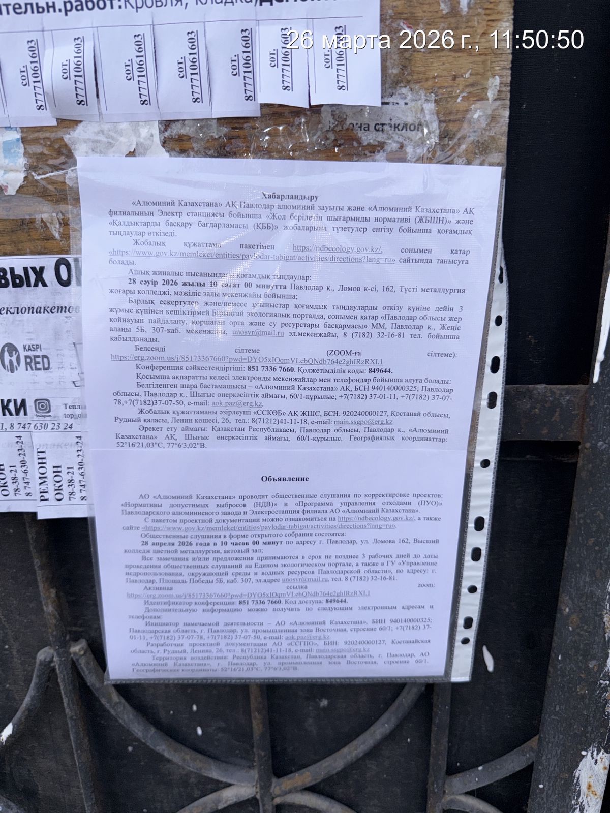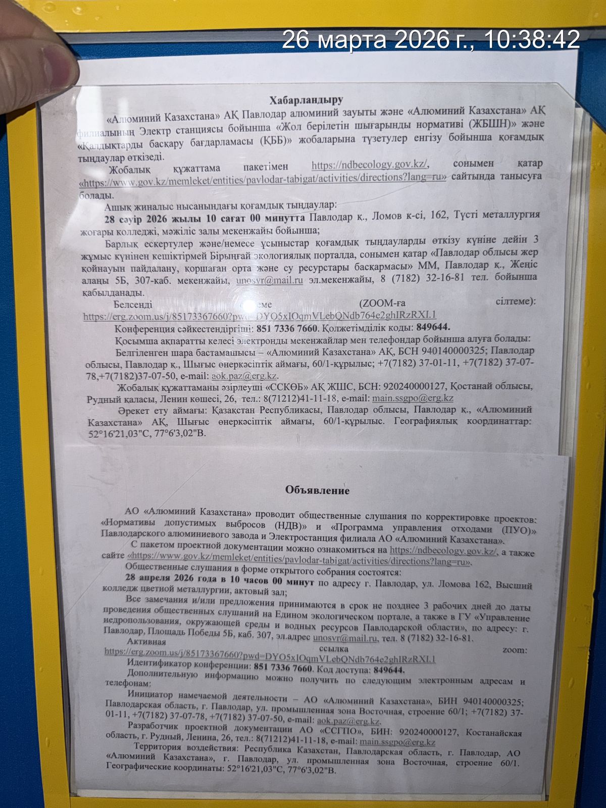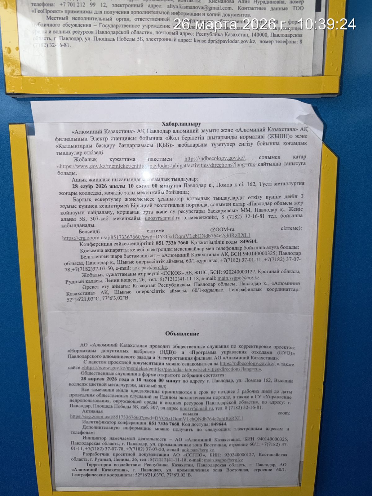 6.3. расположение мест, специально предназначенных для Размещения печатных объявлений (доски объявлений): Управление недропользования, окружающей среды и водных ресурсов Павлодарской области, Усольский мкр. на доске объявлений