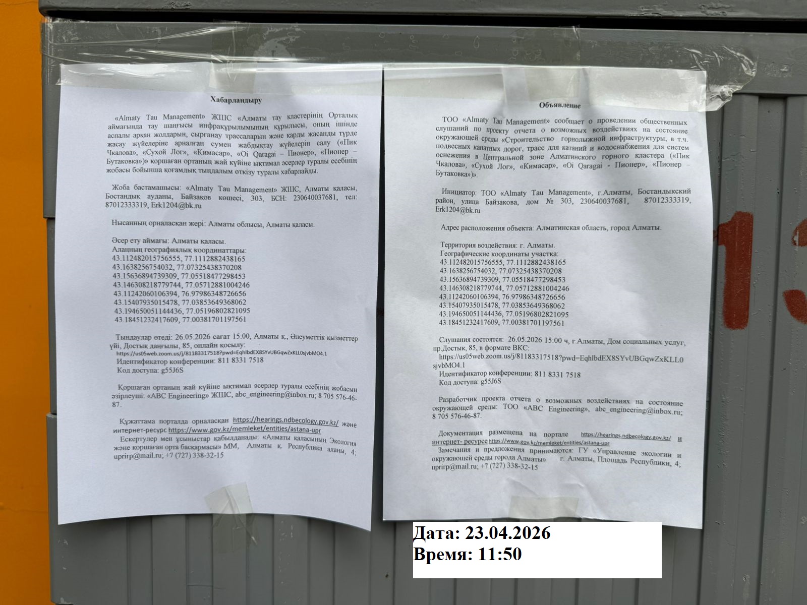 По проекту: ПРОЕКТ ОТЧЕТА О ВОЗМОЖНЫХ ВОЗДЕЙСТВИЯХ НА СОСТОЯНИЕ ОКРУЖАЮЩЕЙ СРЕДЫ "Строительство горнолыжной инфраструктуры, в т.ч. подвесных канатных дорог, трасс для катаний и водоснабжения для систем оснежения в Центральной зоне Алматинского горного кластера («Пик Чкалова», «Сухой Лог», «Кимасар», «Oi Qaragai - Пионер», «Пионер – Бутаковка»)"