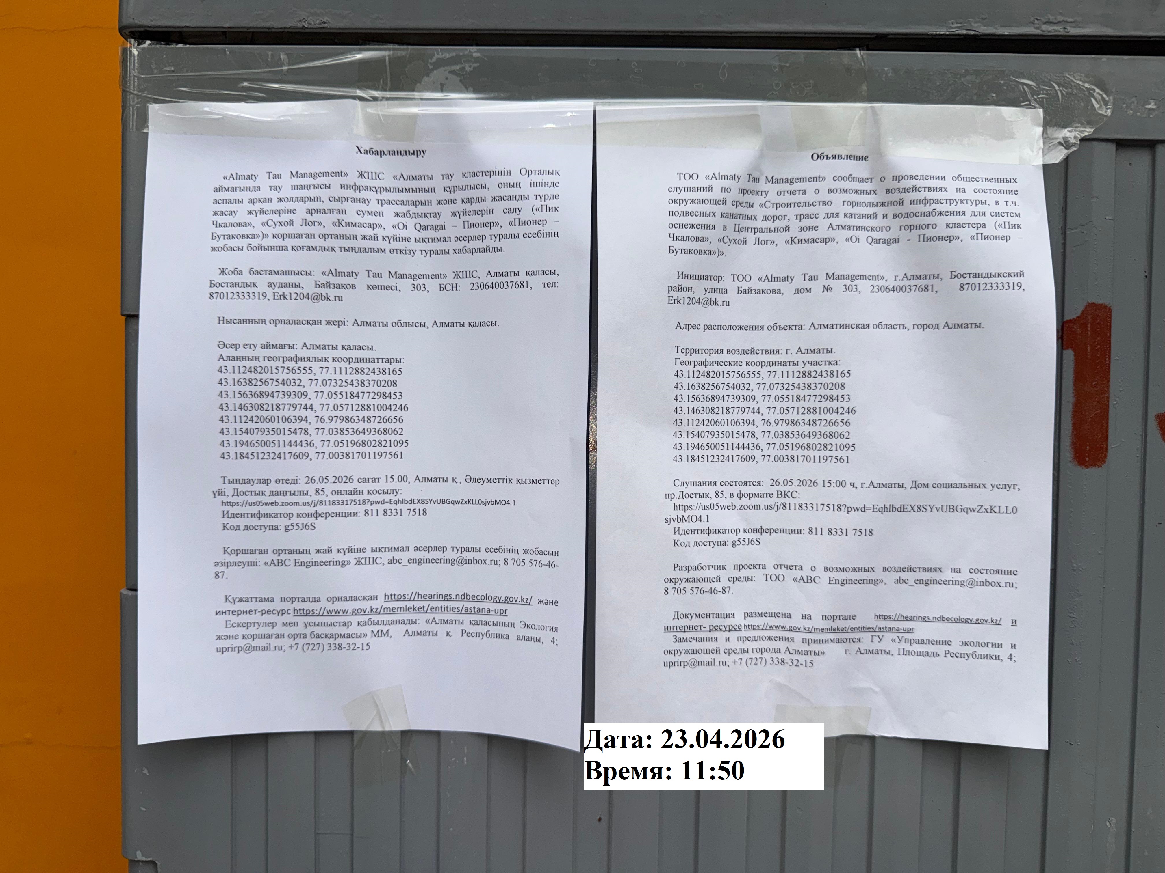 6. Объявление о проведении общественных слушаний на казахском и русском языках будет распространено следующими способами: