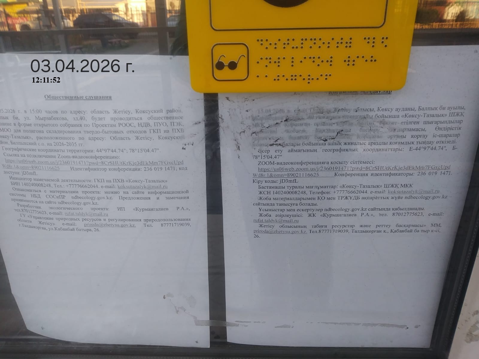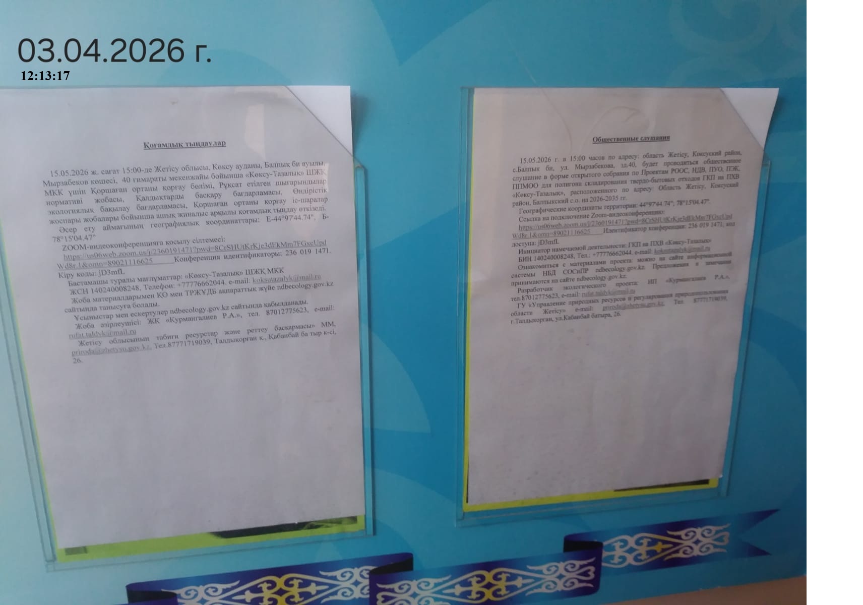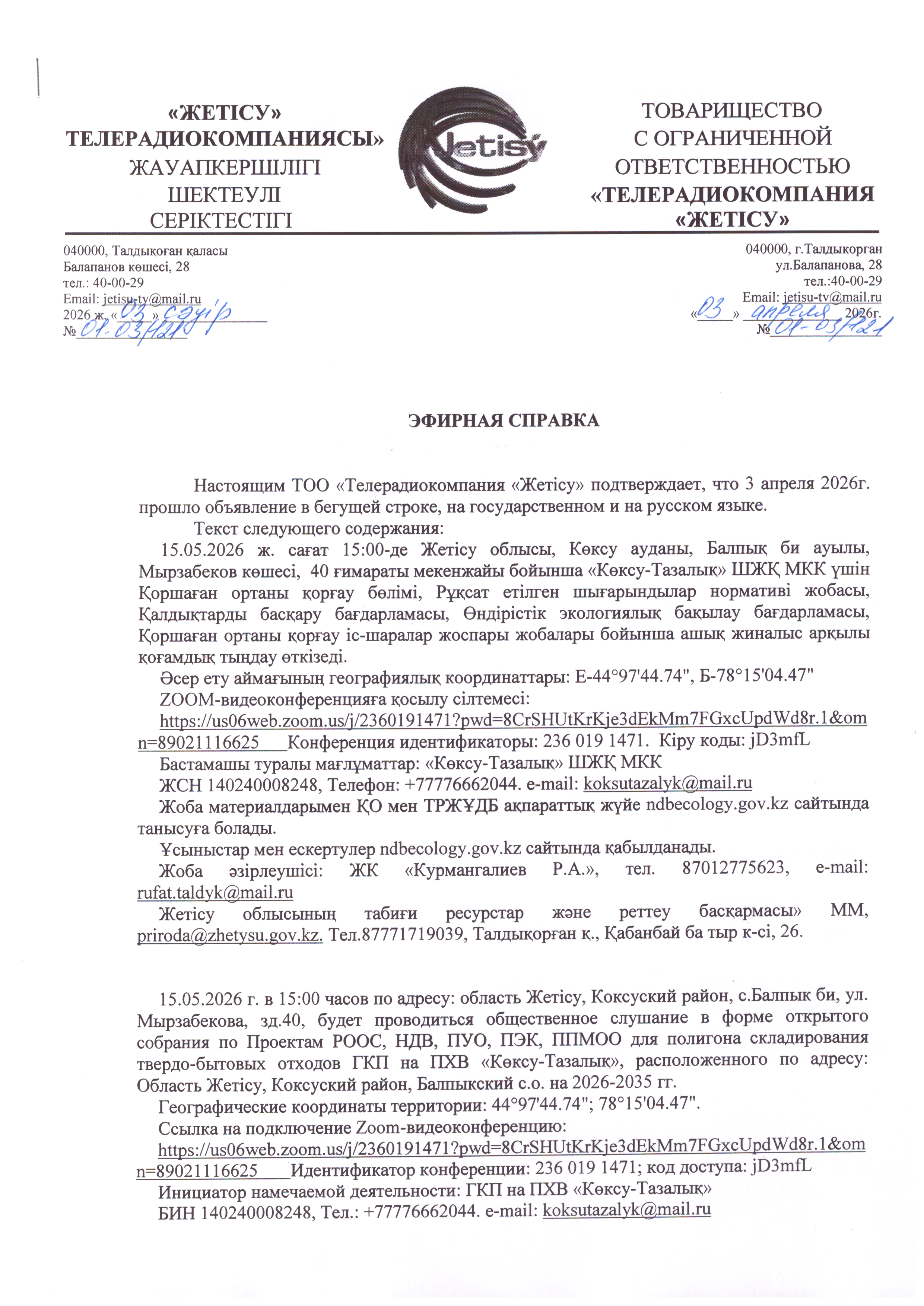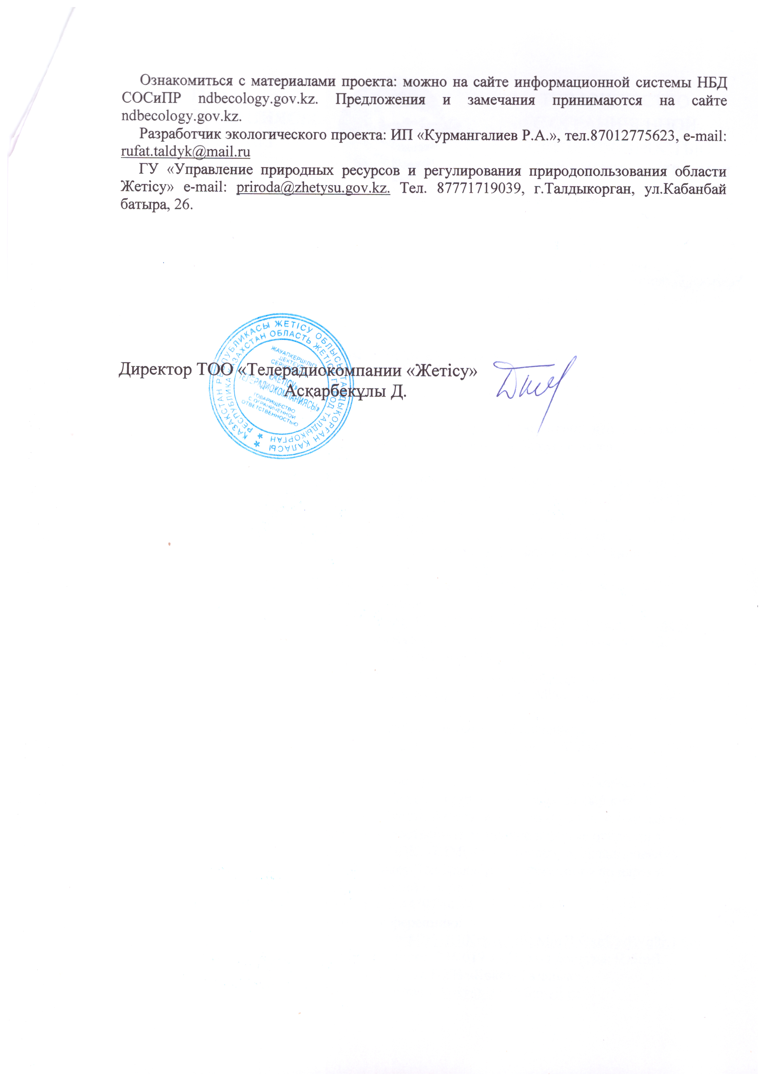 3. Общественные слушания организованны: Главный специалист УПР и ПР Жетысуйской области, priroda@zhetisu.gov.kz,