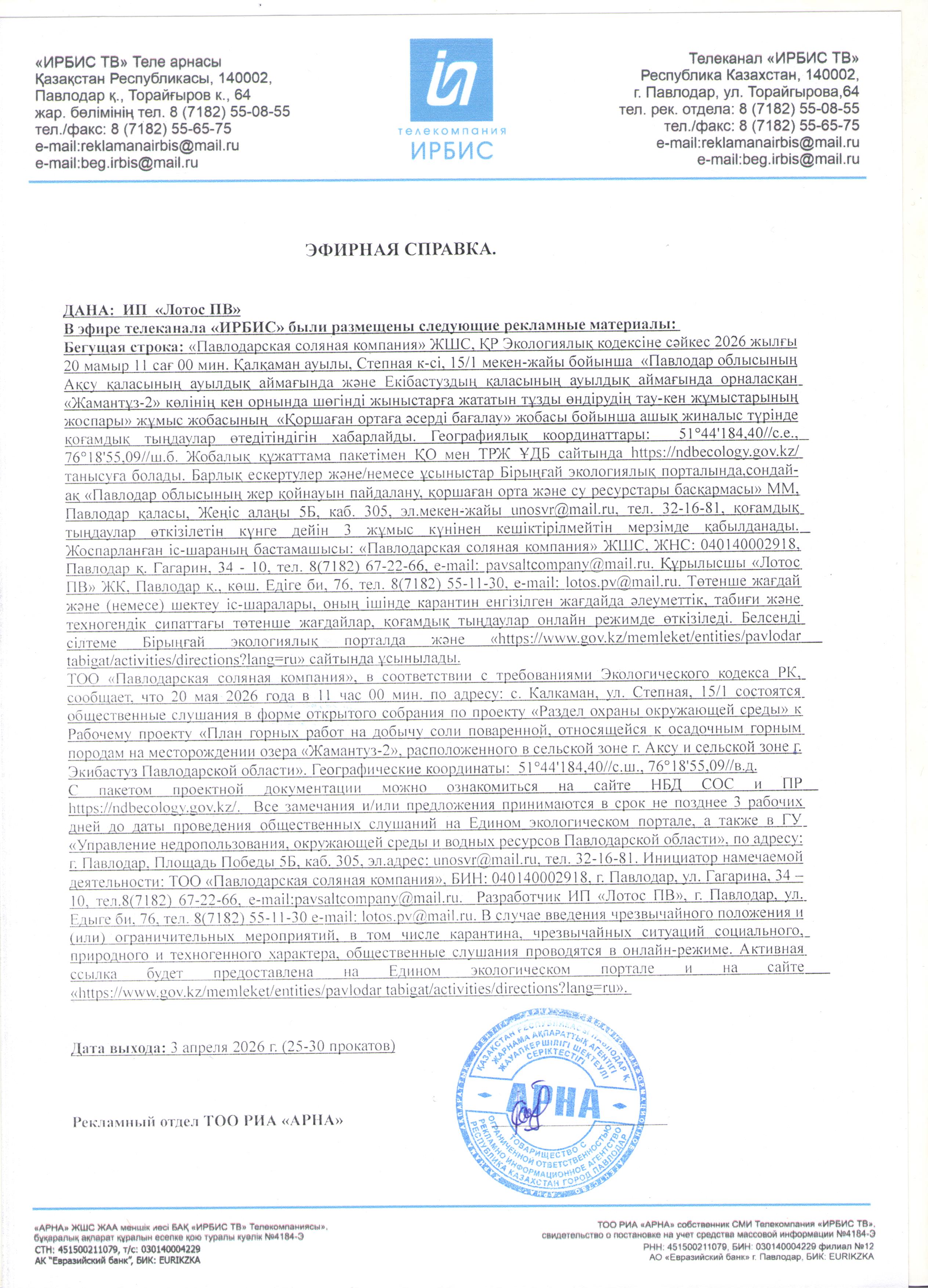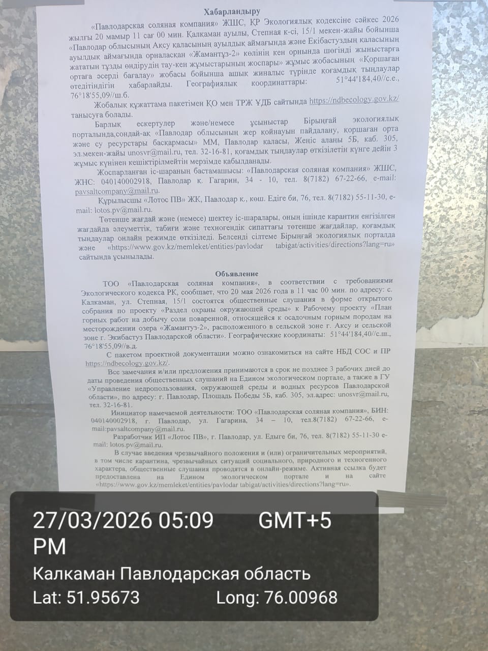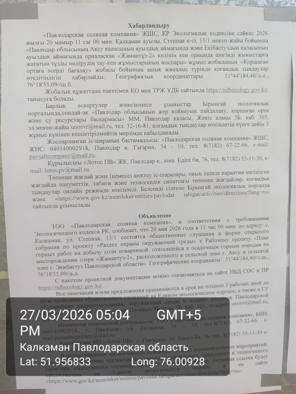 4. Повестка дня общественных слушаний: Хабарландыру «Павлодарская соляная компания» ЖШС, ҚР Экологиялық кодексіне сәйкес 2026 жылғы 20 мамыр 11 сағ 00 мин. Қалқаман ауылы, Степная к-сі, 15/1 мекен-жайы бойынша «Павлодар облысының Ақсу қаласының ауылдық аймағында және Екібастуздың қаласының ауылдық аймағында орналасқан «Жамантұз-2» көлінің кен орнында шөгінді жыныстарға жататын тұзды өндірудің тау-кен жұмыстарының жоспары» жұмыс жобасының «Қоршаған ортаға әсерді бағалау» жобасы бойынша ашық жиналыс түрінде қоғамдық тыңдаулар өтедітіндігін хабарлайды. Географиялық координаттары: 51°44'184,40//с.е., 76°18'55,09//ш.б. Жобалық құжаттама пакетімен ҚО мен ТРЖ ҰДБ сайтында https://ndbecology.gov.kz/ танысуға болады. Барлық ескертулер және/немесе ұсыныстар Бірыңғай экологиялық порталында,сондай-ақ «Павлодар облысының жер қойнауын пайдалану, қоршаған орта және су ресурстары басқармасы» ММ, Павлодар қаласы, Жеңіс алаңы 5Б, каб. 305, эл.мекен-жайы unosvr@mail.ru, тел. 32-16-81, қоғамдық тыңдаулар өткізілетін күнге дейін 3 жұмыс күнінен кешіктірілмейтін мерзімде қабылданады. Жоспарланған іс-шараның бастамашысы: «Павлодарская соляная компания» ЖШС, ЖНС: 040140002918, Павлодар қ. Гагарин, 34 - 10, тел. 8(7182) 67-22-66, e-mail: pavsaltcompany@mail.ru. Құрылысшы «Лотос ПВ» ЖК, Павлодар қ., көш. Едіге би, 76, тел. 8(7182) 55-11-30, е-mail: lotos.pv@mail.ru. Төтенше жағдай және (немесе) шектеу іс-шаралары, оның ішінде карантин енгізілген жағдайда әлеуметтік, табиғи және техногендік сипаттағы төтенше жағдайлар, қоғамдық тыңдаулар онлайн режимде өткізіледі. Белсенді сілтеме Бірыңғай экологиялық порталда және «https://www.gov.kz/memleket/entities/pavlodar tabigat/activities/directions?lang=ru» сайтында ұсынылады. Объявление ТОО «Павлодарская соляная компания», в соответствии с требованиями Экологического кодекса РК, сообщает, что 20 мая 2026 года в 11 час 00 мин. по адресу: с. Калкаман, ул. Степная, 15/1 состоятся общественные слушания в форме открытого собрания по проекту «Раздел охраны окружающей среды» к Рабочему проекту «План горных работ на добычу соли поваренной, относящейся к осадочным горным породам на месторождении озера «Жамантуз-2», расположенного в сельской зоне г. Аксу и сельской зоне г. Экибастуз Павлодарской области». Географические координаты: 51°44'184,40//с.ш., 76°18'55,09//в.д. С пакетом проектной документации можно ознакомиться на сайте НБД СОС и ПР https://ndbecology.gov.kz/. Все замечания и/или предложения принимаются в срок не позднее 3 рабочих дней до даты проведения общественных слушаний на Едином экологическом портале, а также в ГУ «Управление недропользования, окружающей среды и водных ресурсов Павлодарской области», по адресу: г. Павлодар, Площадь Победы 5Б, каб. 305, эл.адрес: unosvr@mail.ru, тел. 32-16-81. Инициатор намечаемой деятельности: ТОО «Павлодарская соляная компания», БИН: 040140002918, г. Павлодар, ул. Гагарина, 34 – 10, тел.8(7182) 67-22-66, e-mail:pavsaltcompany@mail.ru. Разработчик ИП «Лотос ПВ», г. Павлодар, ул. Едыге би, 76, тел. 8(7182) 55-11-30 е-mail: lotos.pv@mail.ru. В случае введения чрезвычайного положения и (или) ограничительных мероприятий, в том числе карантина, чрезвычайных ситуаций социального, природного и техногенного характера, общественные слушания проводятся в онлайн-режиме. Активная ссылка будет предоставлена на Едином экологическом портале и на сайте «https://www.gov.kz/memleket/entities/pavlodar tabigat/activities/directions?lang=ru».