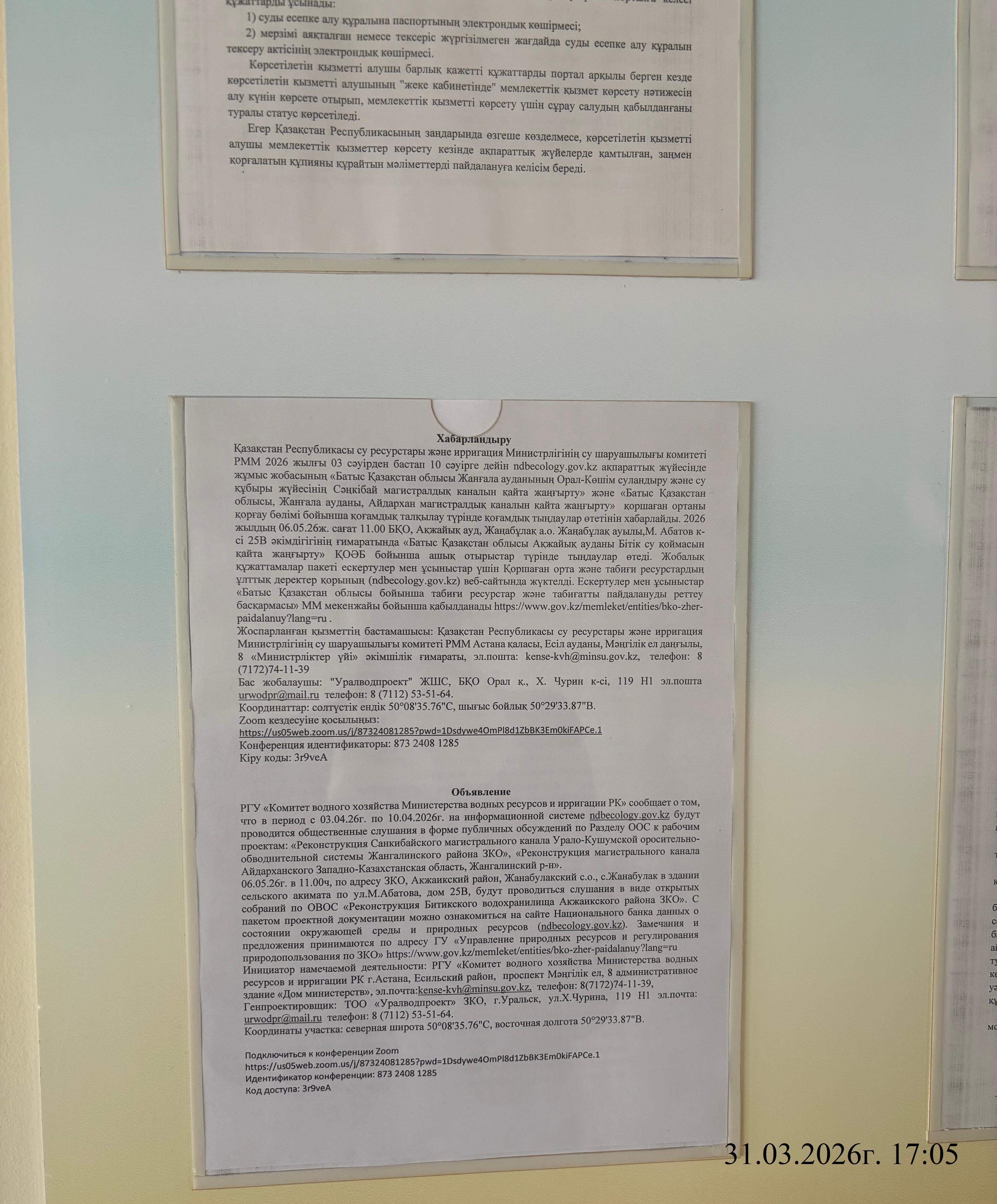 1.4. Описание для подключения к онлайн трансляции при прохождении общественного слушания: Тема: «Реконструкция Битикского водохранилища Акжаикского района ЗКО» Время: 6 мая 2026 11:00 Подключиться к конференции Zoom https://us05web.zoom.us/j/87324081285?pwd=1Dsdywe4OmPl8d1ZbBK3Em0kiFAPCe.1 Идентификатор конференции: 873 2408 1285 Код доступа: 3r9veA