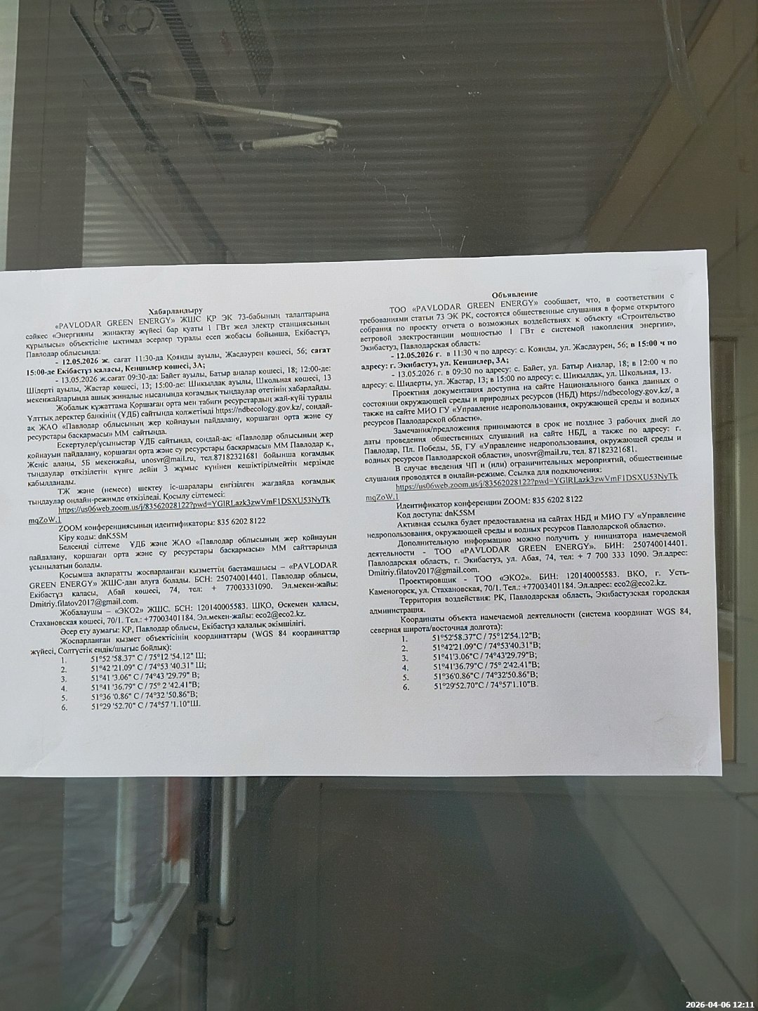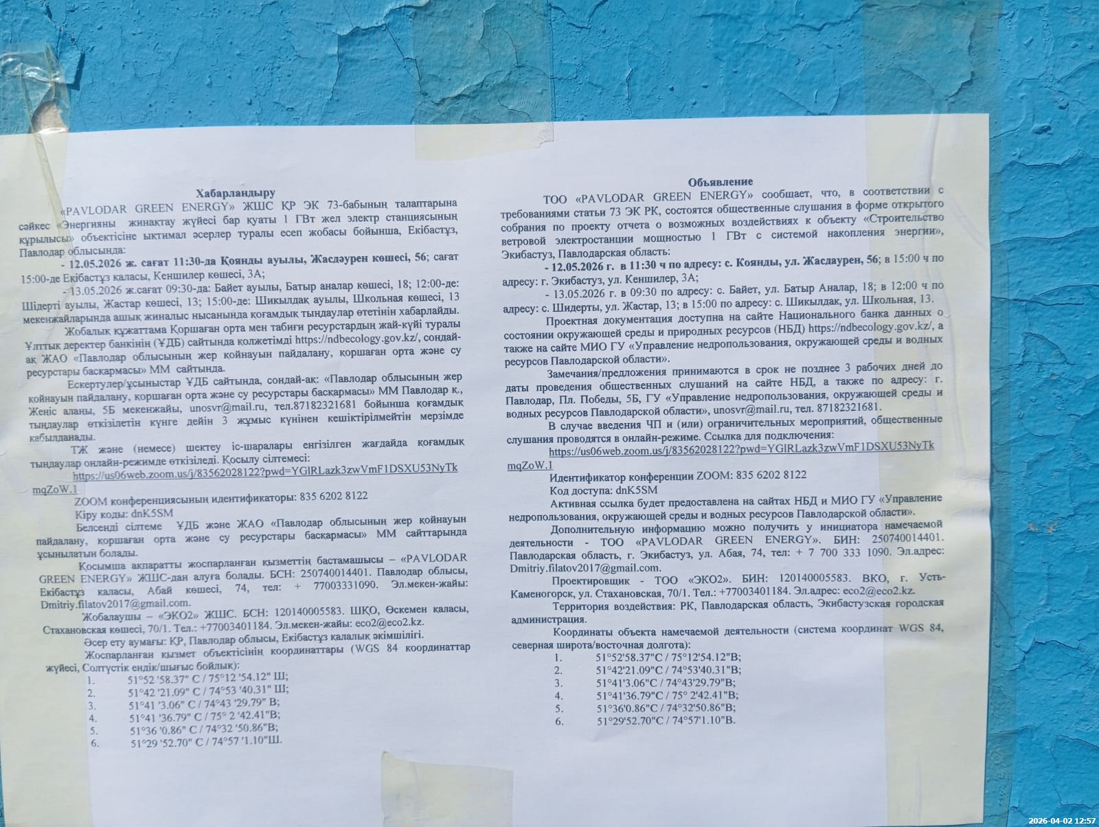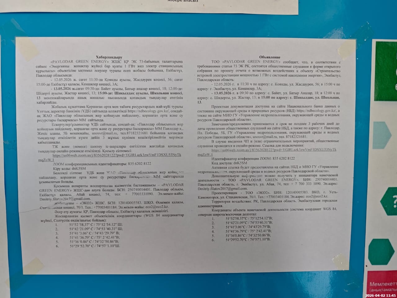 4. Повестка дня общественных слушаний: Намечаемая деятельность – строительство ветровой электростанции мощностью 1 ГВт с системой накопления энергии, Экибастуз, Павлодарская область. Основные объекты: - Ветровая электростанция (ВЭС) мощностью 1 ГВт, включающая ориентировочно 125 ветроэнергетических установок (ВЭУ) единичной мощностью порядка 8 МВт, с устройством подъездных автомобильных дорог, монтажных площадок, а также кабельных линий электропередачи напряжением 35 кВ для сбора и передачи мощности; - Собственная повышающая трансформаторная подстанция 500/35 кВ «ВЭС Экибастузская», предназначенная для выдачи мощности ВЭС и системы накопления энергии, с установкой силовых трансформаторов соответствующей мощности, а также две воздушные линии электропередачи напряжением 500 кВ для передачи мощности в энергосистему общей протяженностью ориентировочно 91,5 км); - Система накопления электрической энергии (СНЭЭ) мощностью 300 МВт и емкостью 600 МВт·ч, предназначенная для сглаживания неравномерности выработки ветровой электростанции, повышения надежности электроснабжения, обеспечения участия объекта в регулировании частоты и мощности, а также интеграции проекта в Единую электроэнергетическую систему Республики Казахстан; - Служебно-производственный и вспомогательный комплекс, включающий здания и сооружения эксплуатационного назначения, а также необходимую инженерную инфраструктуру, в том числе системы противопожарного водоснабжения, насосные станции, складские и вспомогательные помещения.