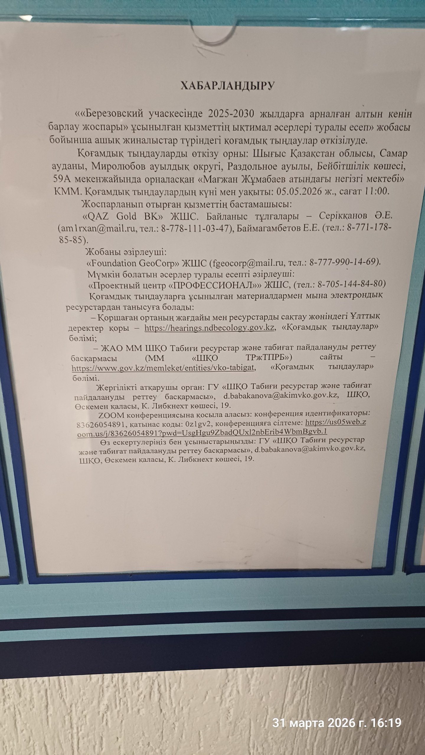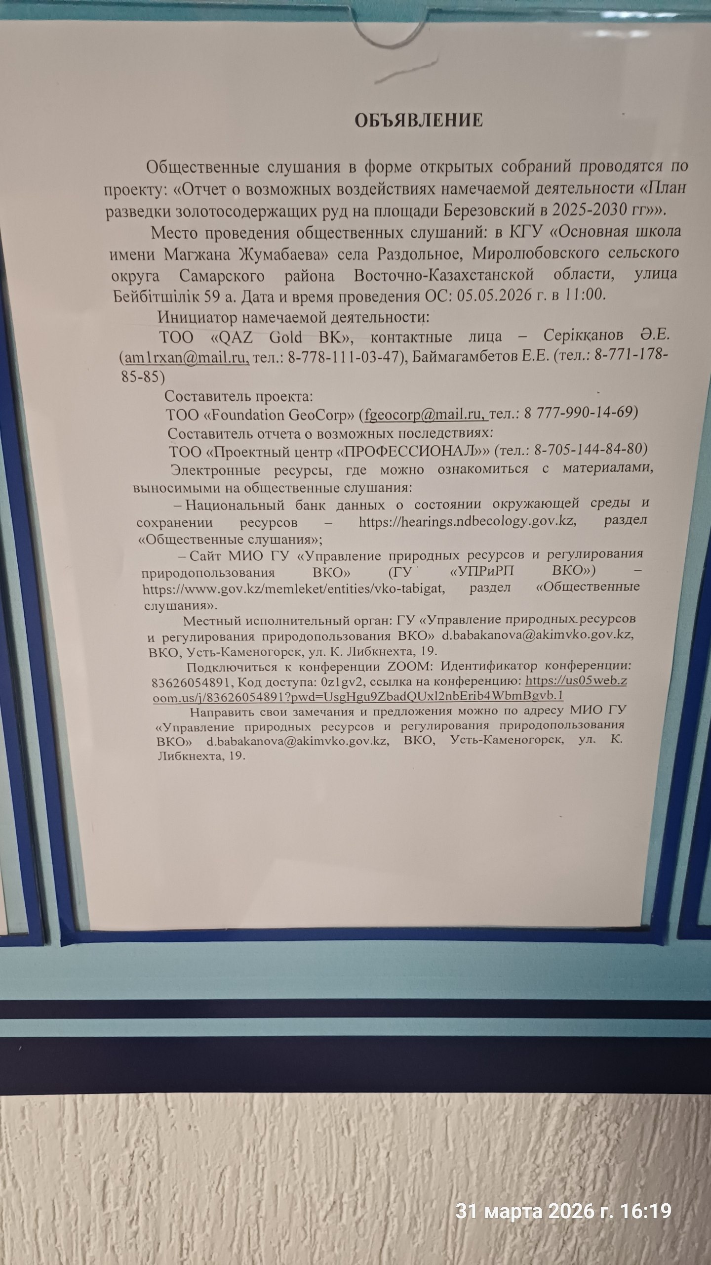 4. Повестка дня общественных слушаний: Намечаемая деятельность, предусмотренная проектной документацией «План разведки золотосодержащих руд на Березовской площади Самарский район, ВКО РК», планируемая к осуществлению ТОО «QAZ Gold BK» (далее – Инициатор намечаемой деятельности, Инициатор или предприятие) в соответствии с требованиями Экологического кодекса Республики Казахстан от 2 января 2021 года № 400-VI ЗРК (далее – ЭК РК) подлежит проведению обязательной процедуры скрининга воздействия намечаемой деятельности (п. 2.3 Раздела 2 Приложения 1 к ЭК РК) – разведка твердых полезных ископаемых с извлечением горной массы и перемещением почвы для целей оценки ресурсов твердых полезных ископаемых. В соответствии с требованиями п. 1 ст. 68 ЭК РК Инициатором было подано Заявление о намечаемой деятельности № KZ70RYS01561005 от 27.01.2026 г. РГУ «Департамент экологии по Восточно-Казахстанской области Комитета экологического регулирования и контроля Мини- стерства экологии и природных ресурсов Республики Казахстан» (далее – Департамент экологии) для проведения процедуры скрининга воздействия намечаемой деятельности По результатам скрининга Департаментом экологии было выдано Заключение об определении сферы охвата оценки воздействия на окружающую среду и (или) скрининга воздействий намечаемой деятельности с Заключением о сфере охвата оценки воздействия на окружающую среду № KZ11VWF00518813 от 25.06.2026 г. (далее – Заключение о сфере охвата), содержащее выводы о необходимости проведения обязательной процедуры оценки воздействия на окружающую среду (далее – ОВОС). Согласно Заключению о сфере охвата согласно пп. 7.12, п. 7, раздела 2 Приложения 2 ЭК РК проведение разведки твердых полезных ископаемых относится к объектам II категории. В рамках настоящего проекта Отчёта о возможных воздействиях рассмотрены результаты оценки воздействия намечаемой деятельности, предусмотренной Планом разведки золотосодержащих руд на Березовской площади Самарский район, ВКО РК, планируемой к осуществлению ТОО «QAZ Gold BK», с учётом требований действующего экологического законодательства и требований, отражённых в Заключении о сфере охвата. По результатам проведённой ОВОС намечаемой деятельности результирующее значение оказываемого воздействия оценивается как допустимое и возможное к реализации.