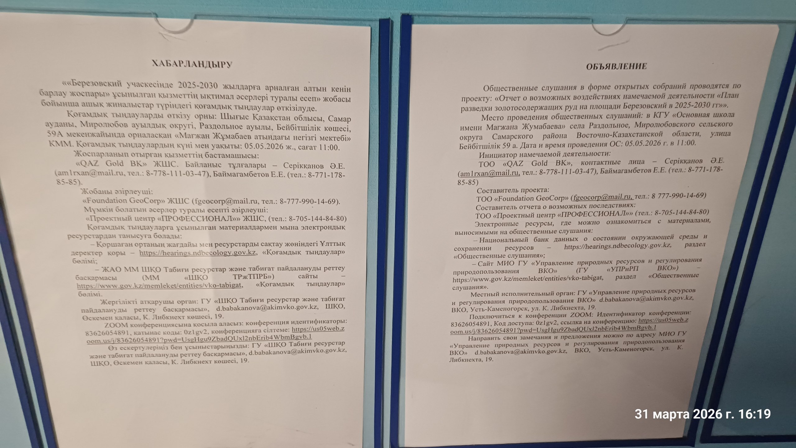 3. Общественные слушания организованны: Управление природных ресурсов и регулирования природопользования Восточно-Казахстанской области, d.babakanova@akimvko.gov.kz,