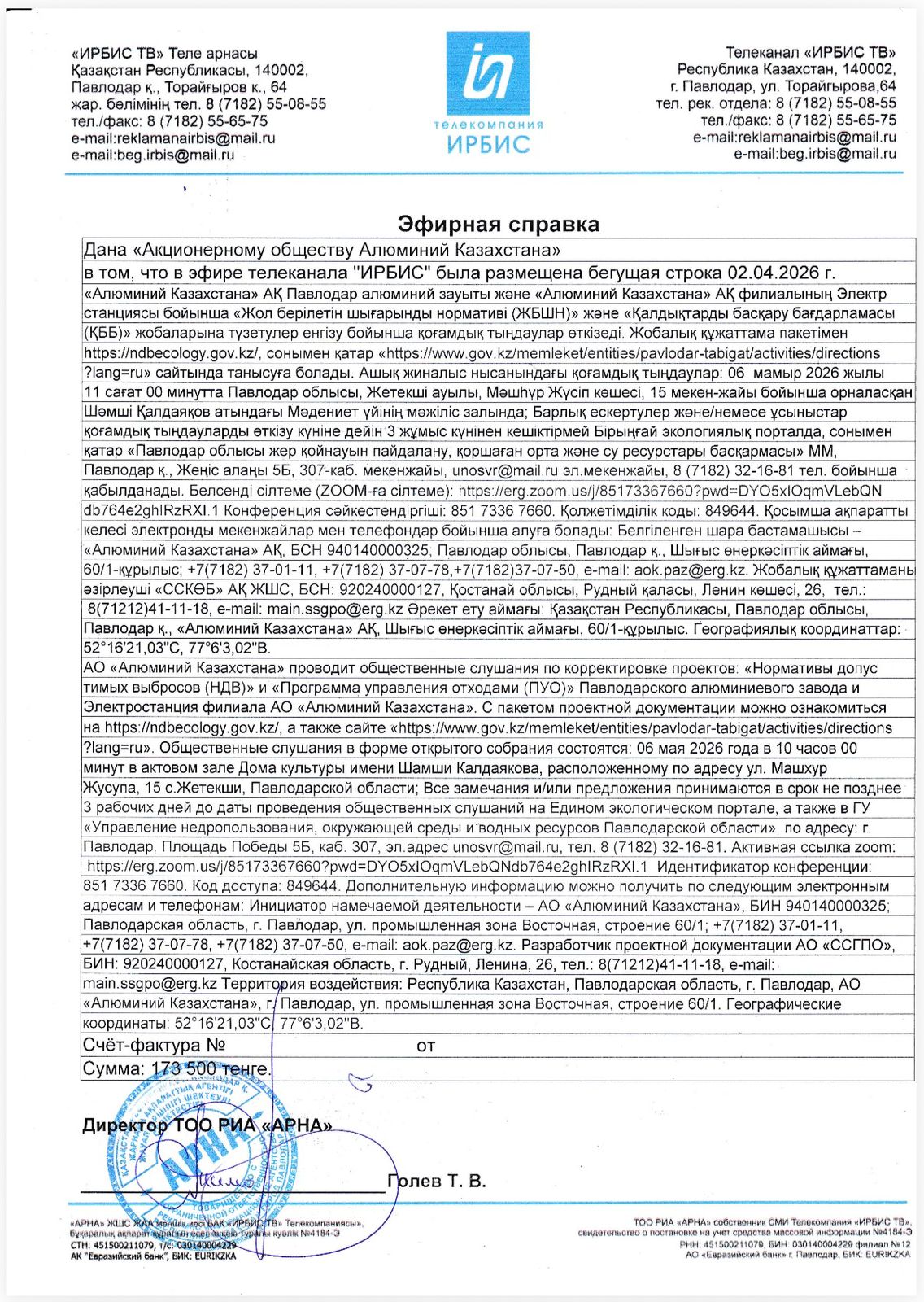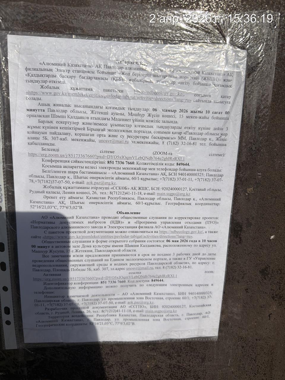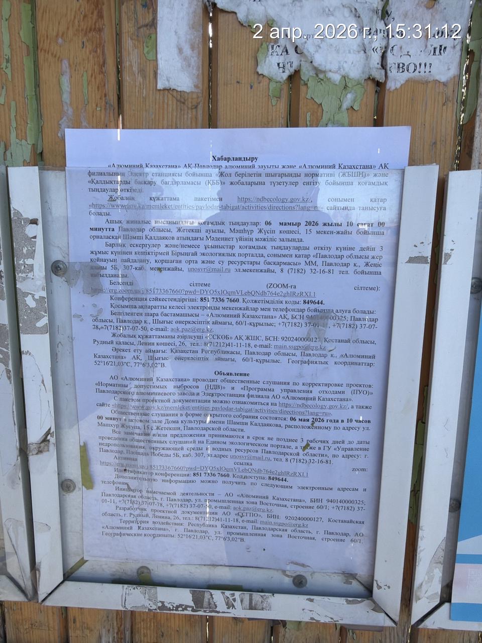 По проекту: корректировка проектов: «Нормативы допустимых выбросов (НДВ)» и «Программа управления отходами (ПУО)» Павлодарского алюминиевого завода и Электростанция филиала АО «Алюминий Казахстана».