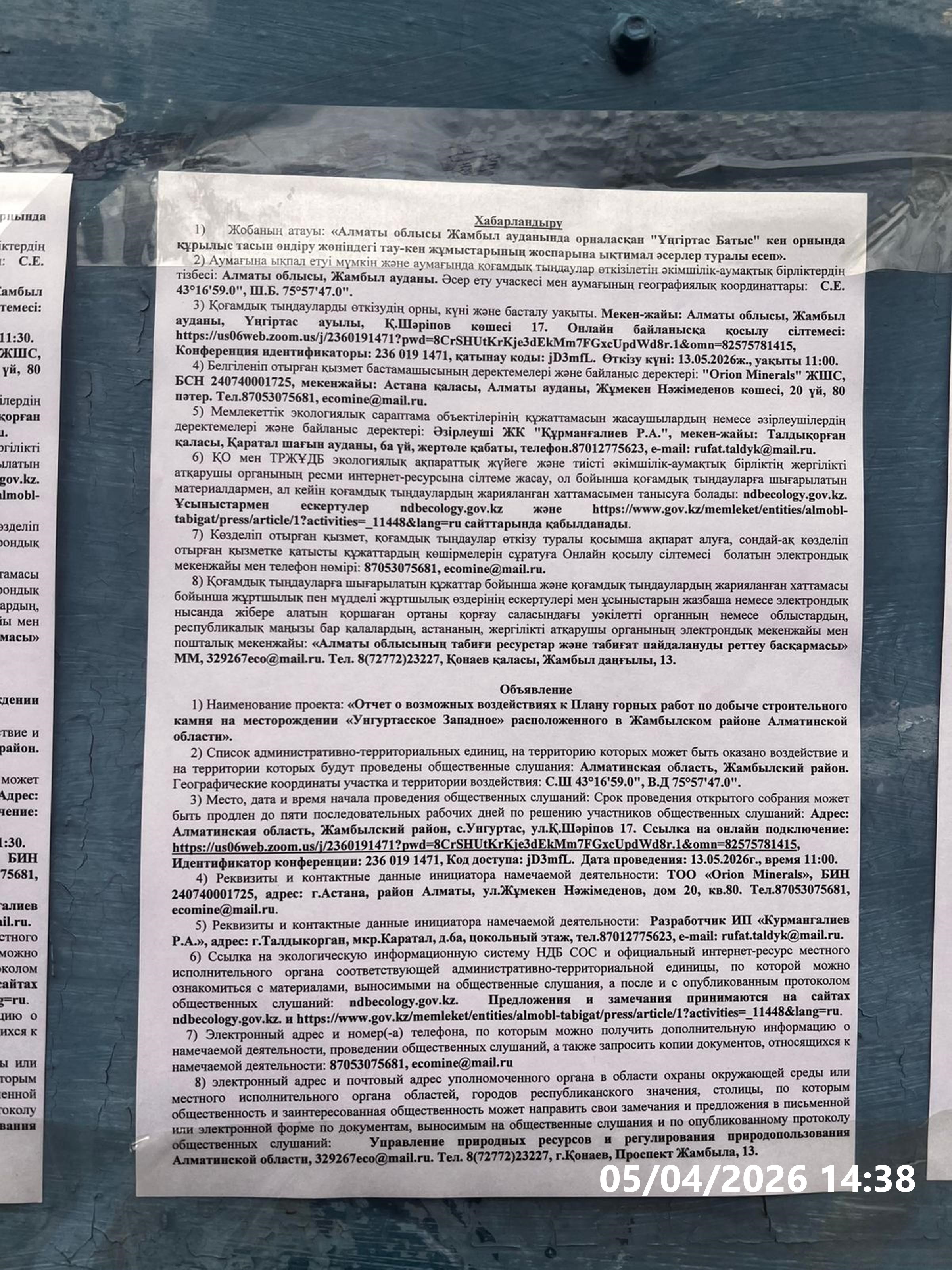 3. Общественные слушания организованны: Управление природных ресурсов и регулирования природопользования Алматинской области, 329267eco@mail.ru,