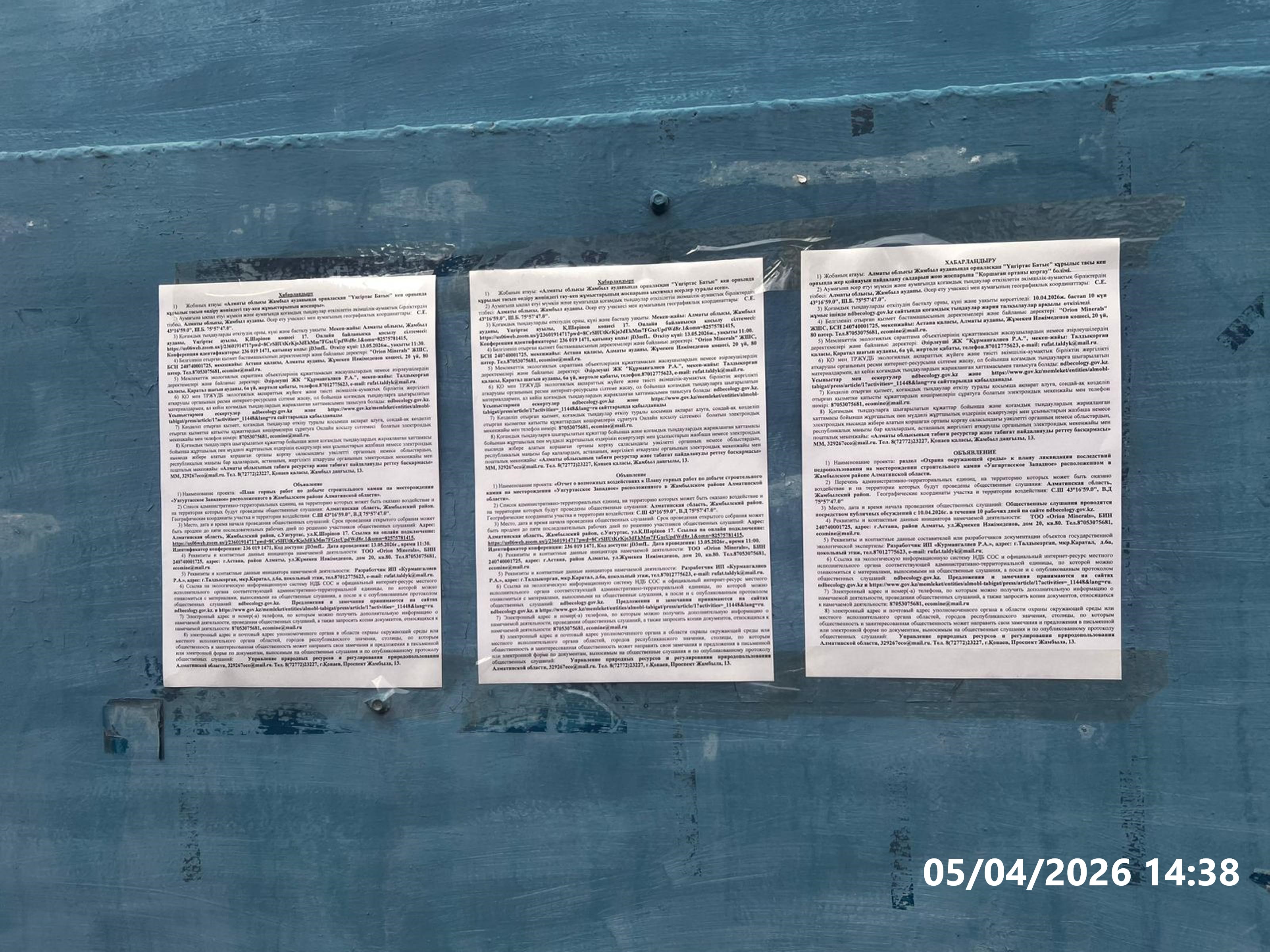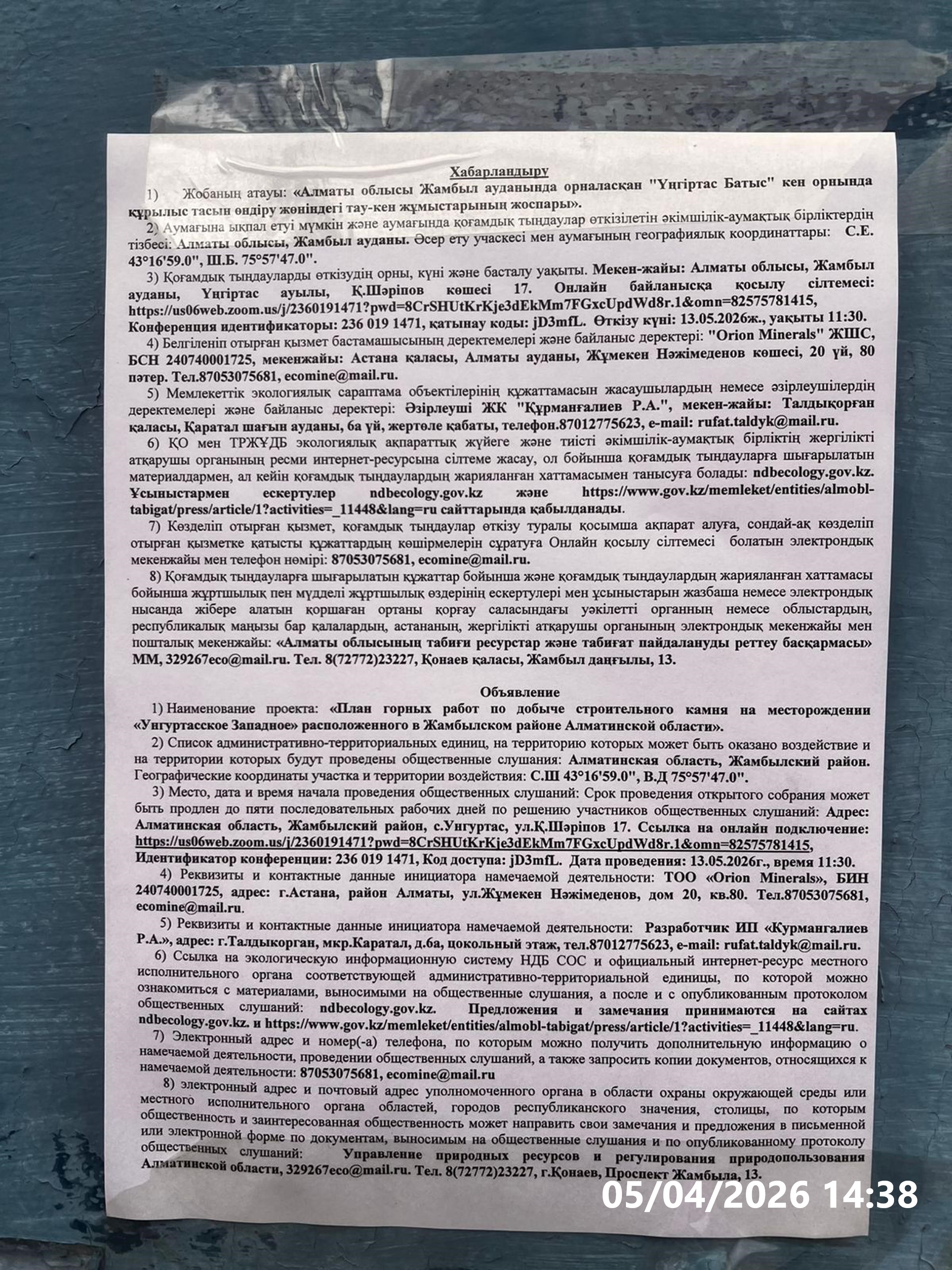 3. Общественные слушания организованны: Управление природных ресурсов и регулирования природопользования Алматинской области, 329267eco@mail.ru,