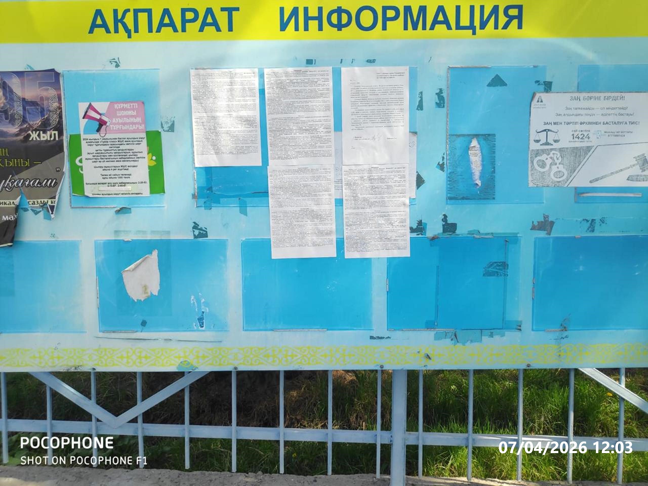 6.3. расположение мест, специально предназначенных для Размещения печатных объявлений (доски объявлений): Доска объявлений Акимата