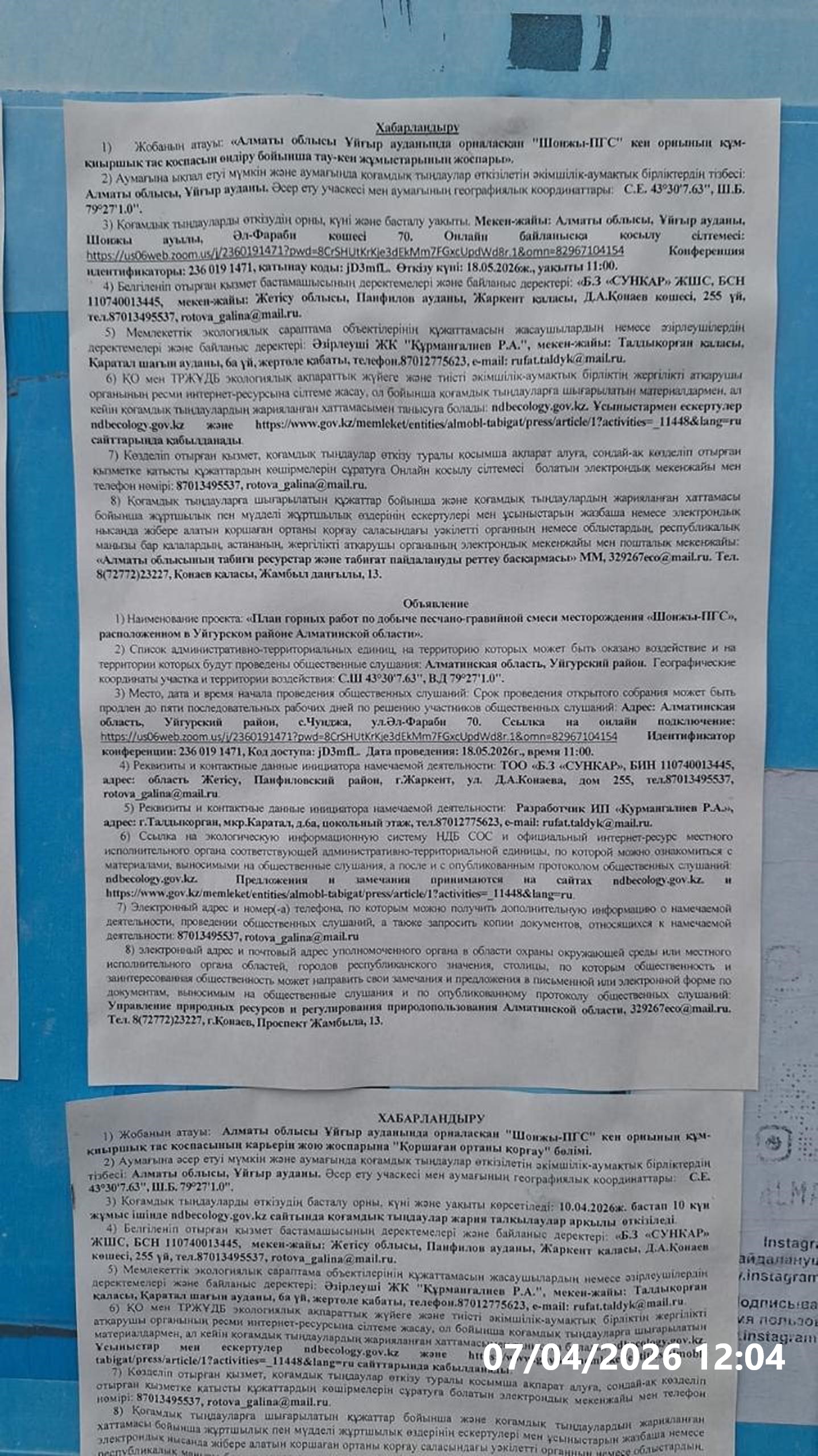 3. Общественные слушания организованны: Управление природных ресурсов и регулирования природопользования Алматинской области, 329267eco@mail.ru,