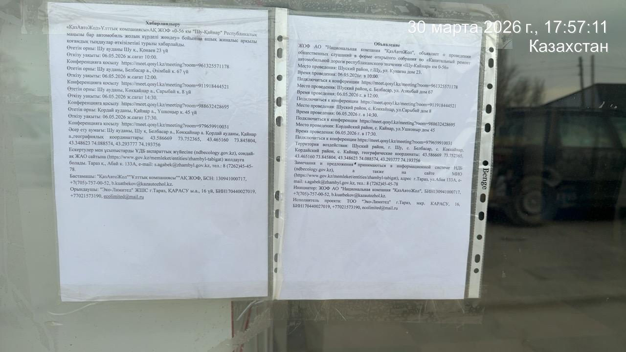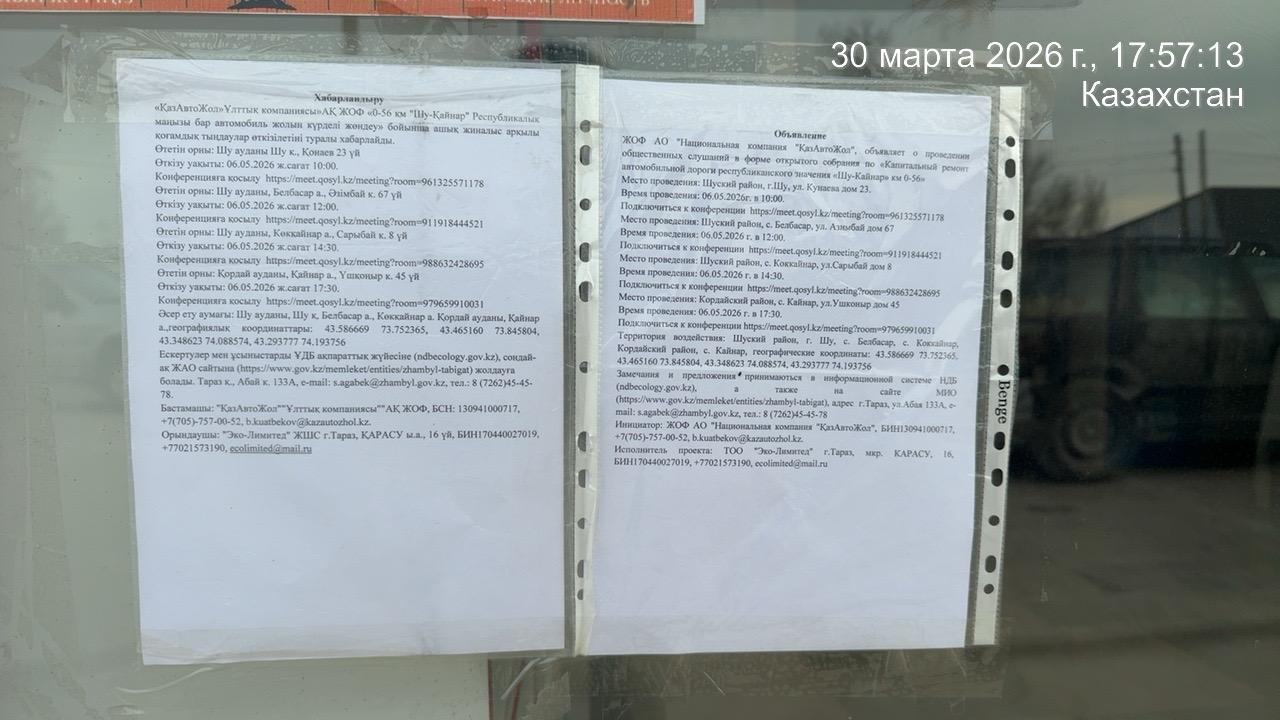 3. Общественные слушания организованны: Управление природных ресурсов и регулирования природопользования Жамбылской области, s.agabek@zhambyl.gov.kz,