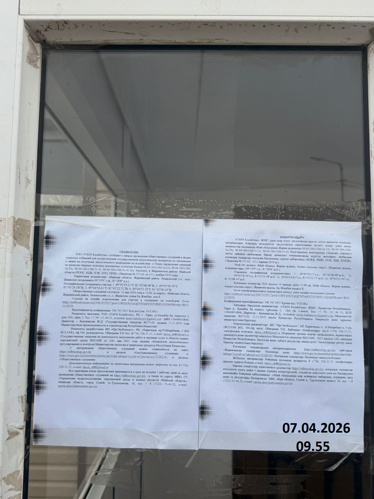 3. Общественные слушания организованны: Главный специалист УПР и ПР область Абай, prirodnyye_resursy_obl.abay@mail.ru,