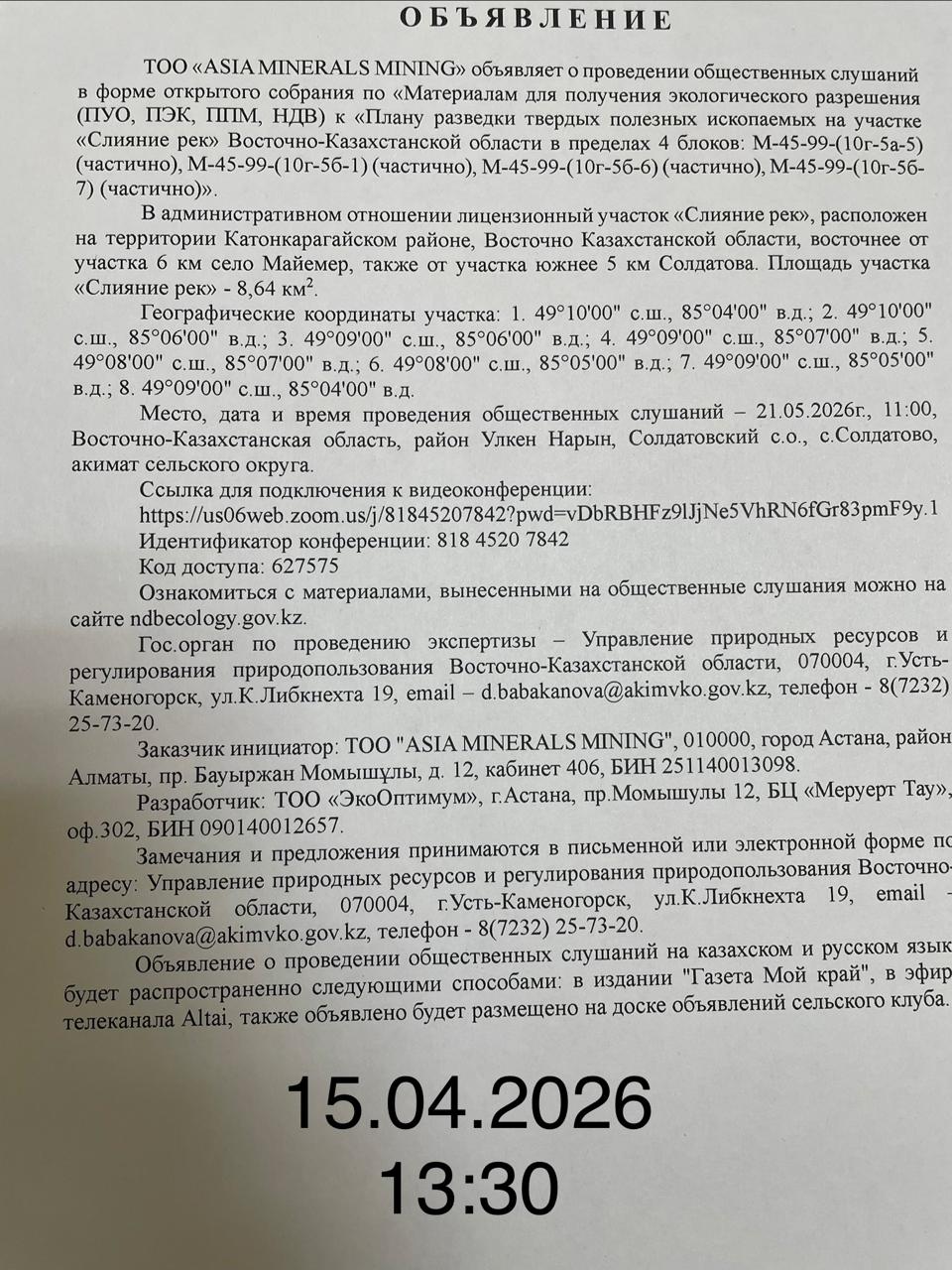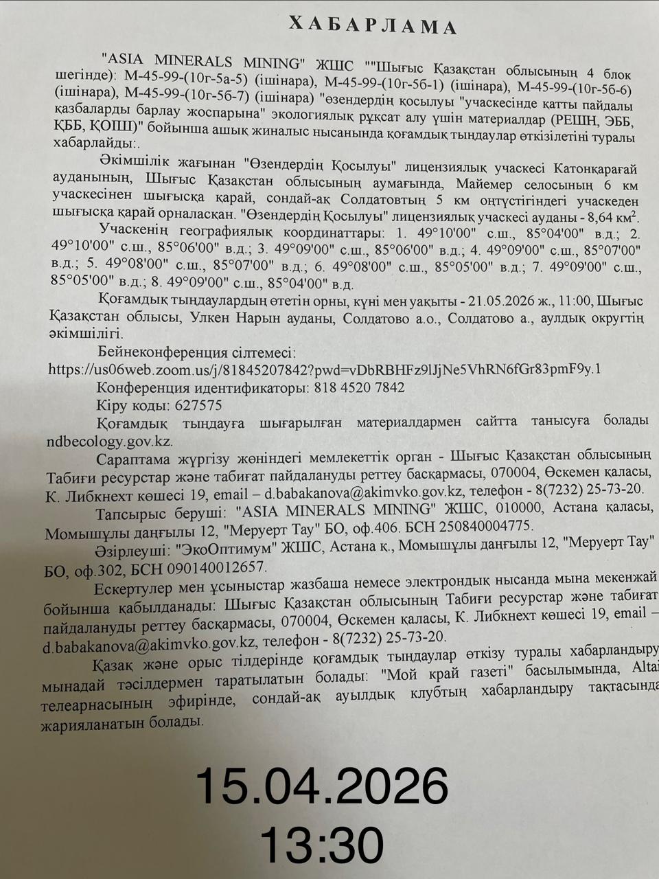 3. Общественные слушания организованны: Управление природных ресурсов и регулирования природопользования Восточно-Казахстанской области, d.babakanova@akimvko.gov.kz,