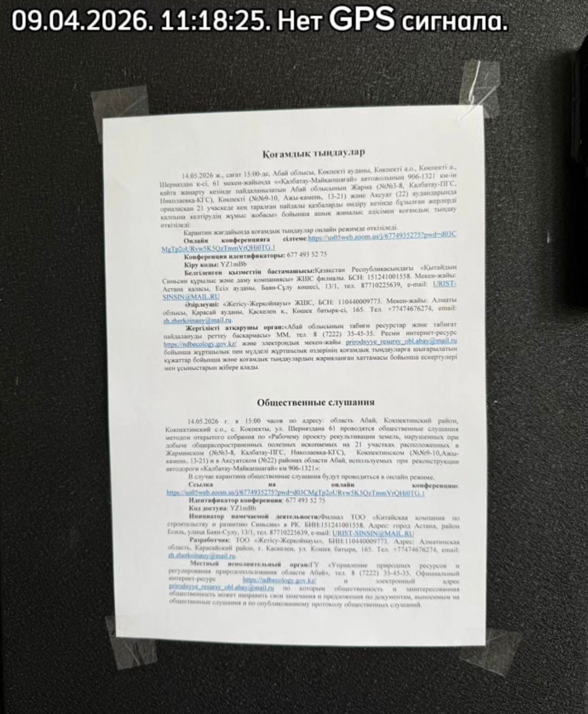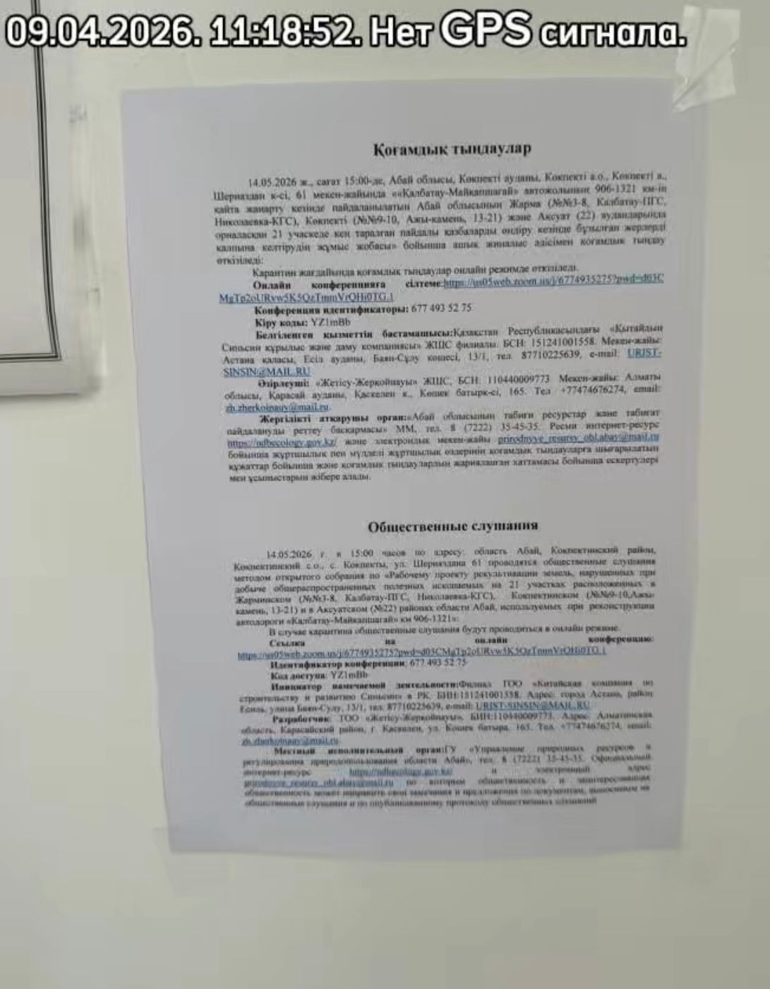 4. Повестка дня общественных слушаний: ««Қалбатау-Майқапшағай» автожолының 906-1321 км-ін қайта жаңарту кезінде пайдаланылатын Абай облысының Жарма (№№3-8, Калбатау-ПГС, Николаевка-КГС), Көкпекті (№№9-10, Ажы-камень, 13-21) және Ақсуат (22) аудандарында орналасқан 21 учаскеде кең таралған пайдалы қазбаларды өндіру кезінде бұзылған жерлерді қалпына келтірудің жұмыс жобасы» бойынша ашық жиналыс әдісімен қоғамдық тыңдау өткізіледі: 1) 14.05.2026 ж., сағат 11:00-де, Абай облысы, Жарма ауданы, Қаратөбе а.о., Кентарлау а., Сәтпаев к-сі 32 мекен-жайы бойынша орналасқан «Шар негізгі мектебі» КММ-де. 2) 14.05.2026 ж., сағат 15:00-де, Абай облысы, Көкпекті ауданы, Көкпекті а.о., Көкпекті а., Шериаздан к-сі, 61 мекен-жайында. 3) 15.05.2026 ж., сағат 11:00-де, Абай облысы, Ақсуат ауданы, Ырғызбай а.о., Жантікей а., Бейбітшілік к-сі, 6А. Карантин жағдайында қоғамдық тыңдаулар онлайн режимде өткізіледі. Онлайн конференцияға сілтеме:https://us05web.zoom.us/j/6774935275?pwd=d03C MgTp2oURvw5K5QzTmmVrQHi0TG.1 Конференция идентификаторы: 677 493 52 75 Кіру коды: YZ1mBb Белгіленген қызметтің бастамашысы:Қазақстан Республикасындағы «Қытайдың Синьсин құрылыс және даму компаниясы» ЖШС филиалы. БСН: 151241001558. Мекен-жайы: Астана қаласы, Есіл ауданы, Баян-Сұлу көшесі, 13/1, тел. 87710225639, e-mail: URIST-SINSIN@MAIL.RU Әзірлеуші: «Жетісу-Жерқойнауы» ЖШС, БСН: 110440009773. Мекен-жайы: Алматы облысы, Қарасай ауданы, Қаскелең қ., Көшек батырк-сі, 165. Тел. +77474676274, email: zh.zherkoinauy@mail.ru. Жергілікті атқарушы орган:«Абай облысының табиғи ресурстар және табиғат пайдалануды реттеу басқармасы» ММ, тел. 8 (7222) 35-45-35. Ресми интернет-ресурс https://ndbecology.gov.kz/ және электрондық мекен-жайы prirodnyye_resursy_obl.abay@mail.ru бойынша жұртшылық пен мүдделі жұртшылық өздерінің қоғамдық тыңдауларға шығарылатын құжаттар бойынша және қоғамдық тыңдаулардың жарияланған хаттамасы бойынша ескертулері мен ұсыныстарын жібере алады. Проводятся общественные слушания методом открытого собрания по «Рабочему проекту рекультивации земель, нарушенных при добыче общераспространенных полезных ископаемых на 21 участках расположенных в Жарминском (№№3-8, Калбатау-ПГС, Николаевка-КГС), Кокпектинском (№№9-10,Ажы-камень, 13-21) и в Аксуатском (№22) районах области Абай, используемых при реконструкции автодороги «Калбатау-Майкапшагай» км 906-1321»: 1) 14.05.2026 г. в 11:00 часов по адресу: область Абай, Жарминский район, Каратобинский с.о., а. Кентарлау, КГУ «Чарская основная школа» по адресу: ул. Сатпаева 32. 2) 14.05.2026 г. в 15:00 часов по адресу: область Абай, Кокпектинский район, Кокпектинский с.о., с. Кокпекты, ул. Шерияздана 61. 3) 15.05.2026 г. в 11:00 часов по адресу: область Абай, район Ақсуат, Ыргызбайский с.о., с. Жантикей, ул. Бейбитшилик, 6А. В случае карантина общественные слушания будут проводиться в онлайн режиме. Ссылка на онлайн конференцию: https://us05web.zoom.us/j/6774935275?pwd=d03CMgTp2oURvw5K5QzTmmVrQHi0TG.1 Идентификатор конференции: 677 493 52 75 Код доступа: YZ1mBb Инициатор намечаемой деятельности:Филиал ТОО «Китайская компания по строительству и развитию Синьсин» в РК. БИН:151241001558. Адрес: город Астана, район Есиль, улица Баян-Сулу, 13/1, тел. 87710225639, e-mail: URIST-SINSIN@MAIL.RU Разработчик: ТОО «Жетісу-Жерқойнауы», БИН:110440009773. Адрес: Алматинская область, Карасайский район, г. Каскелен, ул. Кошек батыра, 165. Тел. +77474676274, email: zh.zherkoinauy@mail.ru. Местный исполнительный орган:ГУ «Управление природных ресурсов и регулирования природопользования области Абай», тел. 8 (7222) 35-45-35. Официальный интернет-ресурс https://ndbecology.gov.kz/ и электро