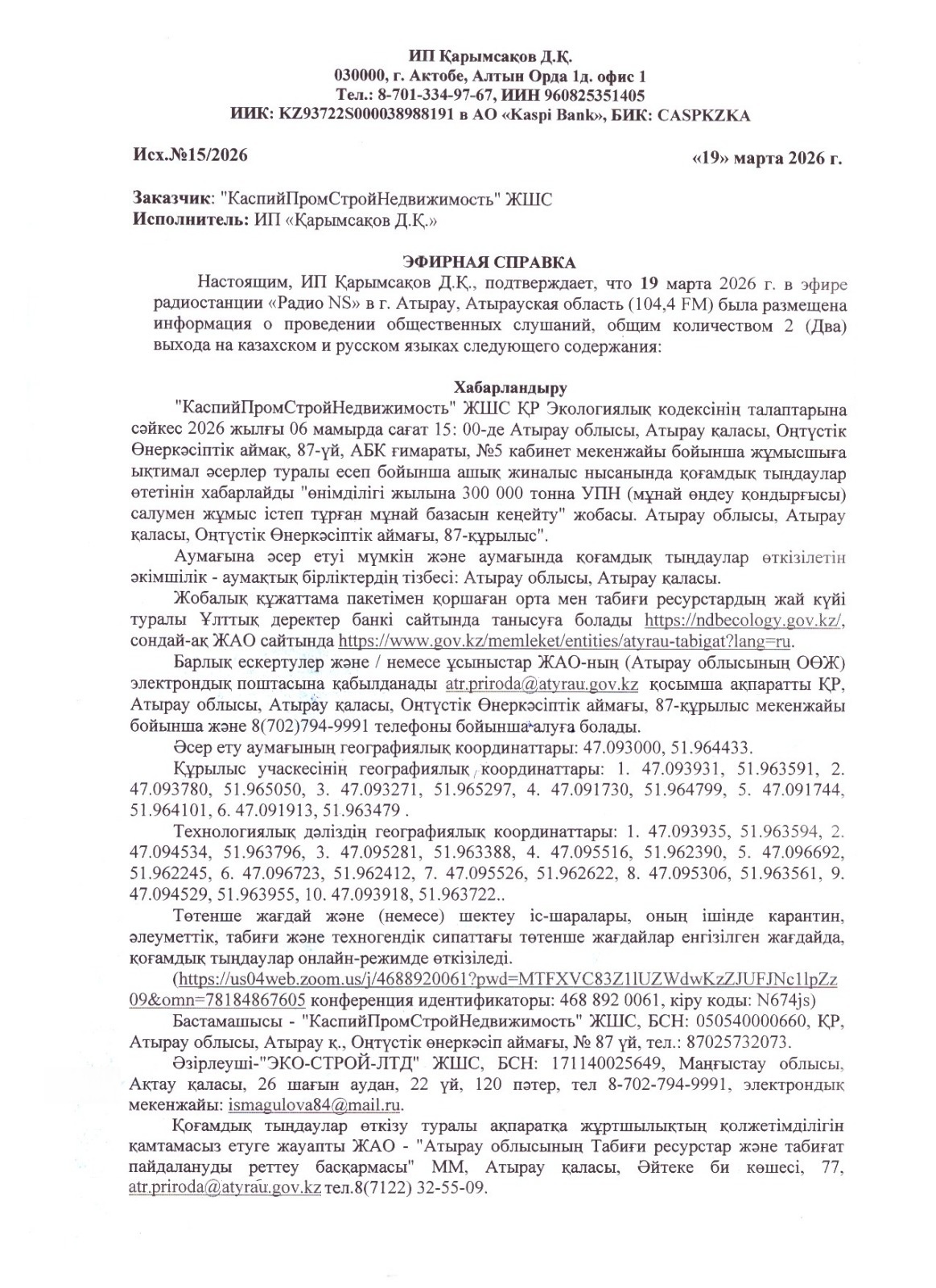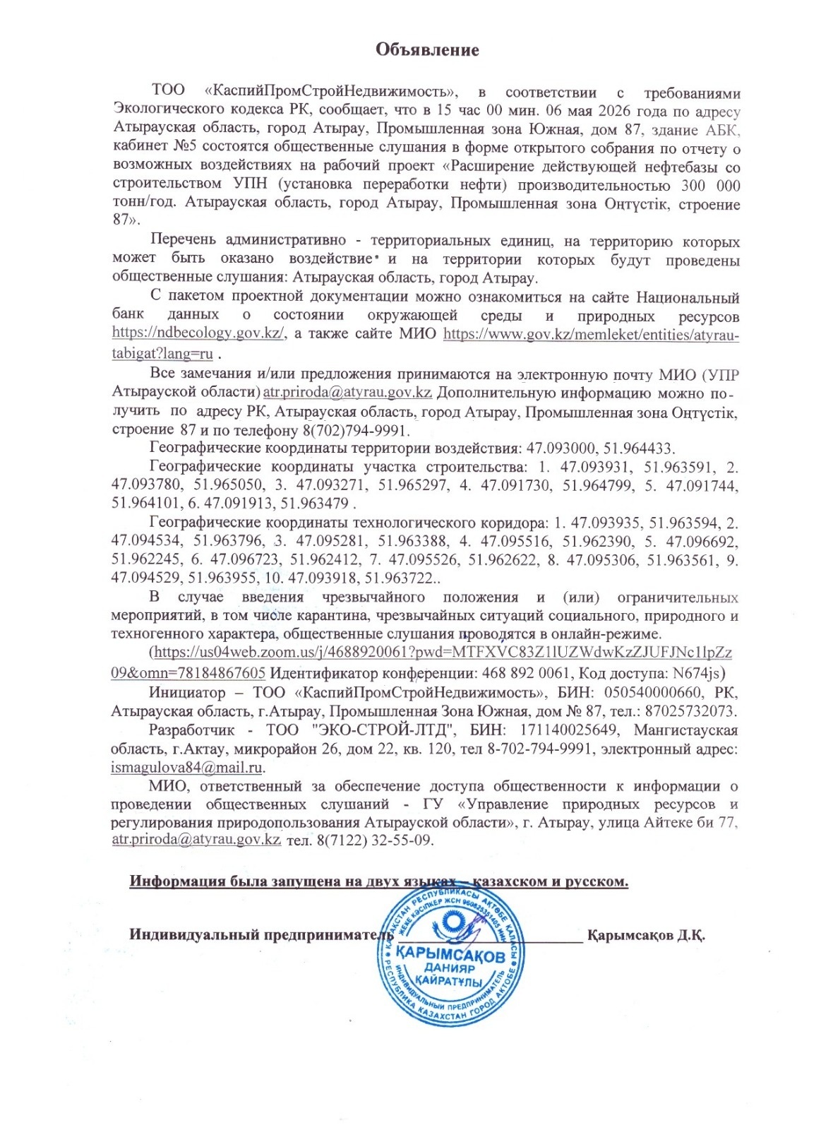 3. Общественные слушания организованны: Управление природных ресурсов и регулирования природопользования Атырауской области, atr.priroda@atyrau.gov.kz,