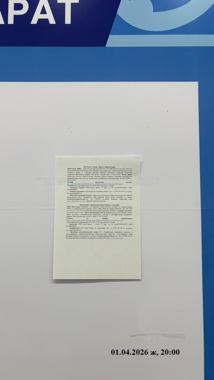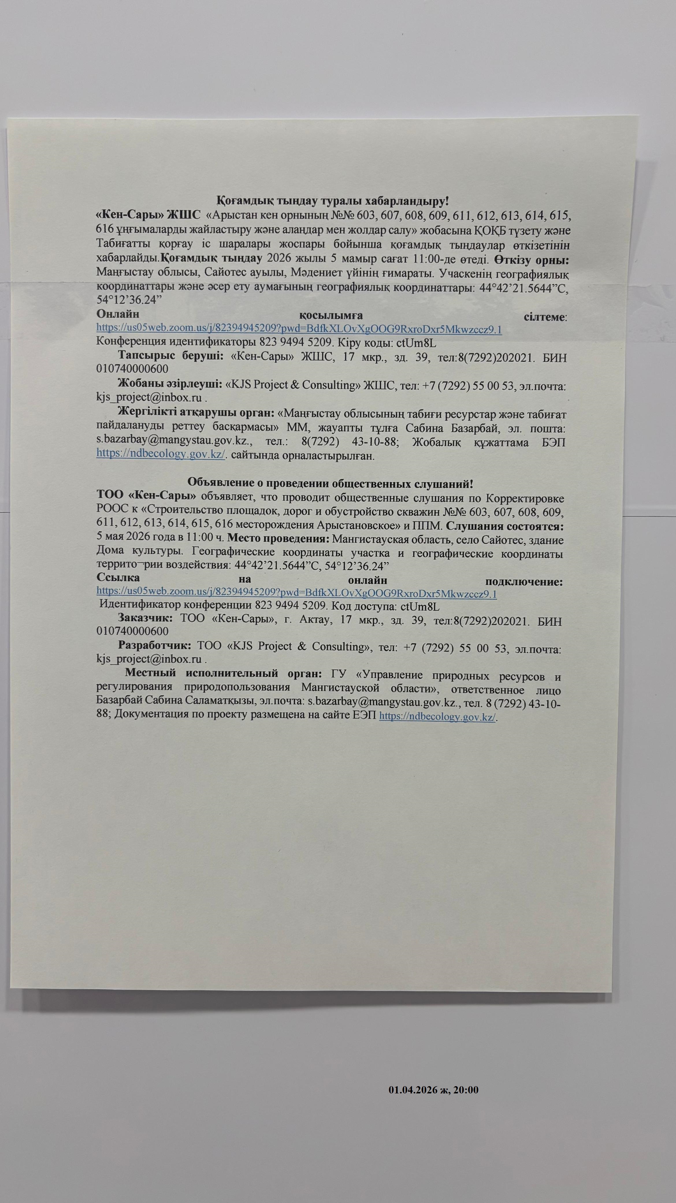 3. Общественные слушания организованны: Управление природных ресурсов и регулирования природопользования Мангистауской области, s.bazarbay@mangystau.gov.kz,