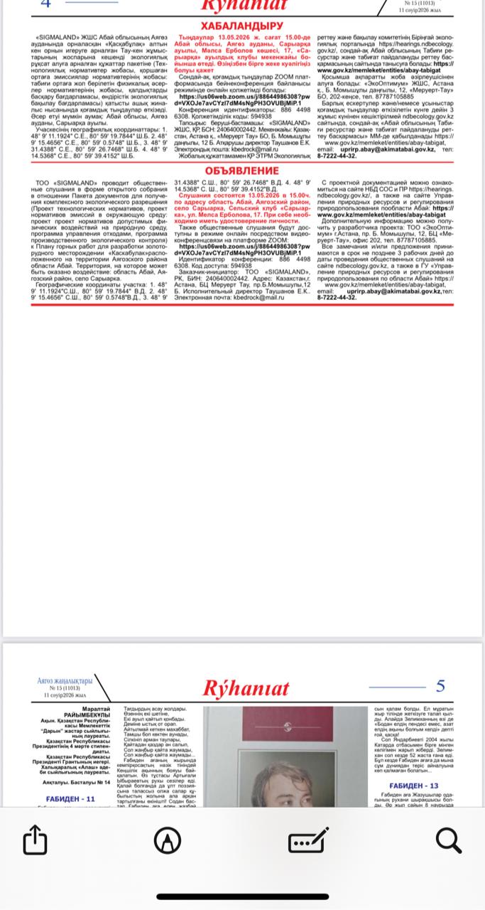 По проекту: ТОО «SIGMALAND» проводит общественные слушания в форме открытого собрания по пакету документов (ПНЭ, ПУО, ПЭК, ППМ, ПТН, Проект нормативов допустимых физических воздействий, План мероприятий по повышению энергоэффективности и энергосбережению) для получения комплексного экологического разрешения по проекту к Плану горных работ для разработки золоторудного месторождении «Каскабулак».