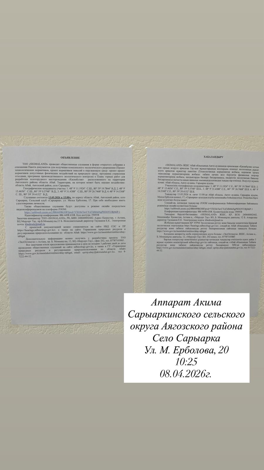 6. Объявление о проведении общественных слушаний на казахском и русском языках будет распространено следующими способами: