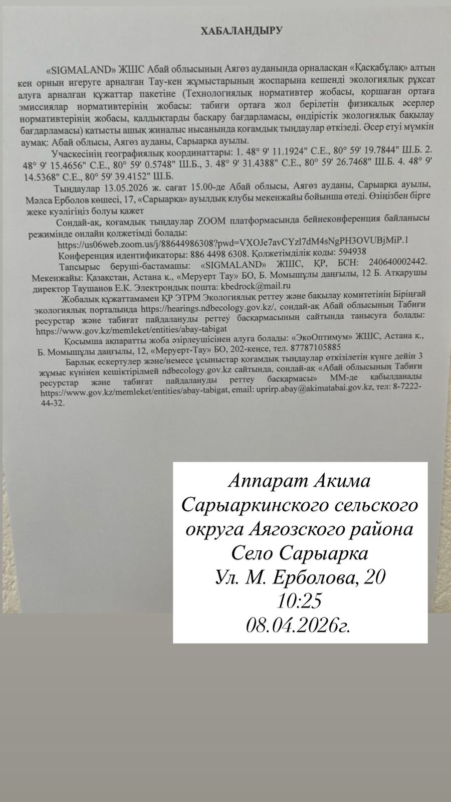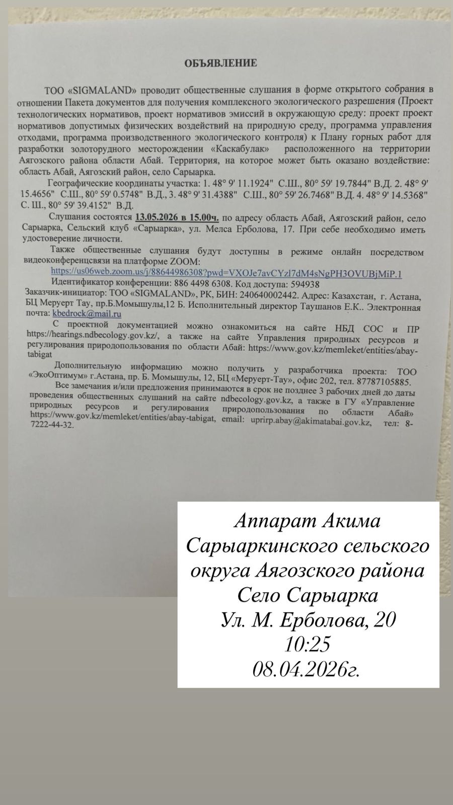 3. Общественные слушания организованны: Главный специалист УПР и ПР область Абай, prirodnyye_resursy_obl.abay@mail.ru,