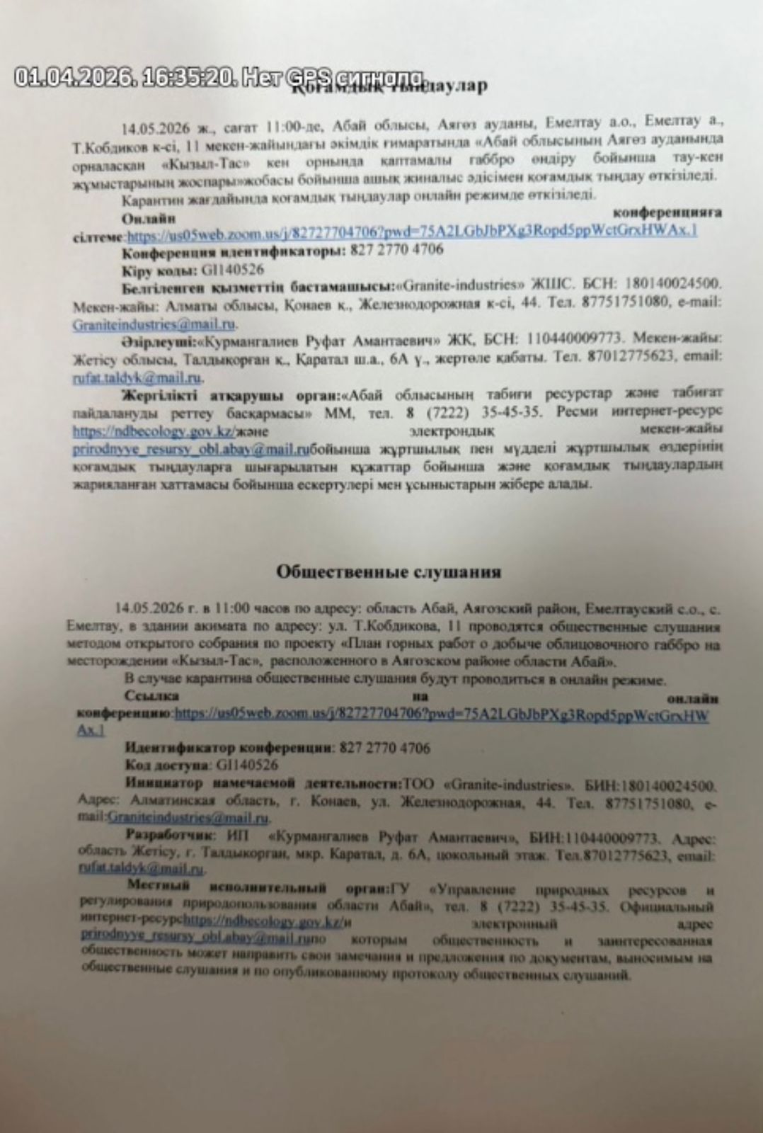4. Повестка дня общественных слушаний: 14.05.2026 ж., сағат 11:00-де, Абай облысы, Аягөз ауданы, Емелтау а.о., Емелтау а., Т.Кобдиков к-сі, 11 мекен-жайындағы әкімдік ғимаратында «Абай облысының Аягөз ауданында орналасқан «Кызыл-Тас» кен орнында қаптамалы габбро өндіру бойынша тау-кен жұмыстарының жоспары» жобасы бойынша ашық жиналыс әдісімен қоғамдық тыңдау өткізіледі. Карантин жағдайында қоғамдық тыңдаулар онлайн режимде өткізіледі. Онлайн конференцияға сілтеме: https://us05web.zoom.us/j/82727704706?pwd =75A2LGbJbPXg3Ropd5ppWctGrxHWAx.1 Конференция идентификаторы: 827 2770 4706 Кіру коды: GI140526 Белгіленген қызметтің бастамашысы: «Granite-industries» ЖШС. ЖСН: 830514301679. Мекен-жайы: Алматы облысы, Қонаев қ., Железнодорожная к-сі, 44. Тел. 87751751080, e-mail: Graniteindustries@mail.ru. Әзірлеуші: «Курмангалиев Руфат Амантаевич» ЖК, БСН: 110440009773. Мекен-жайы: Жетісу облысы, Талдықорған қ., Қаратал ш.а., 6А ү., жертөле қабаты. Тел. 87012775623, email: rufat.taldyk@mail.ru. Жергілікті атқарушы орган: «Абай облысының табиғи ресурстар және табиғат пайдалануды реттеу басқармасы» ММ, тел. 8 (7222) 35-45-35. Ресми интернет-ресурс https://ndbecology.gov.kz/ және электрондық мекен-жайы prirodnyye_resursy_obl.abay@mail.ru бойынша жұртшылық пен мүдделі жұртшылық өздерінің қоғамдық тыңдауларға шығарылатын құжаттар бойынша және қоғамдық тыңдаулардың жарияланған хаттамасы бойынша ескертулері мен ұсыныстарын жібере алады. 14.05.2026 г. в 11:00 часов по адресу: область Абай, Аягозский район, Емелтауский с.о., с. Емелтау, в здании акимата по адресу: ул. Т.Кобдикова, 11 проводятся общественные слушания методом открытого собрания по проекту «План горных работ о добыче облицовочного габбро на месторождении «Кызыл-Тас», расположенного в Аягозском районе области Абай». В случае карантина общественные слушания будут проводиться в онлайн режиме. Ссылка на онлайн конференцию: https://us05web.zoom.us/j/82727704706?pwd= 75A2LGbJbPXg3Ropd5ppWctGrxHWAx.1 Идентификатор конференции: 827 2770 4706 Код доступа: GI140526 Инициатор намечаемой деятельности: ТОО «Granite-industries». БИН: 180140024500. Адрес: Алматинская область, г. Конаев, ул. Железнодорожная, 44. Тел. 87751751080, e-mail: Graniteindustries@mail.ru. Разработчик: ИП «Курмангалиев Руфат Амантаевич», БИН:110440009773. Адрес: область Жетісу, г. Талдыкорган, мкр. Каратал, д. 6А, цокольный этаж. Тел. 87012775623, email: rufat.taldyk@mail.ru. Местный исполнительный орган:ГУ «Управление природных ресурсов и регулирования природопользования области Абай», тел. 8 (7222) 35-45-35. Официальный интернет-ресурс https://ndbecology.gov.kz/ и электронный адрес prirodnyye_resursy_obl.abay@mail.ru по которым общественность и заинтересованная общественность может направить свои замечания и предложения по документам, выносимым на общественные слушания и по опубликованному протоколу общественных слушаний.