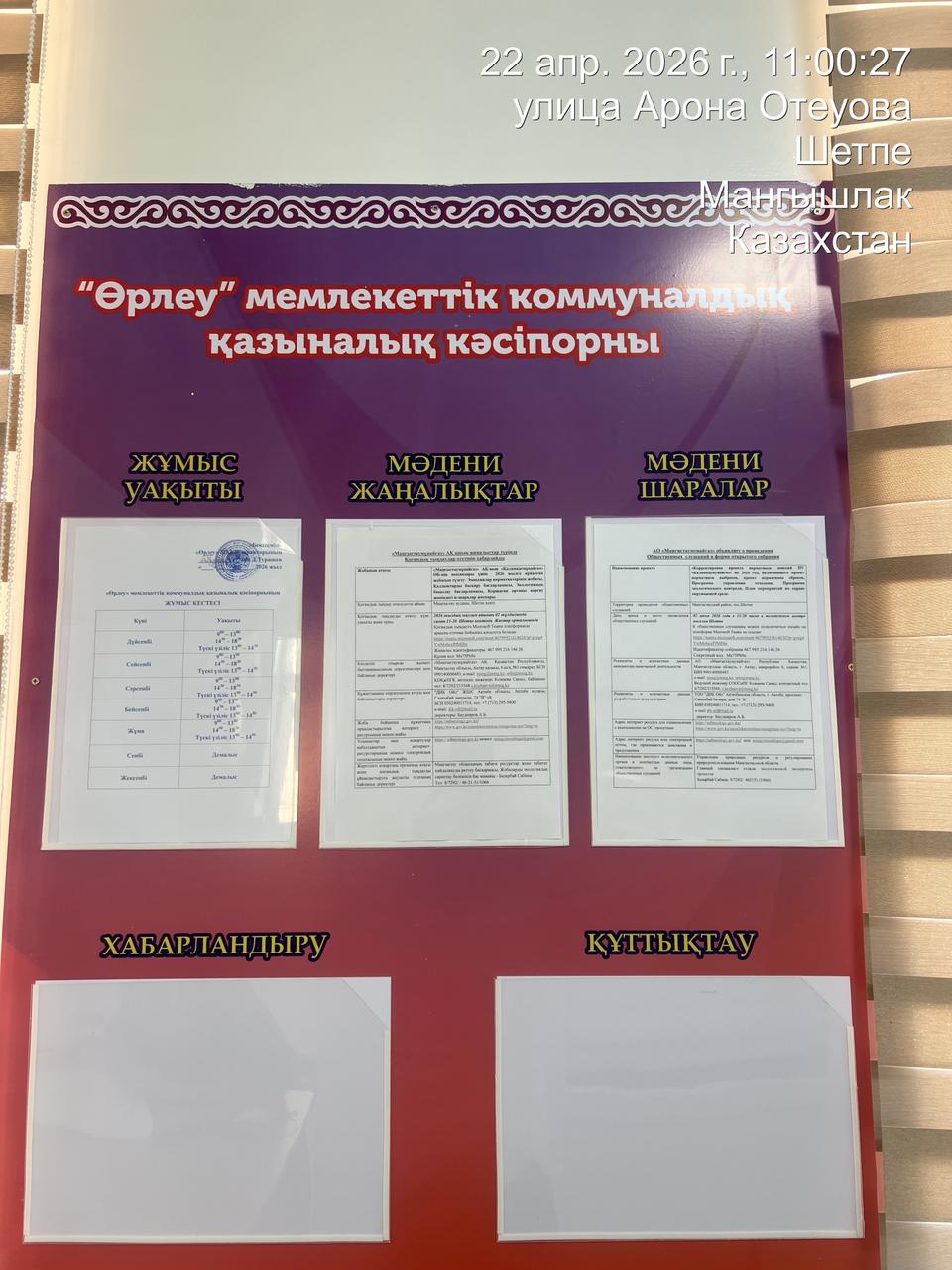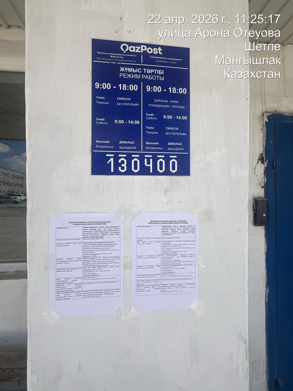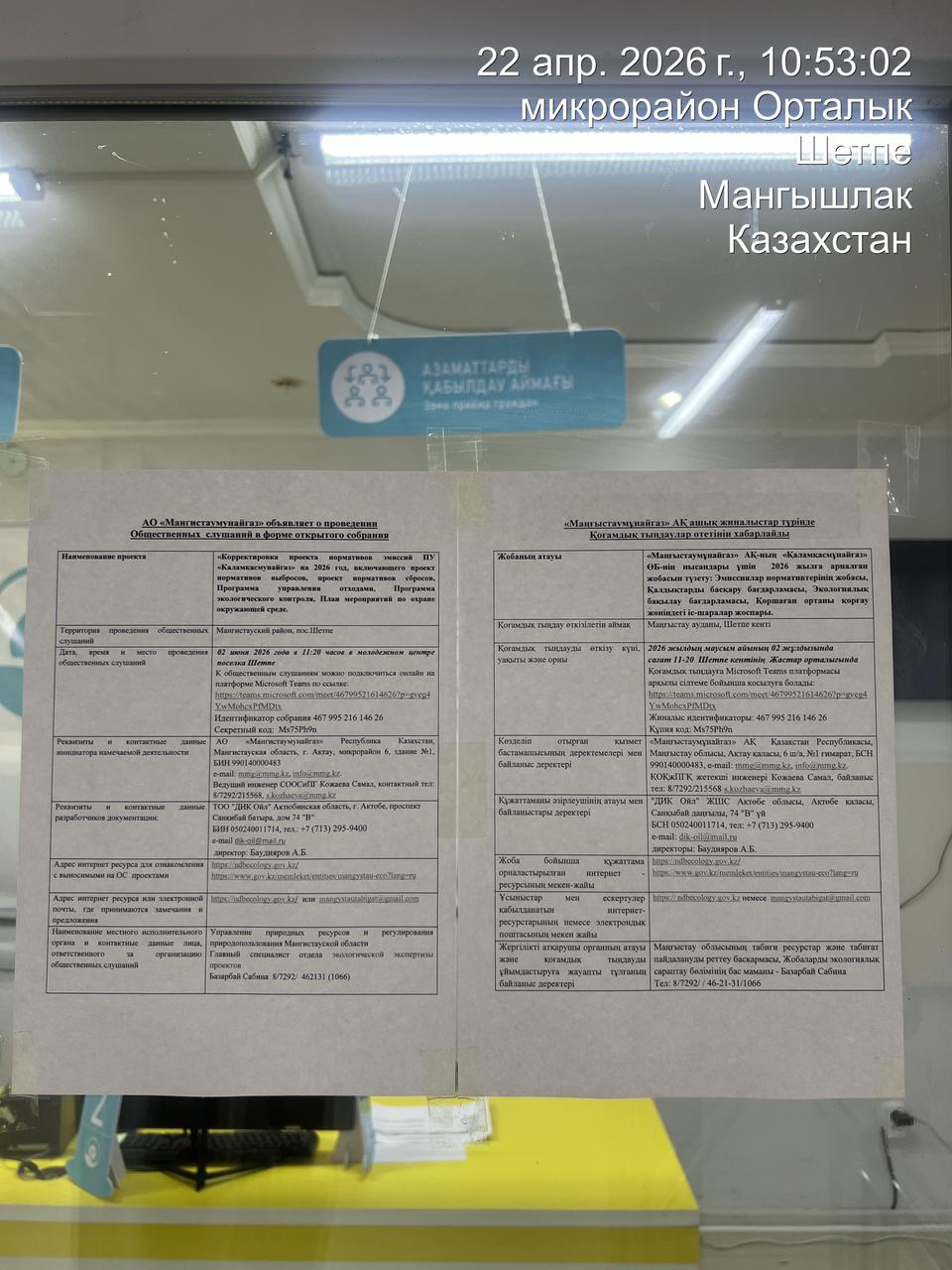 3. Общественные слушания организованны: Управление природных ресурсов и регулирования природопользования Мангистауской области, s.bazarbay@mangystau.gov.kz,