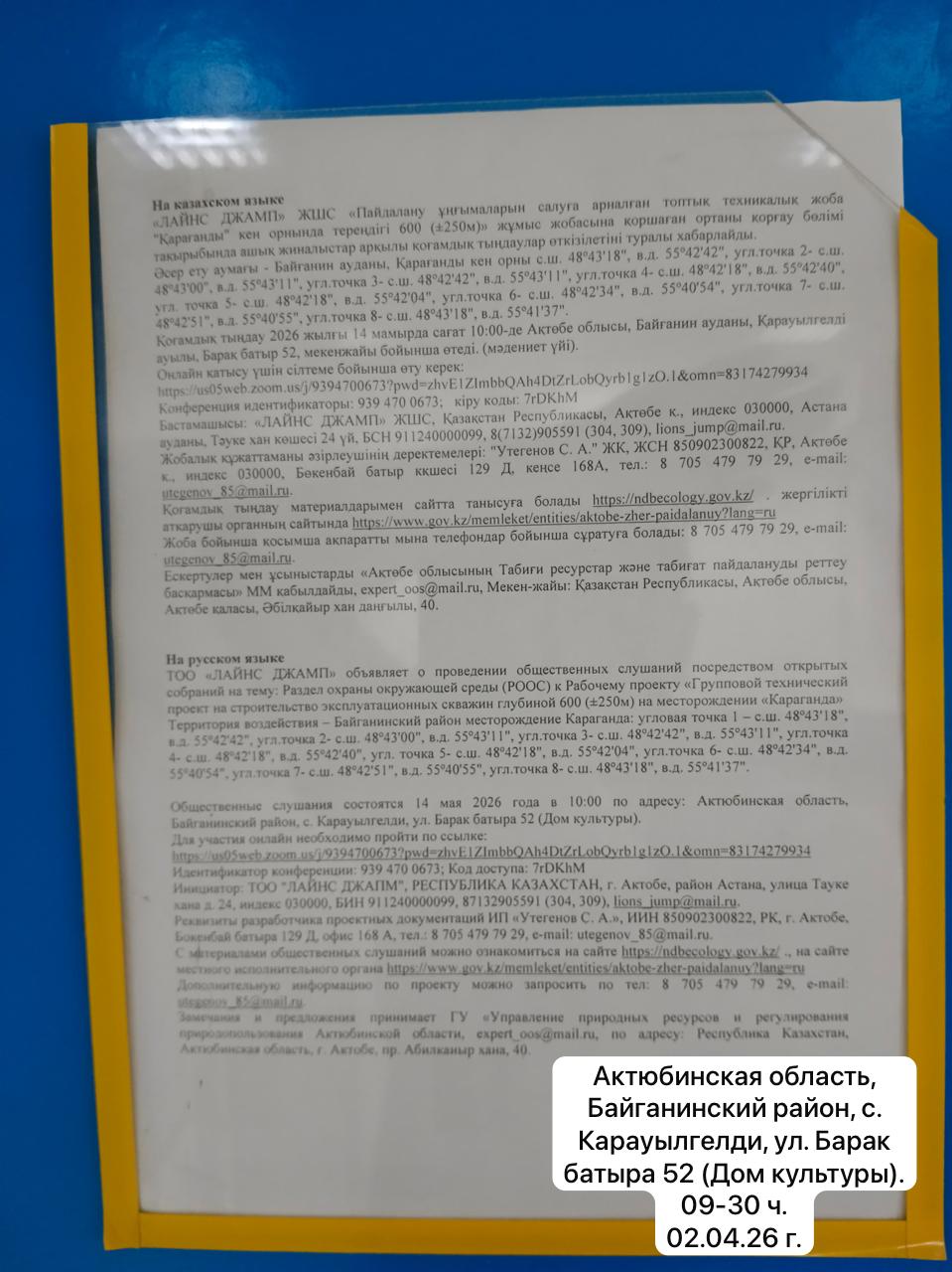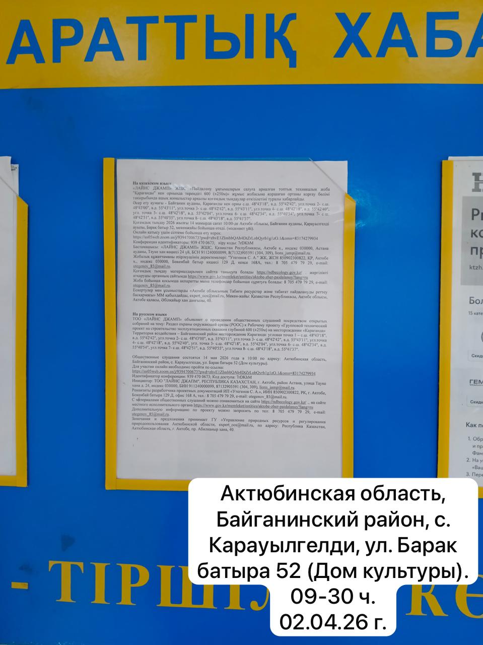 3. Общественные слушания организованны: Управление природных ресурсов и регулирования природопользования Актюбинской области, expert_oos@mail.ru,