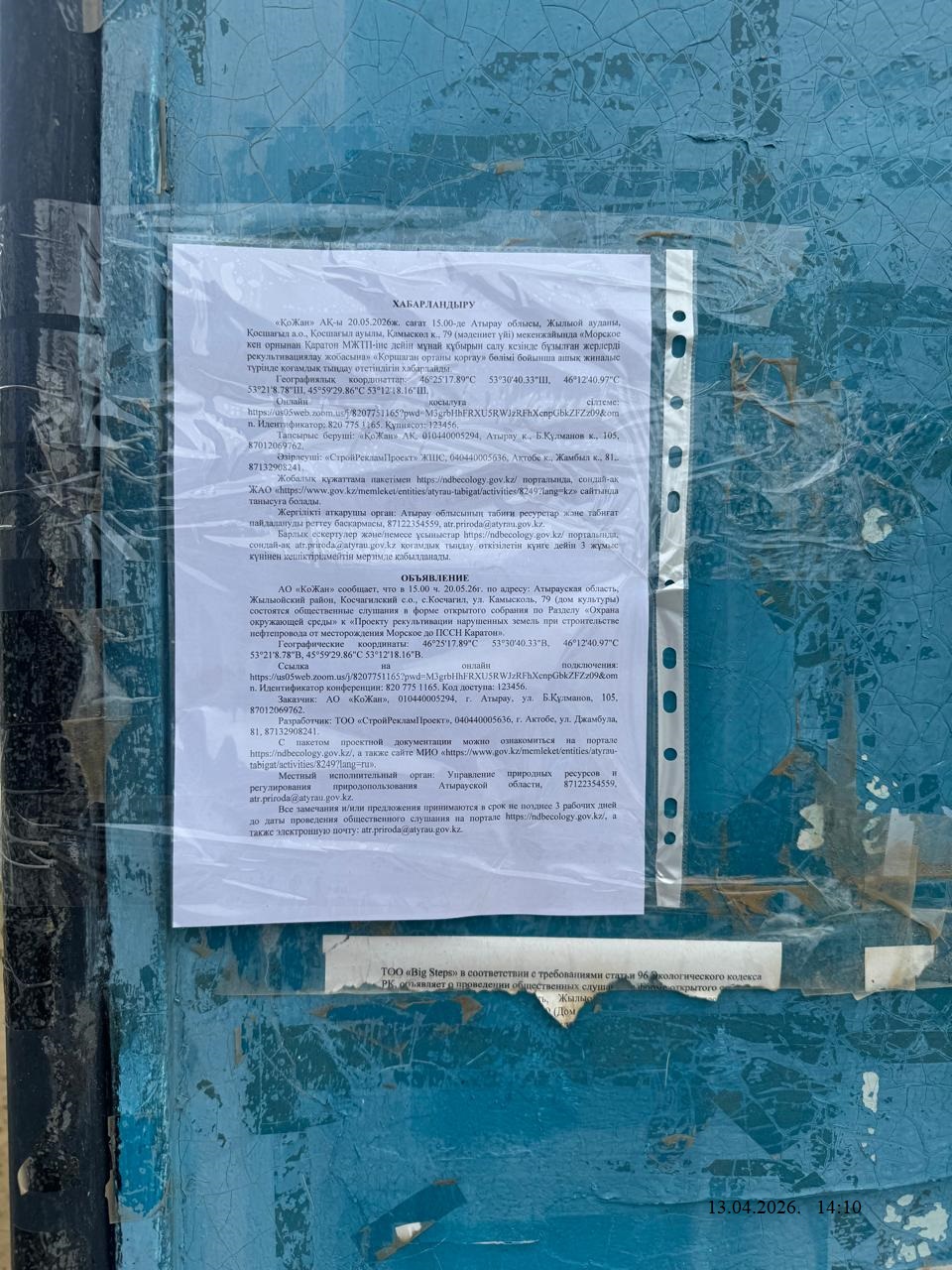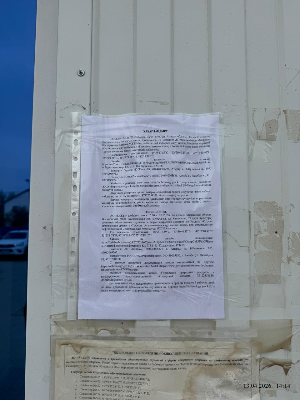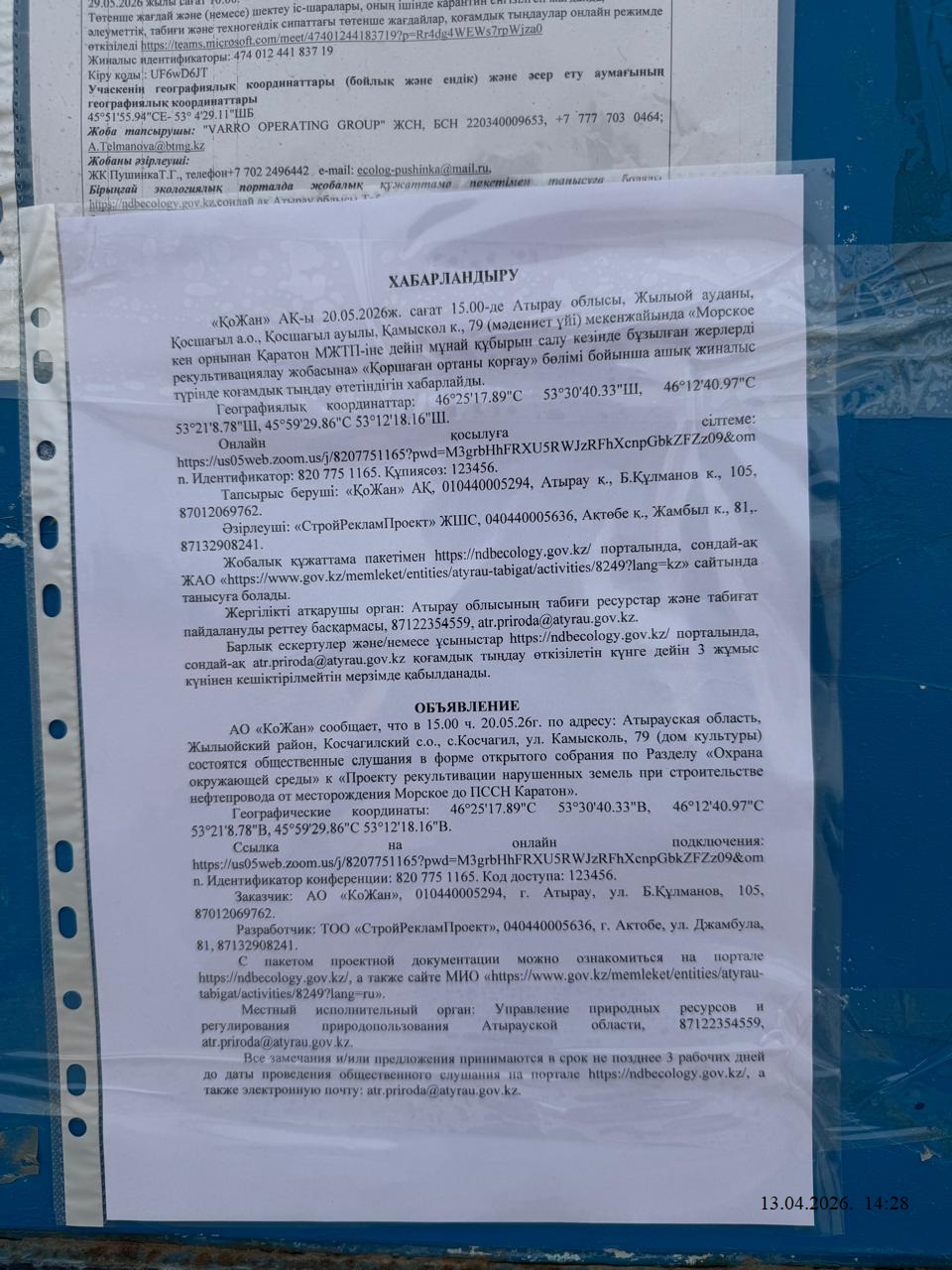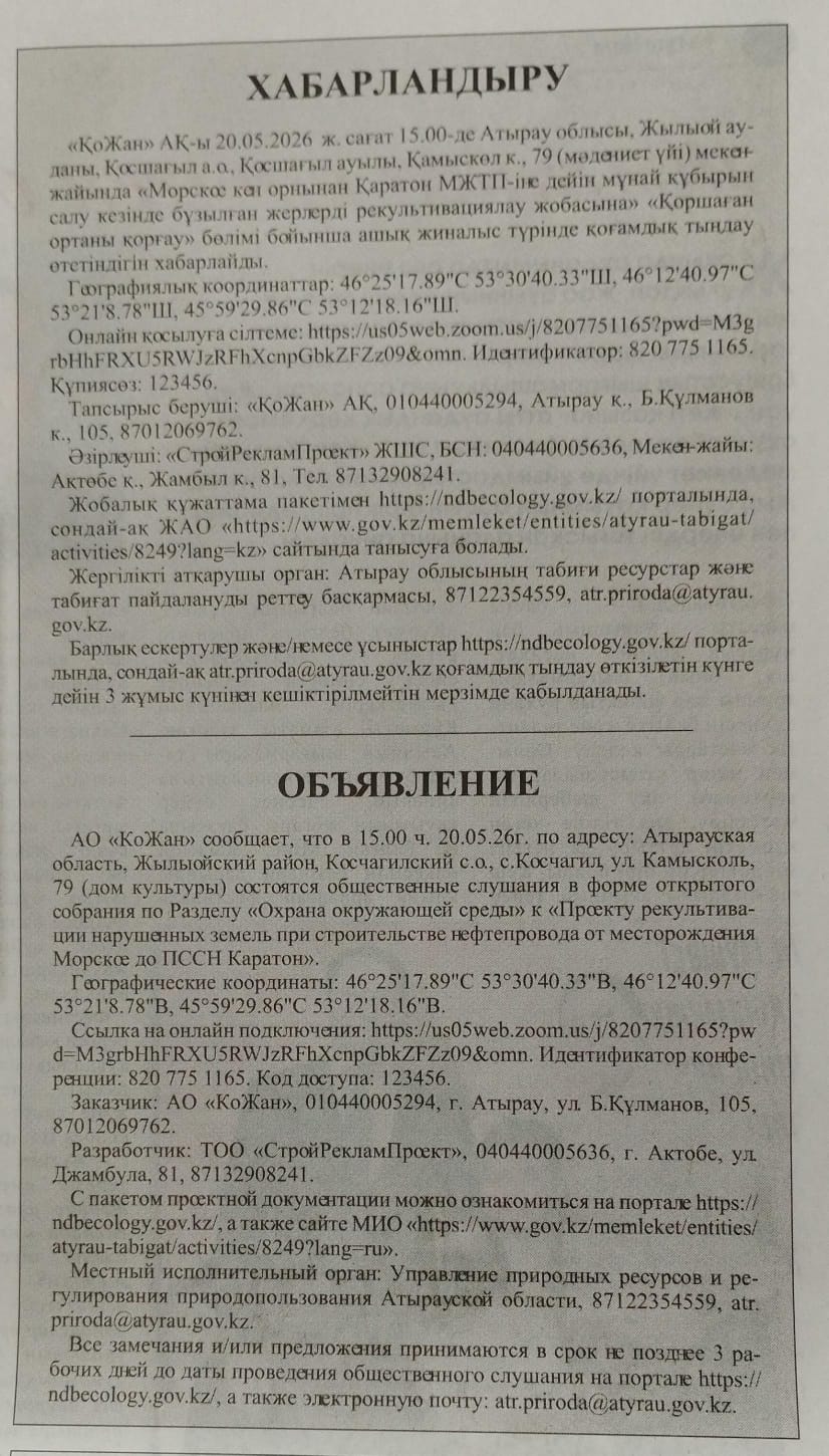 3. Общественные слушания организованны: Управление природных ресурсов и регулирования природопользования Атырауской области, atr.priroda@atyrau.gov.kz,