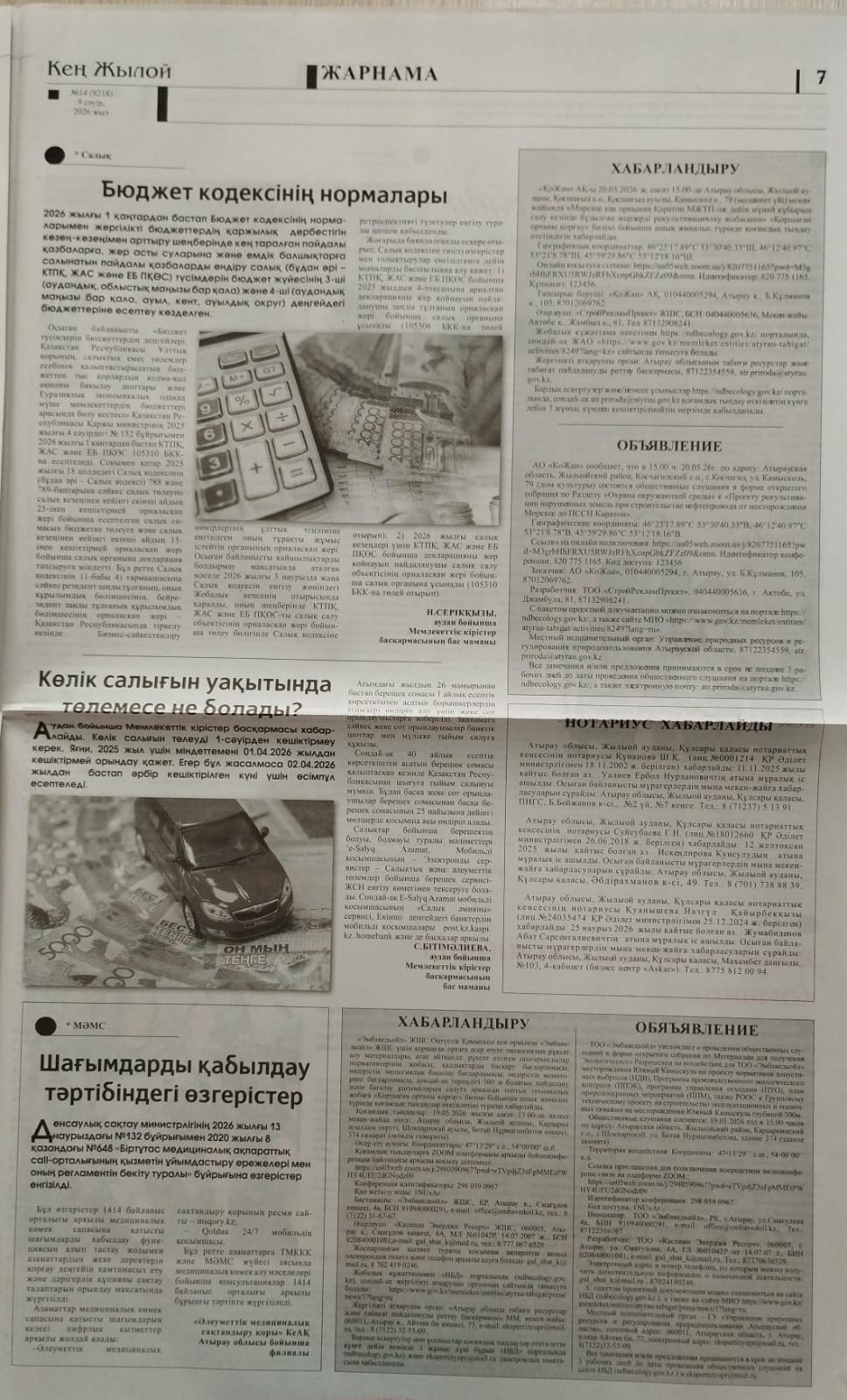 6.1. Наименование газеты, где будет размещено объявление: Атырау, Прикаспийская коммуна, Кең Жылой